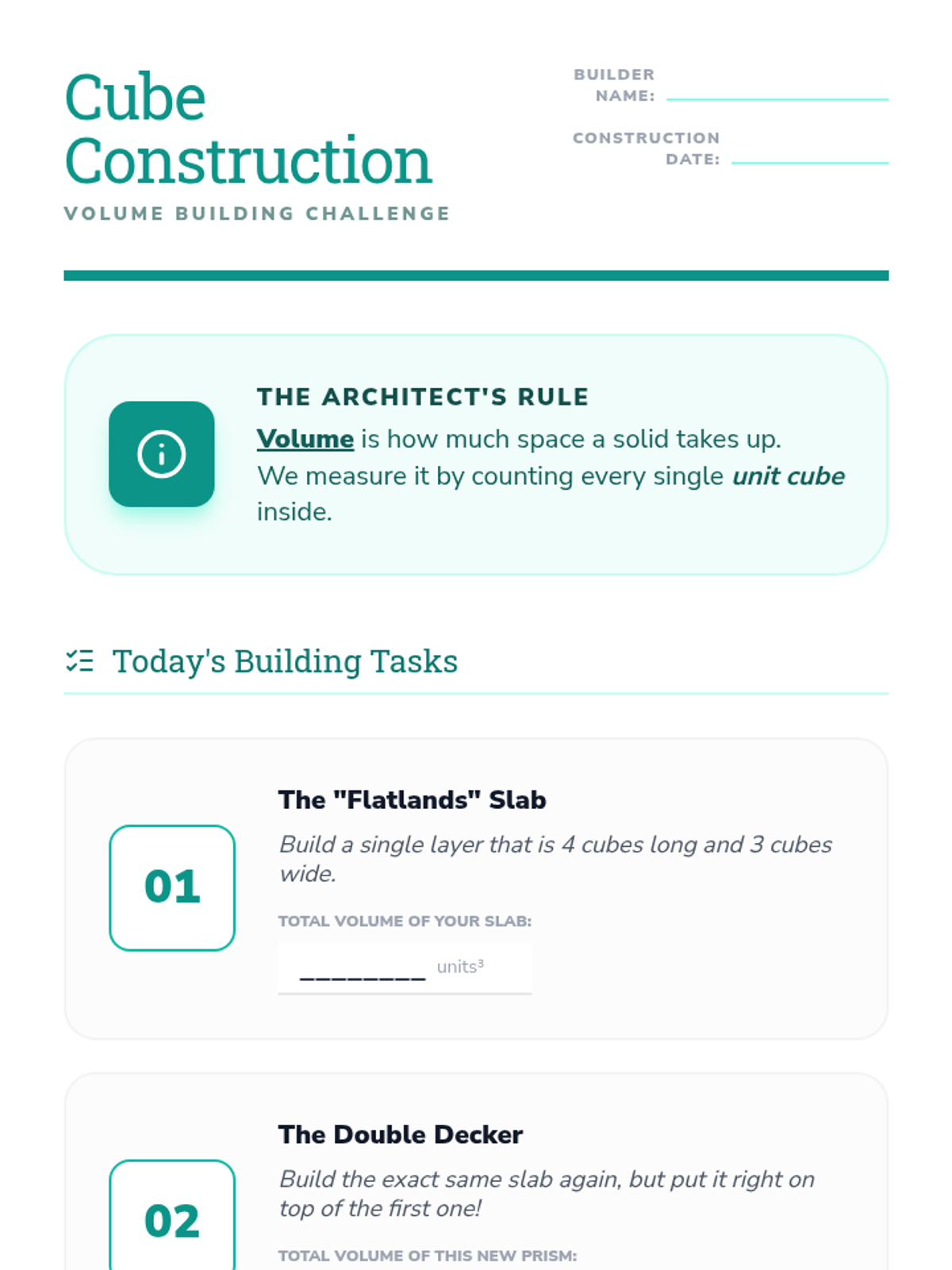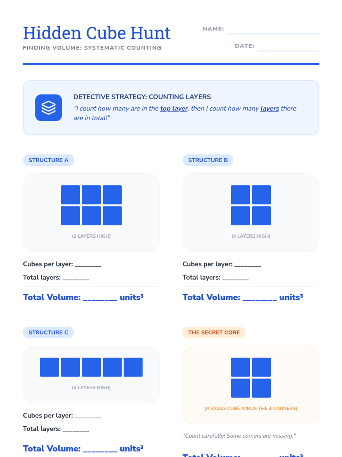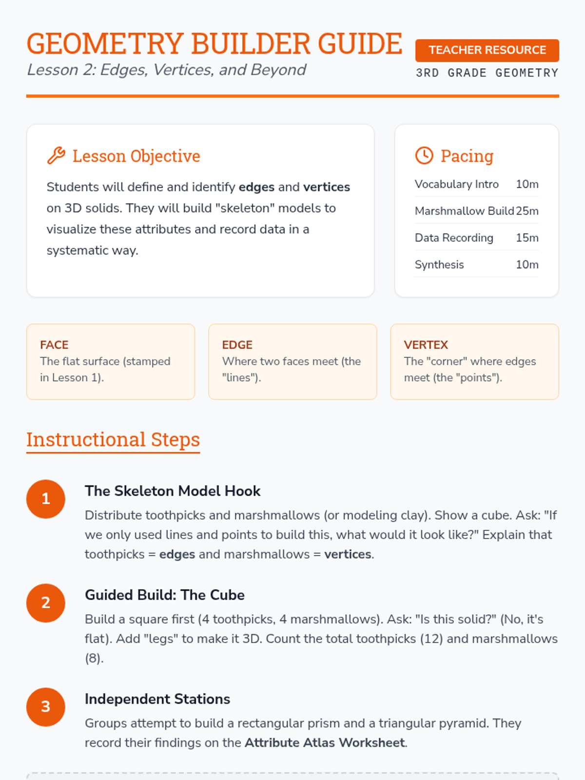 A foundational geometry sequence for 3rd graders exploring the transition from 2D shapes to 3D solids and introducing the concept of volume through unit cubes. Students build, count, and design with 3D figures to understand spatial attributes.