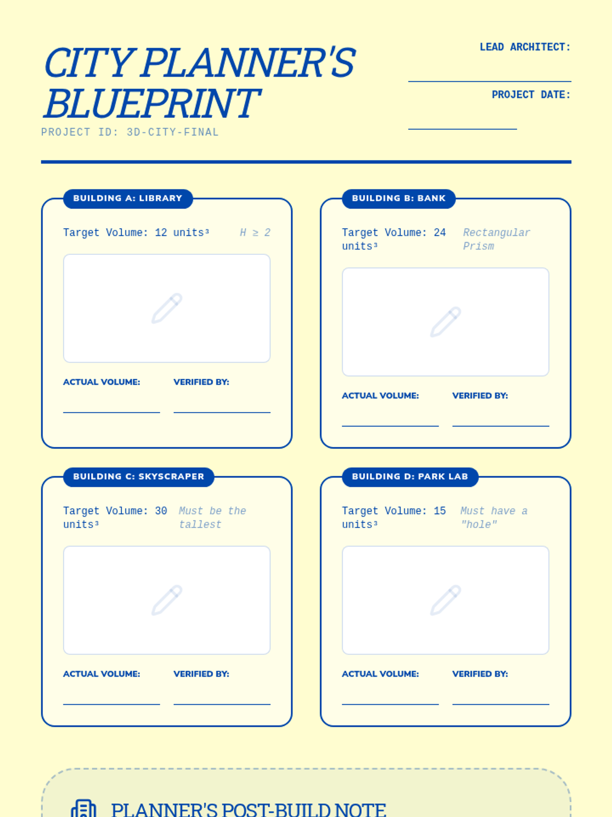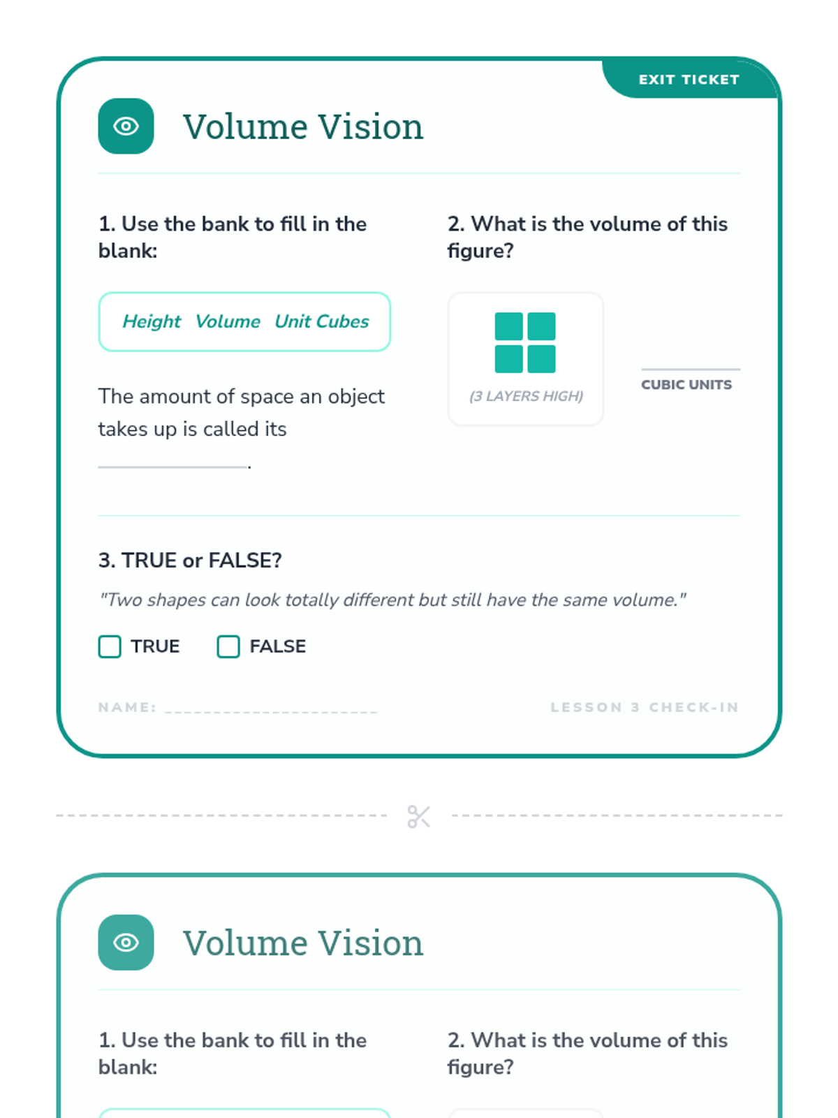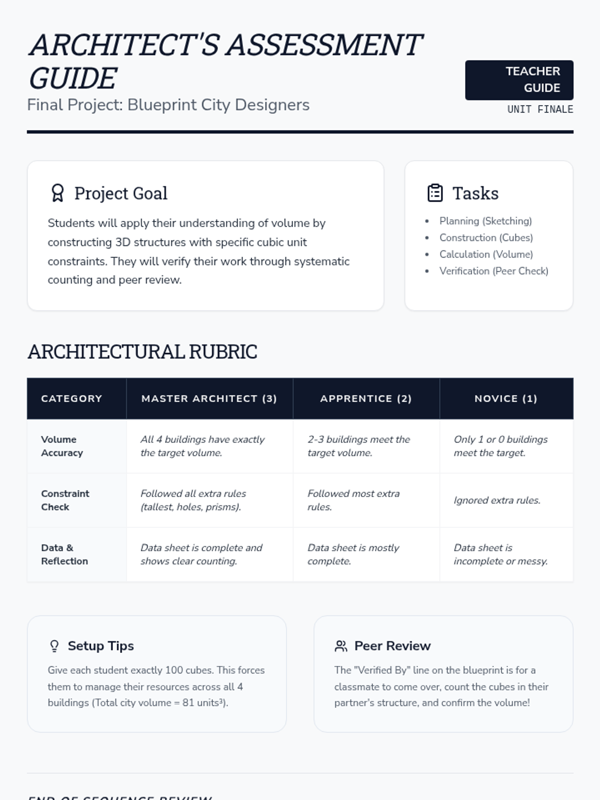 A foundational geometry sequence for 3rd graders exploring the transition from 2D shapes to 3D solids and introducing the concept of volume through unit cubes. Students build, count, and design with 3D figures to understand spatial attributes.