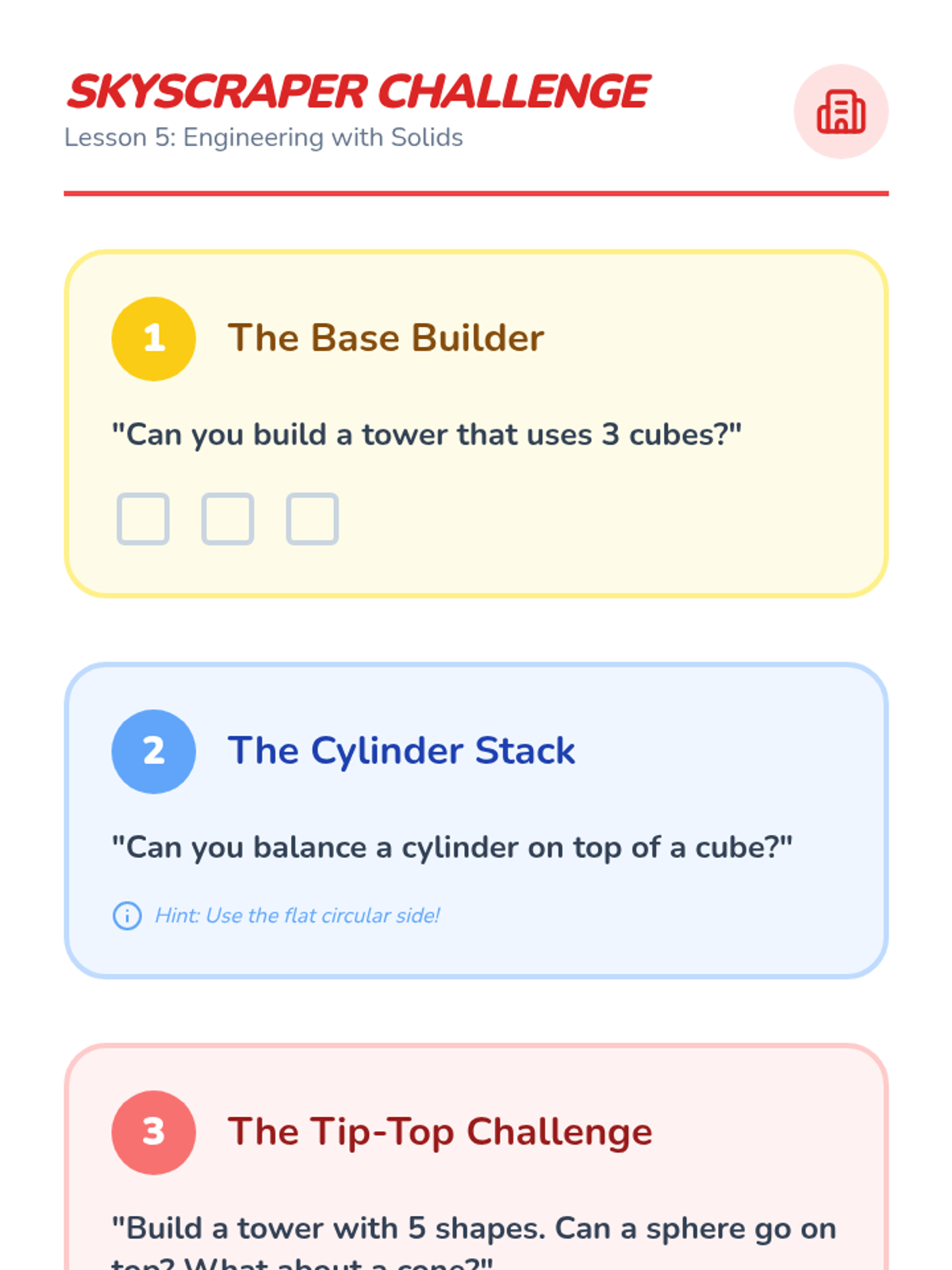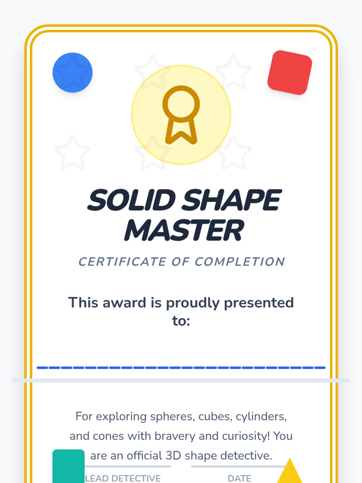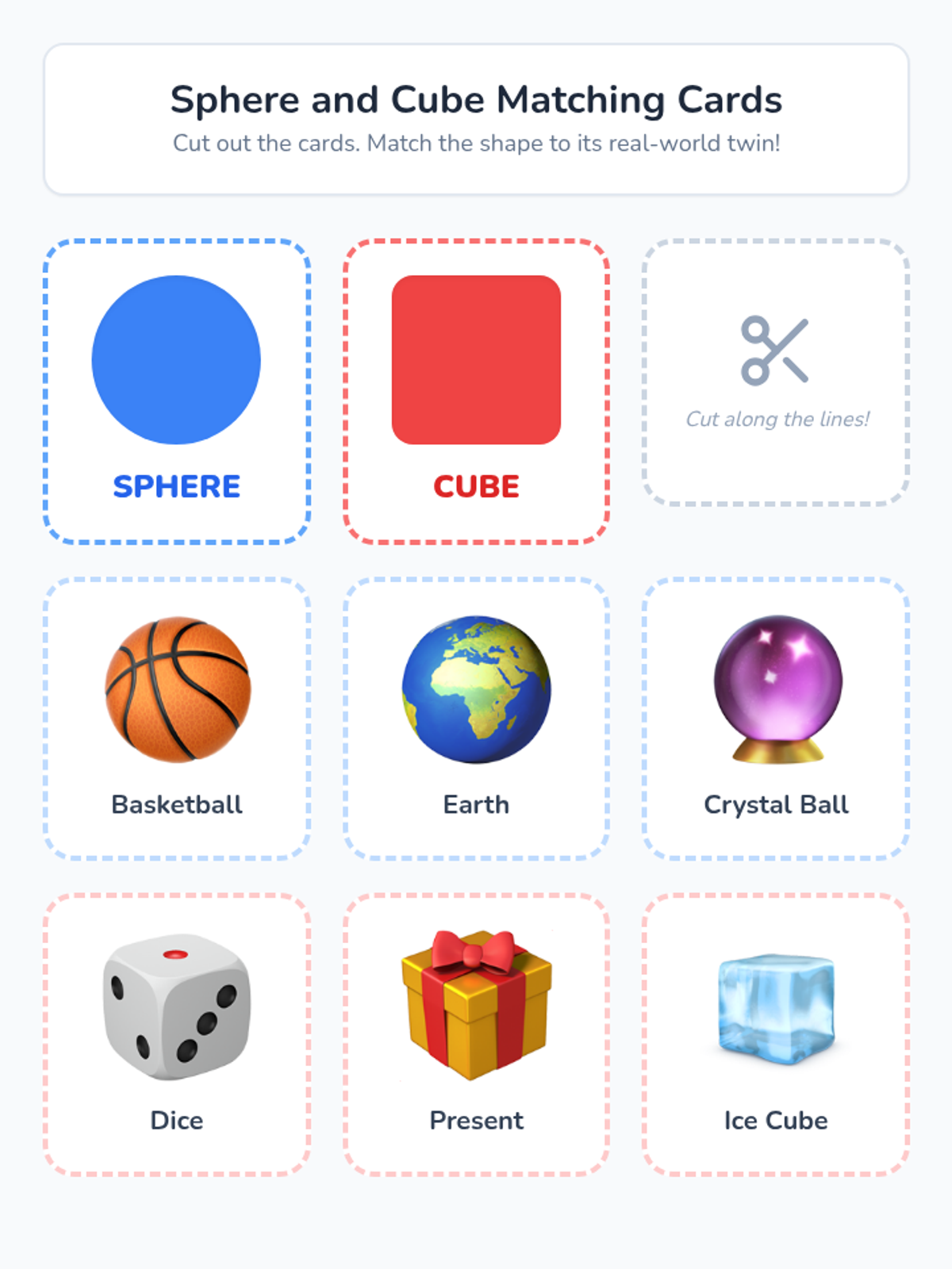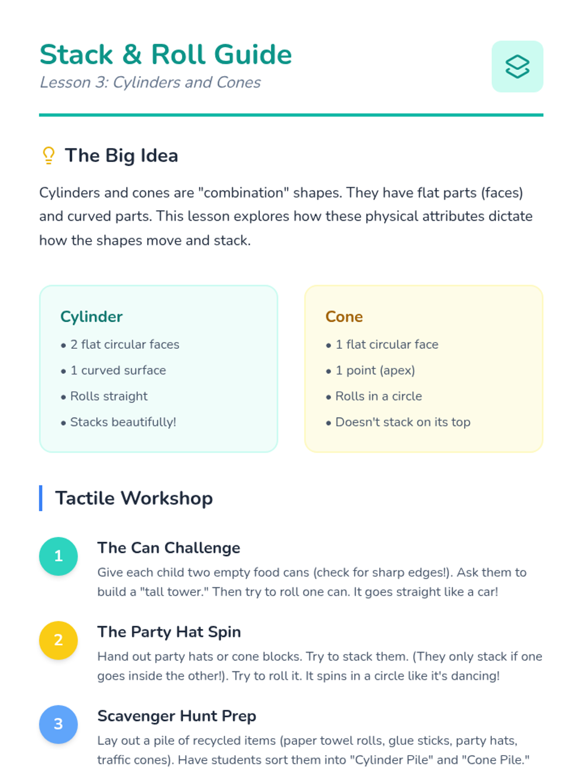 A hands-on introduction to three-dimensional solids for Pre-K students. Children explore spheres, cubes, cylinders, and cones through tactile play, movement, and real-world observation to understand volume and basic physical properties.