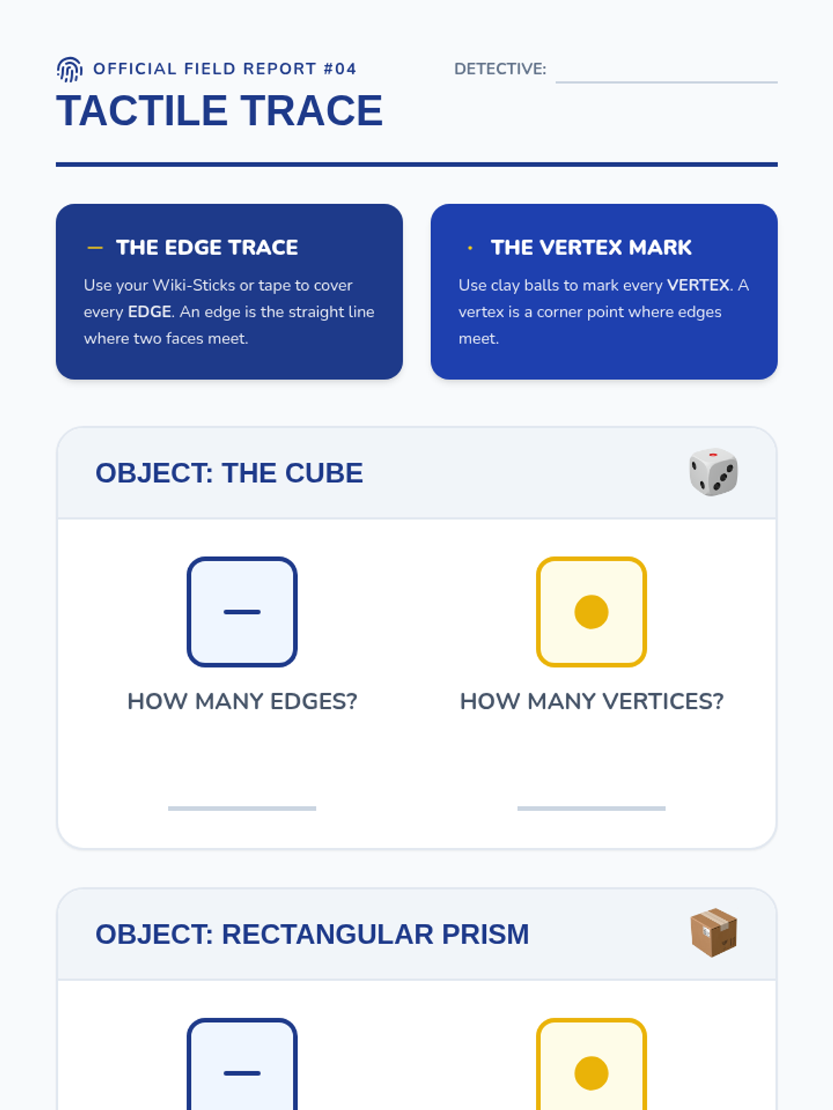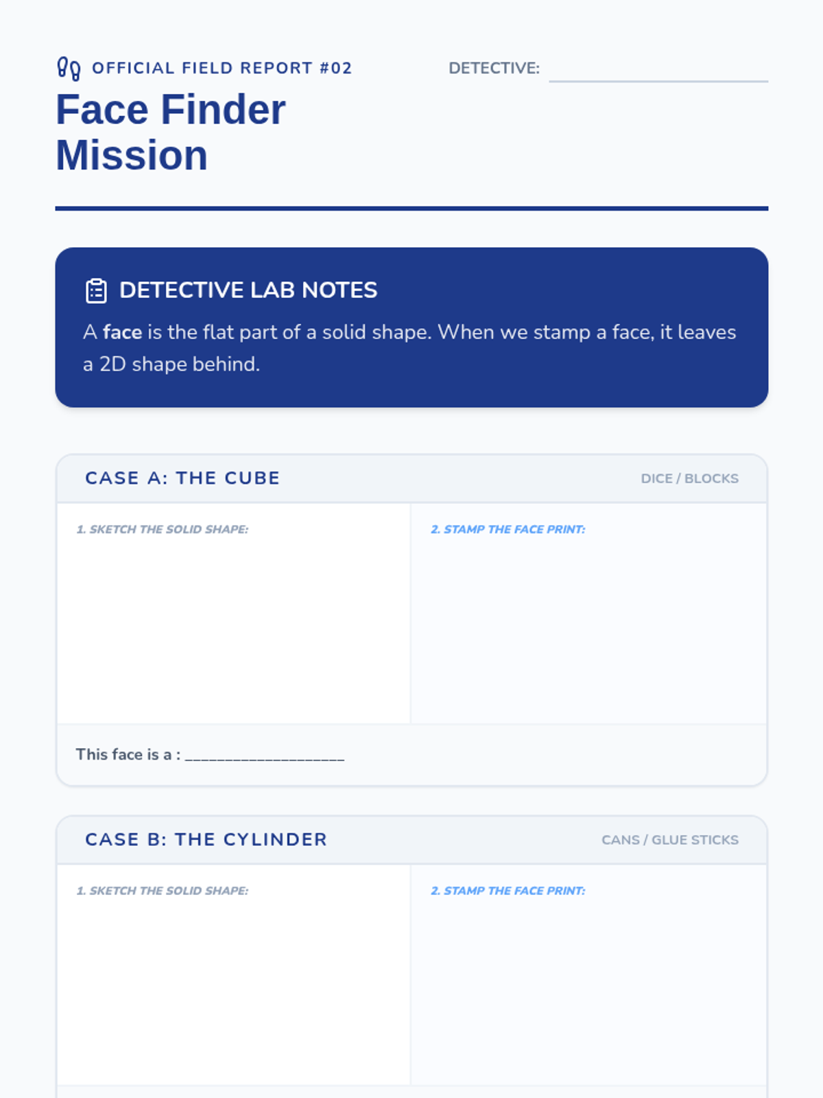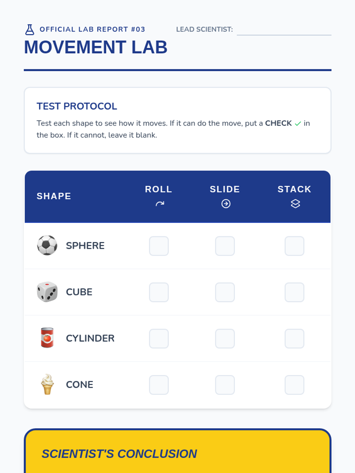 A 1st-grade geometry sequence exploring three-dimensional solids. Students learn to identify, describe, and differentiate 3D shapes through hands-on exploration of faces, edges, vertices, and physical properties like rolling and stacking.
