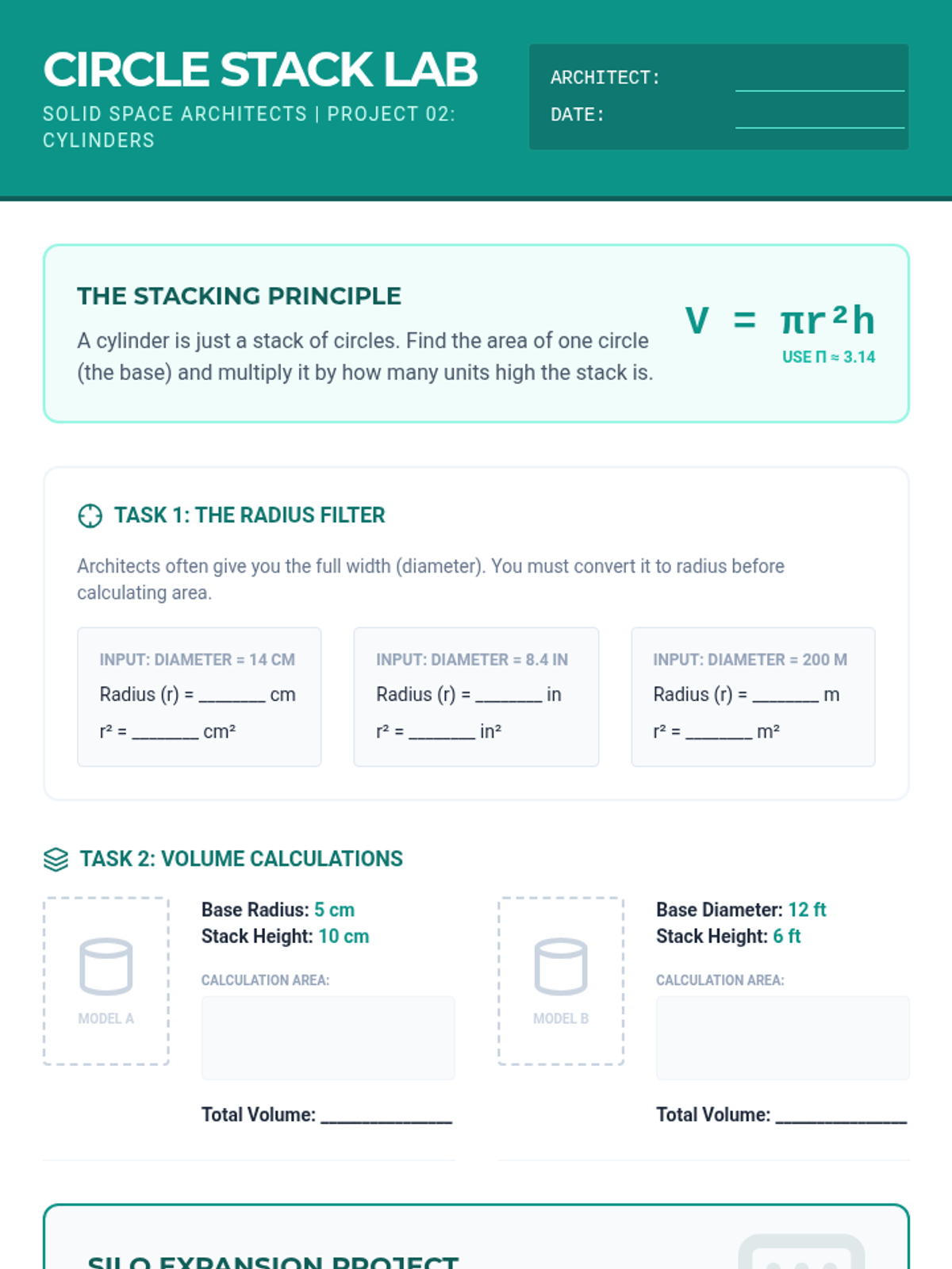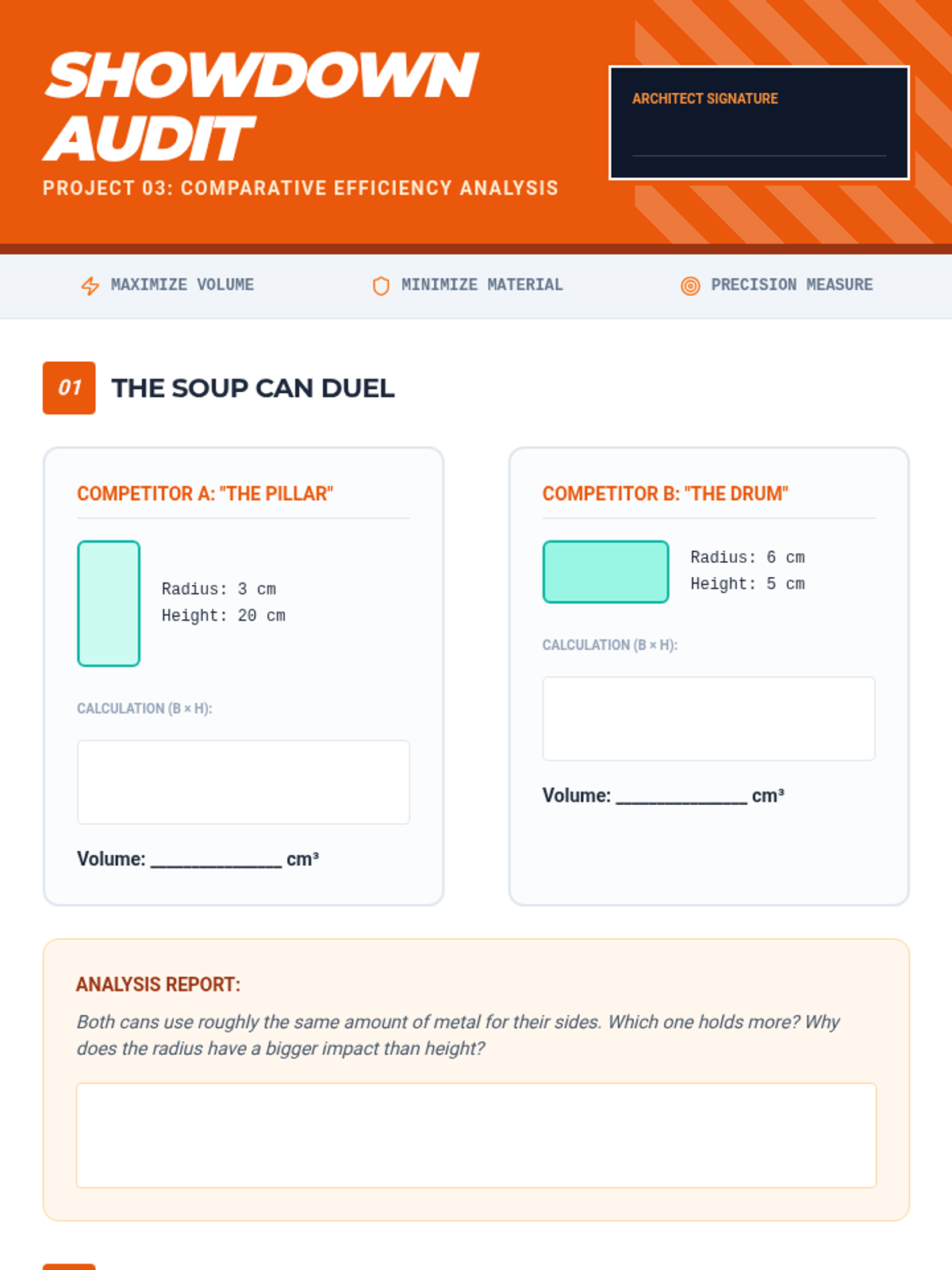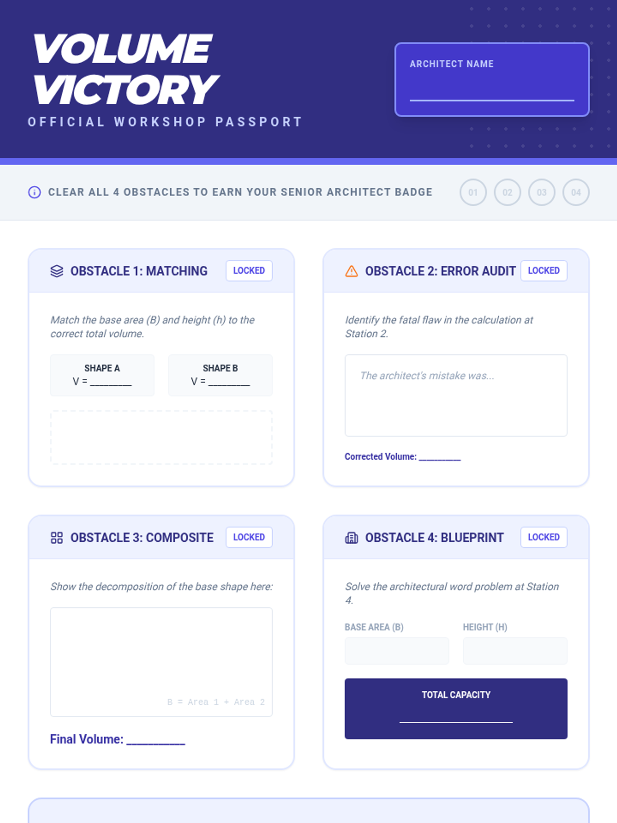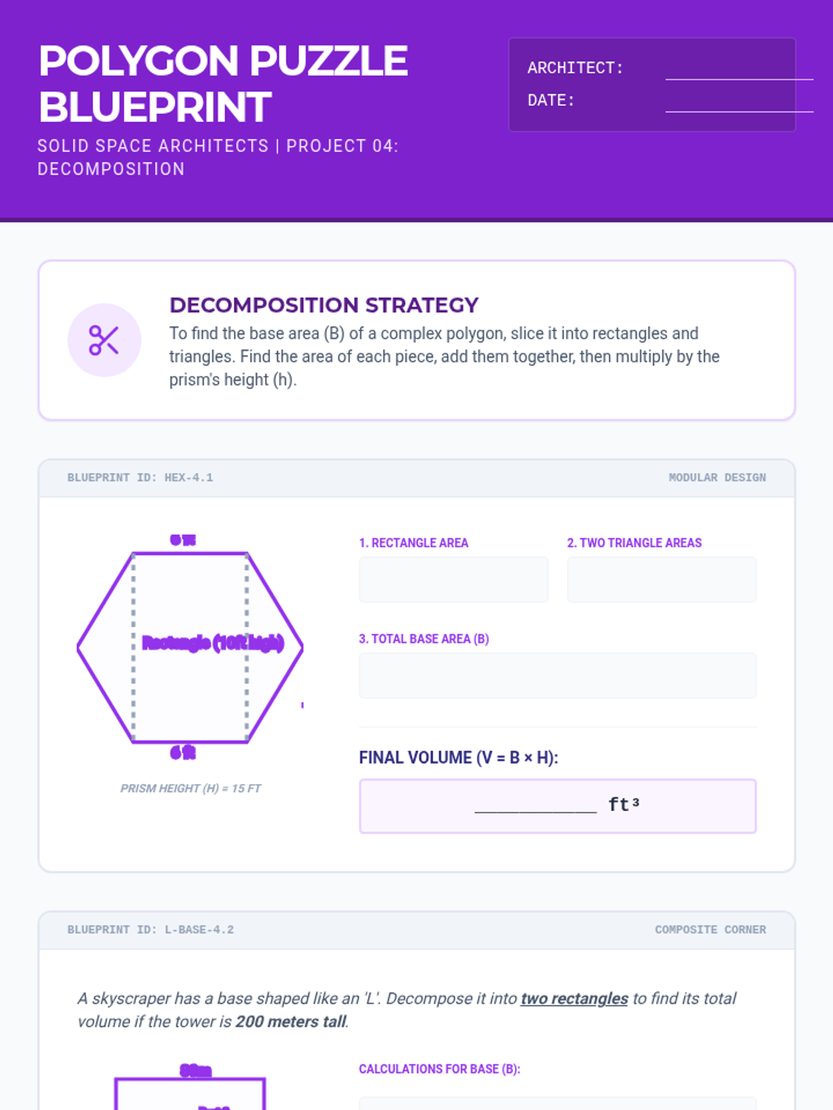 Students become 'Solid Space Architects' as they generalize the volume formula V=Bh to various prisms and cylinders. They move from simple rectangles to triangles, circles, and complex polygons, exploring efficiency and real-world applications of 3D geometry.