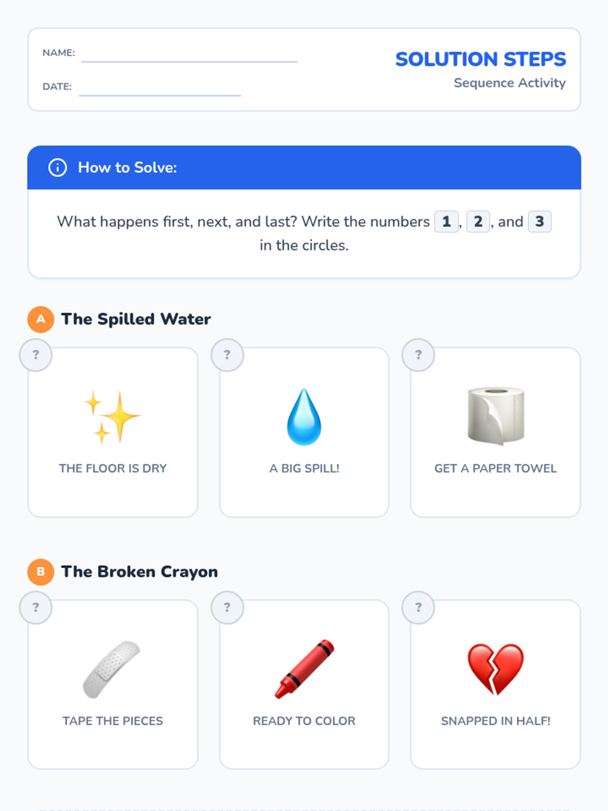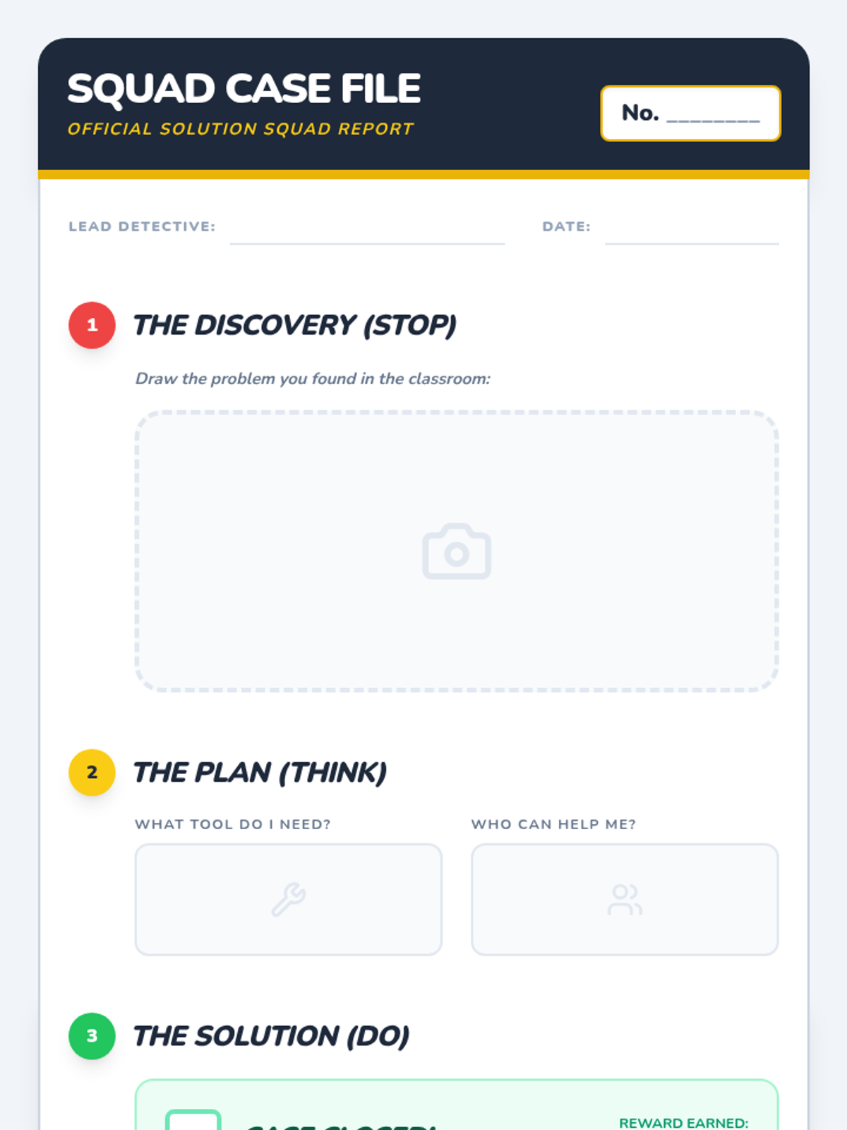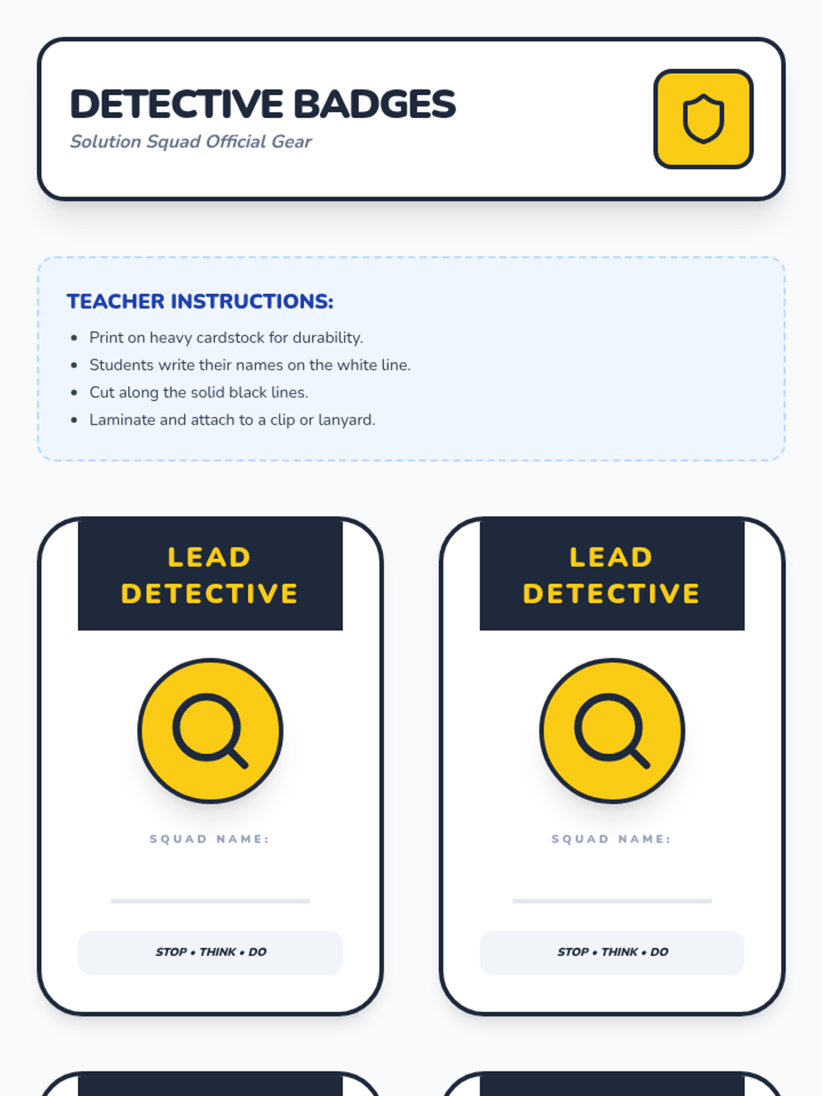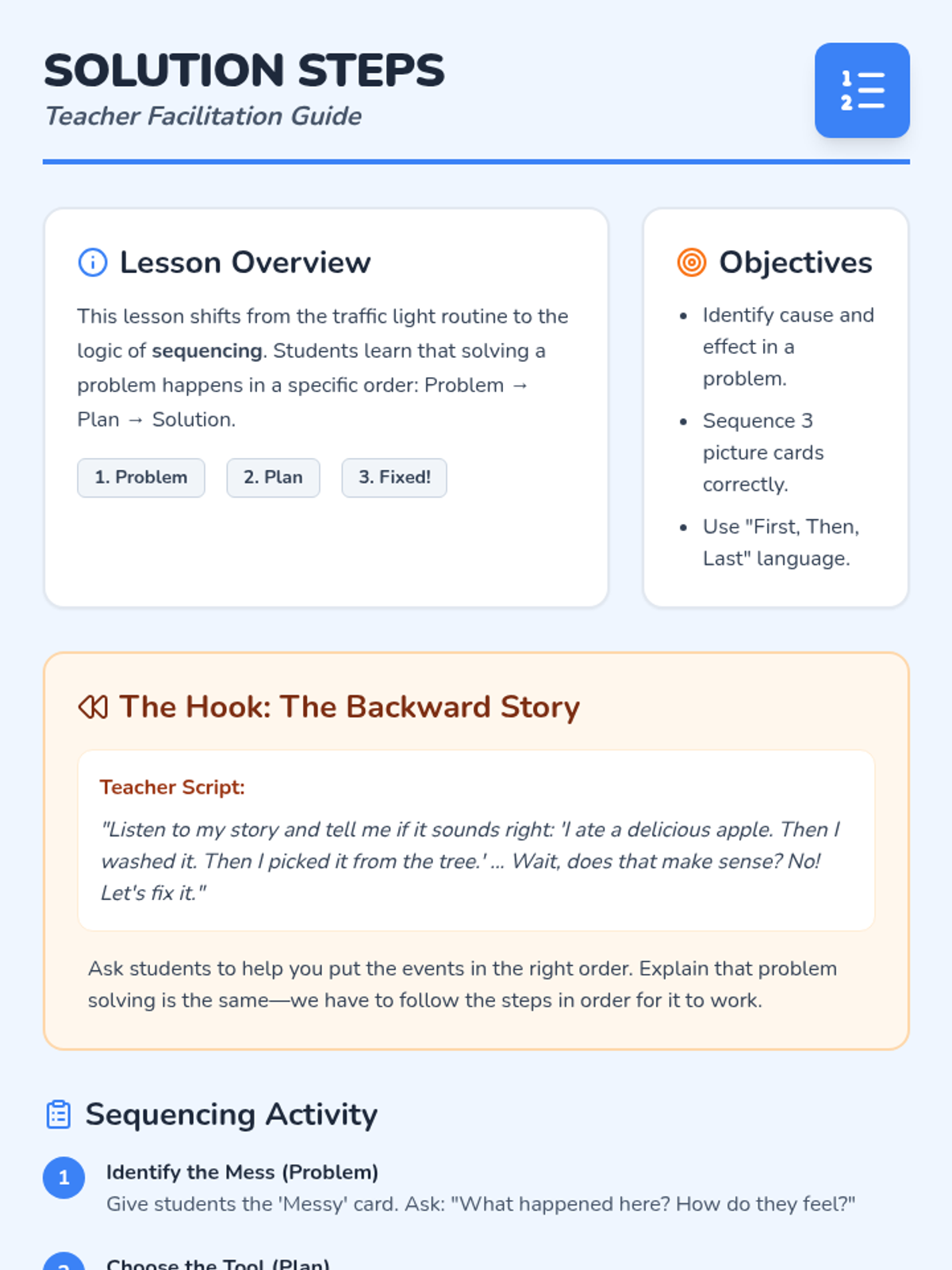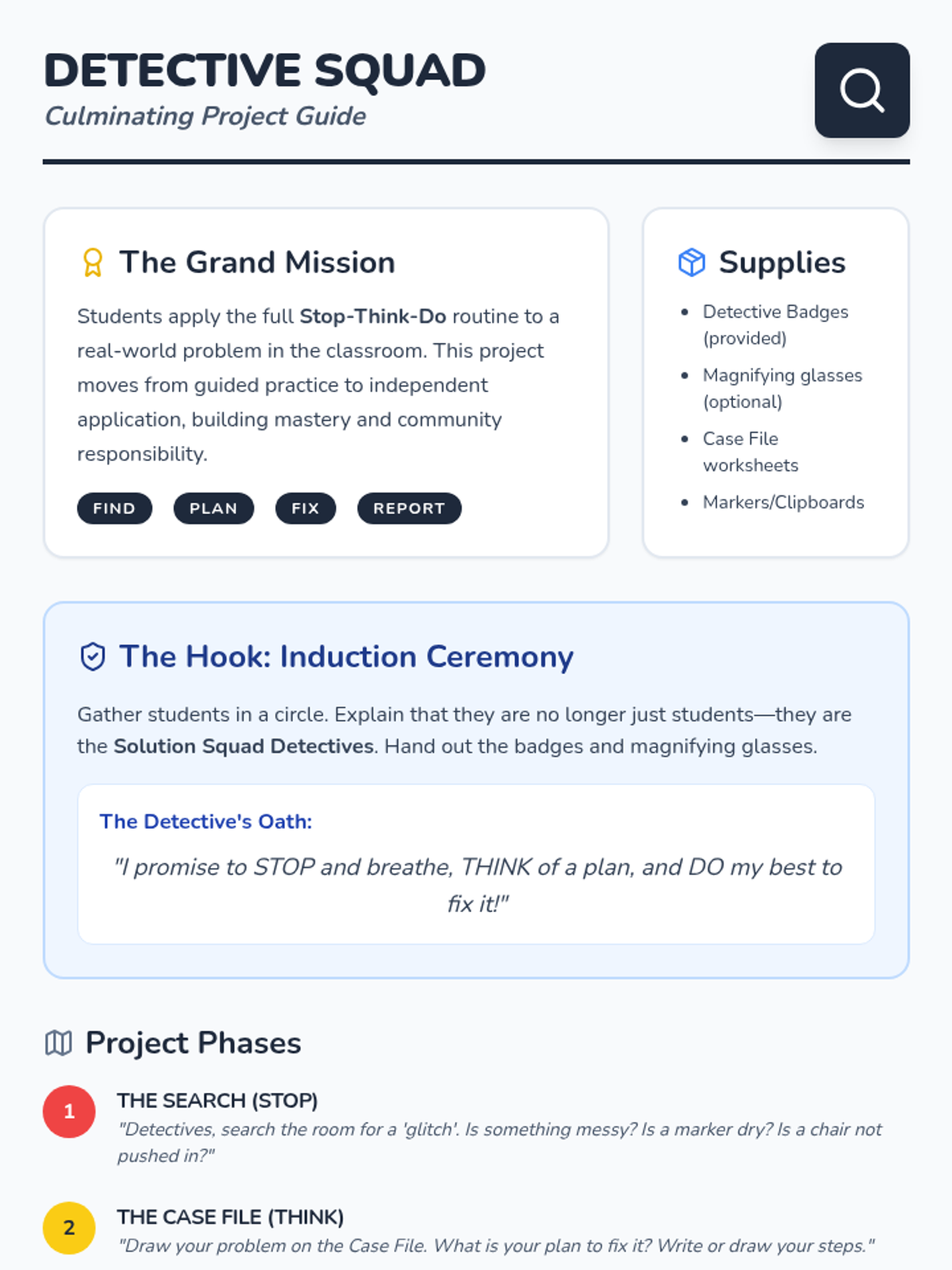 A Kindergarten sequence focused on teaching students a structured problem-solving routine (Stop, Think, Do) and applying it to multi-step challenges through games, sequencing activities, and a final detective project.