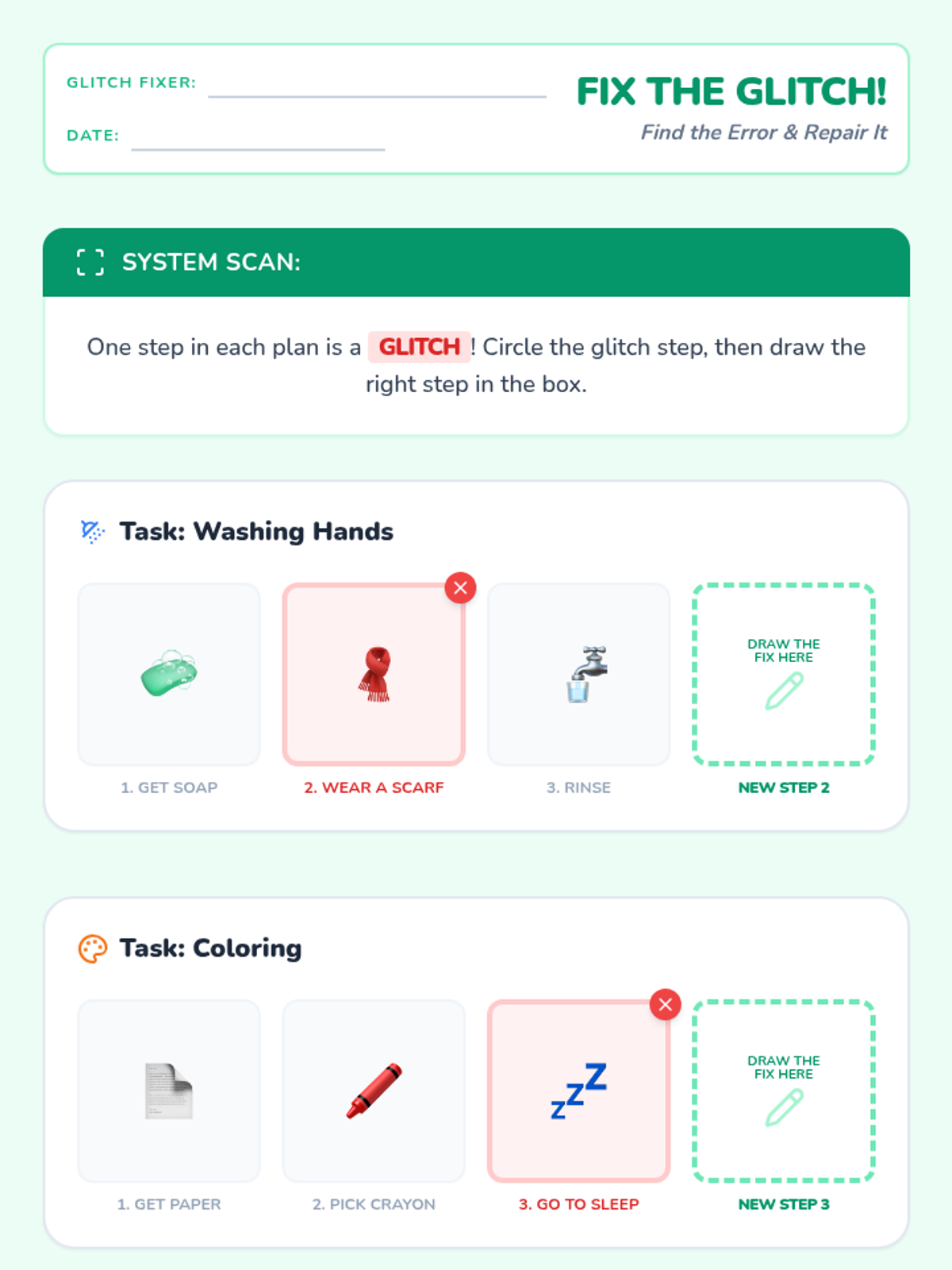 A 5-lesson series designed for a kindergarten student to understand the importance of school attendance, healthy habits, asking for help, and home routines. The sequence uses visual support and engaging activities to build school readiness.