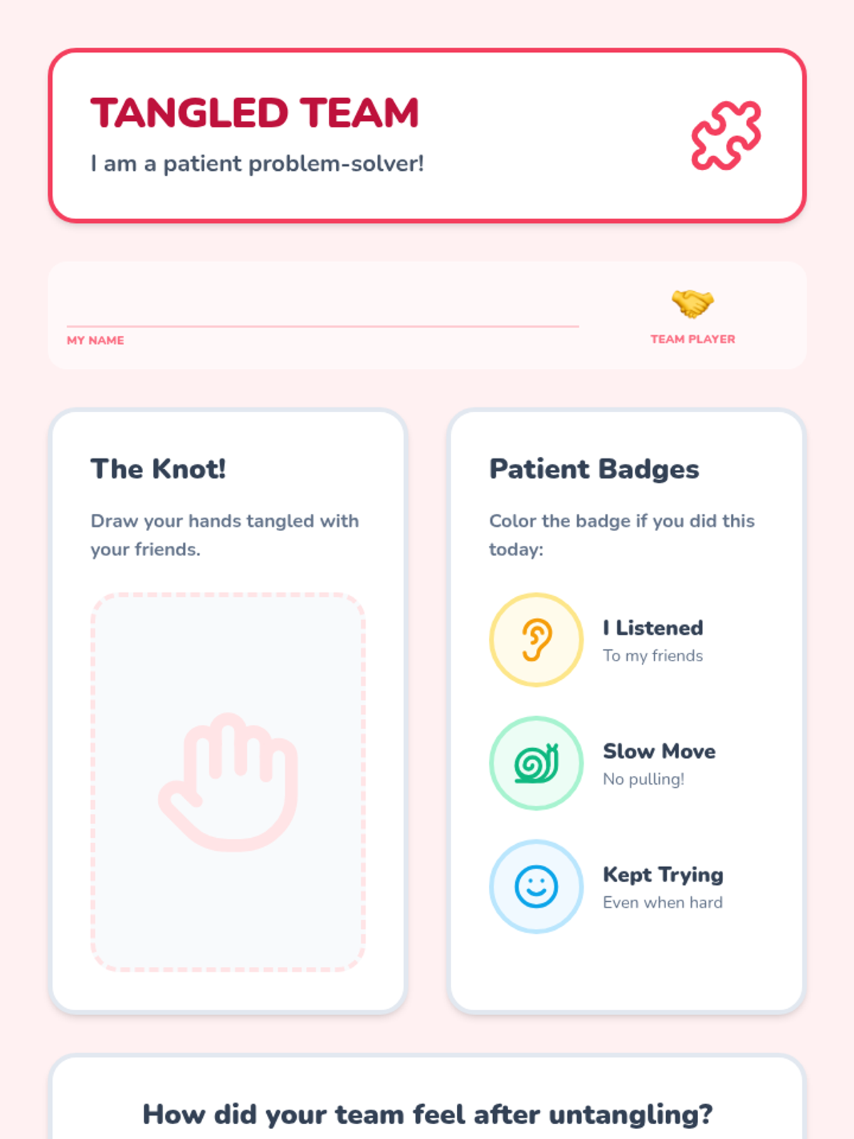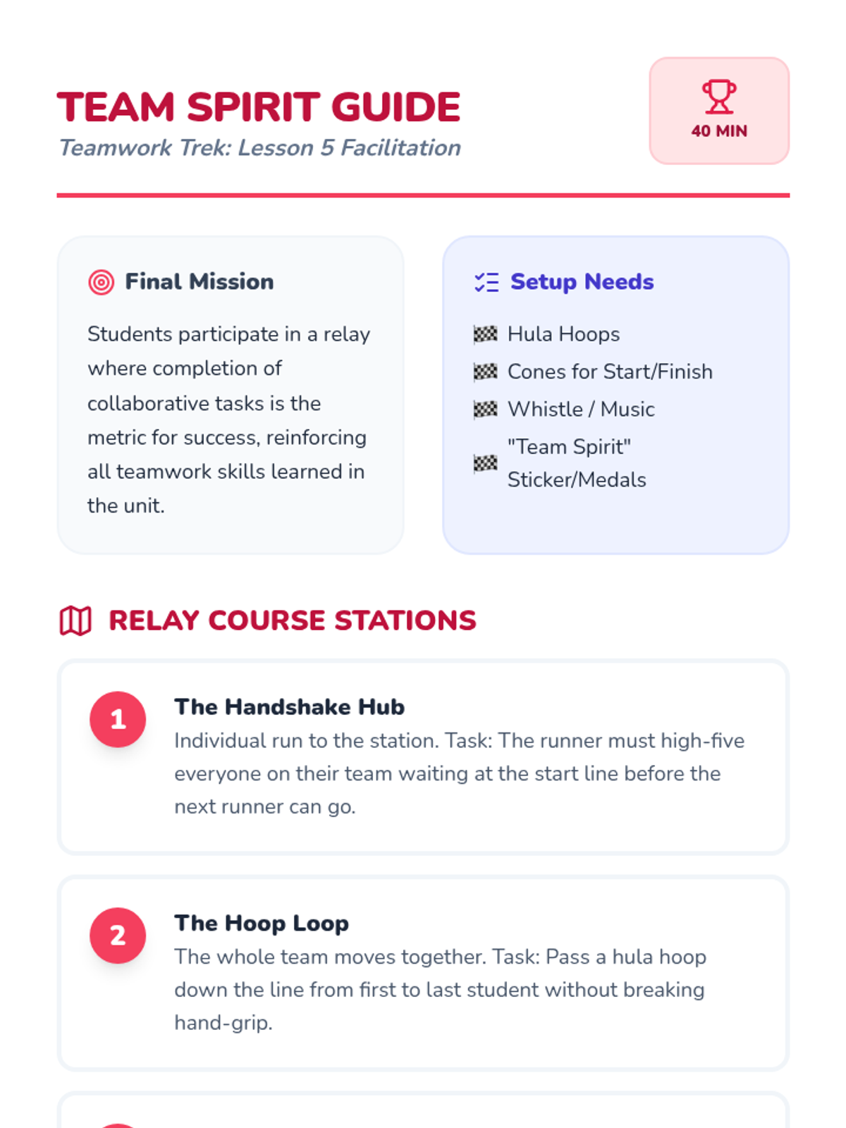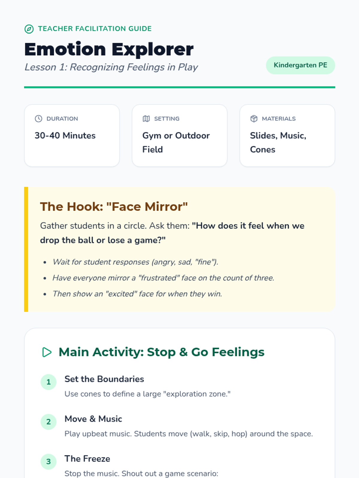 A Kindergarten Physical Education sequence focused on social-emotional skills through team building. Students learn to recognize emotions, offer encouragement, help peers in games, and celebrate together to build a supportive classroom culture.