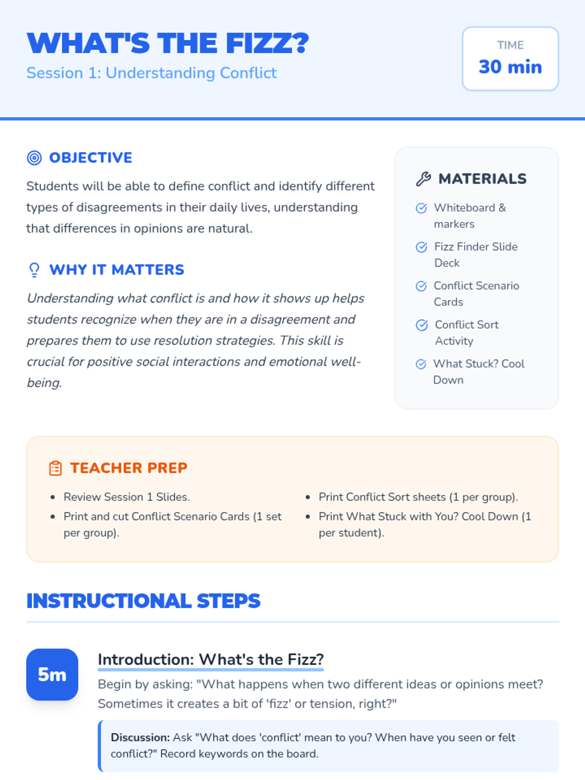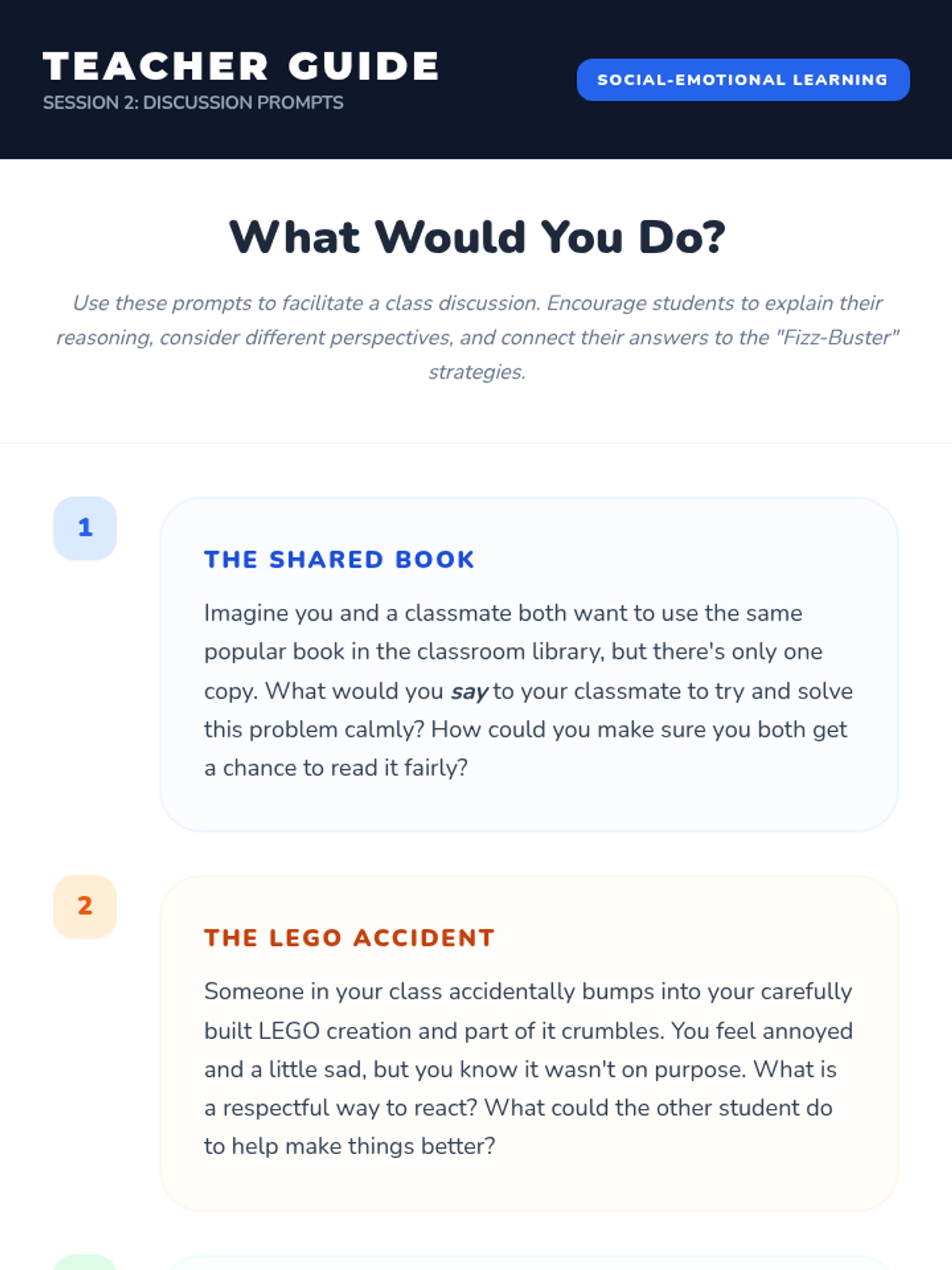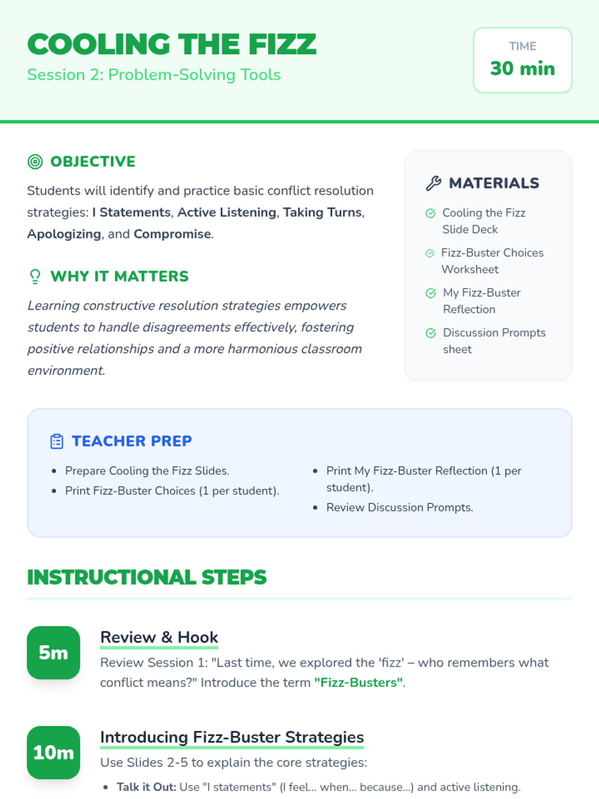 A four-session social-emotional learning sequence for 3rd graders on navigating disagreements, resolving conflicts with 'Fizz-Buster' strategies, and practicing mutual respect.