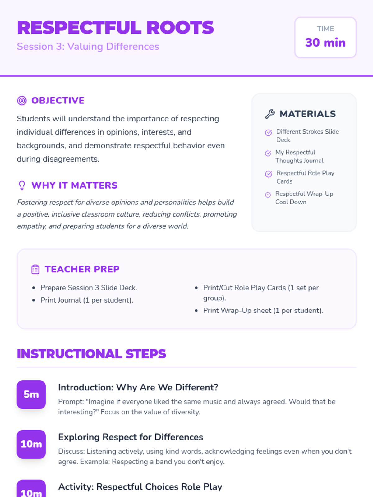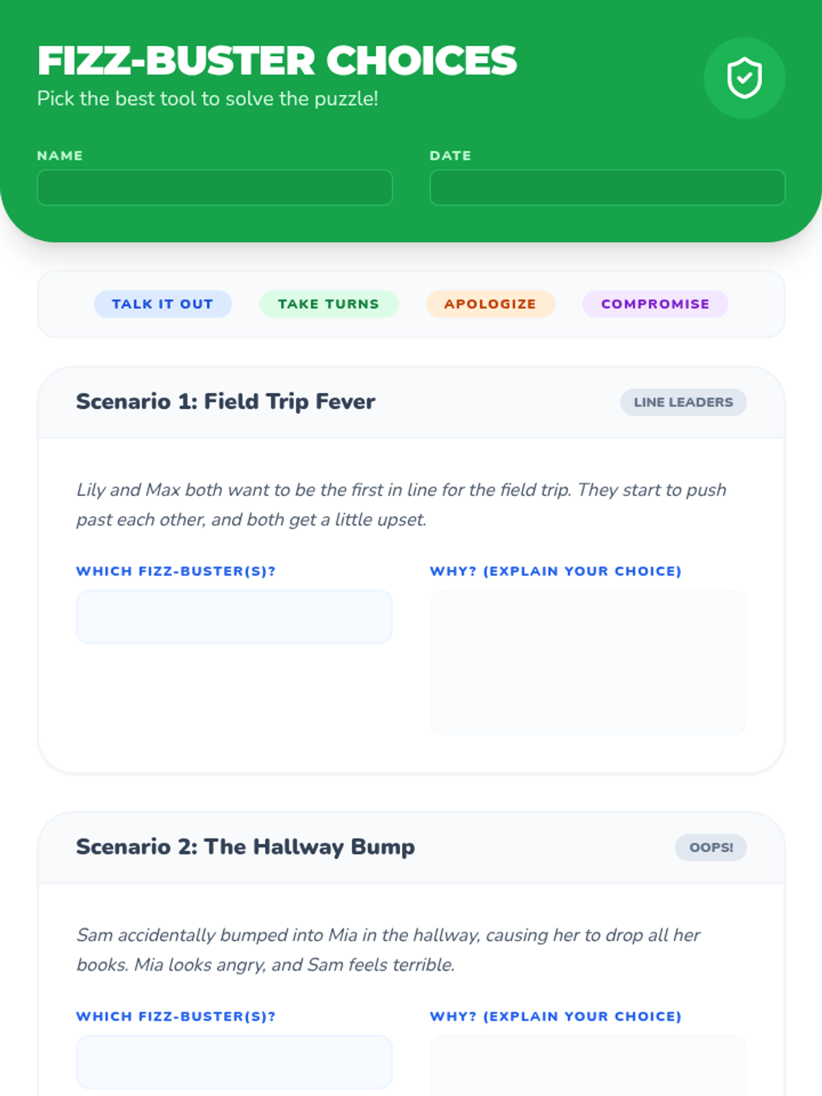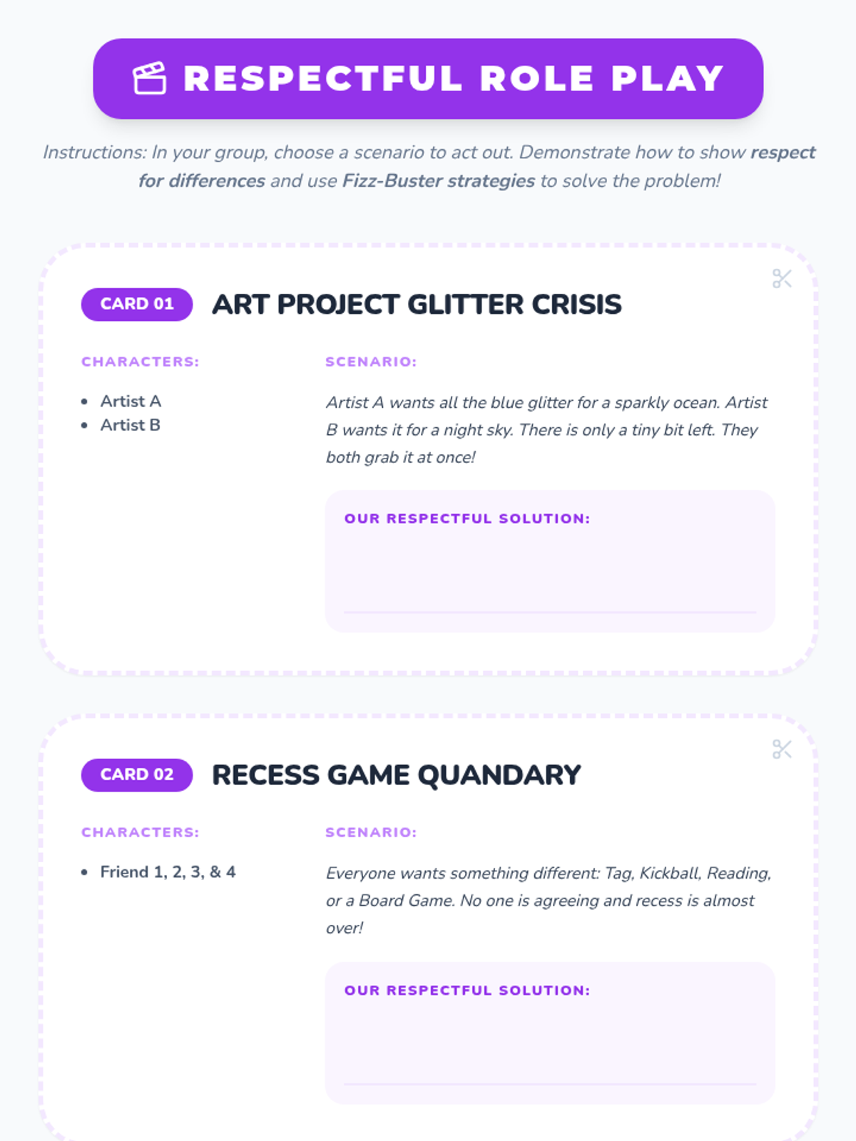 A four-session social-emotional learning sequence for 3rd graders on navigating disagreements, resolving conflicts with 'Fizz-Buster' strategies, and practicing mutual respect.