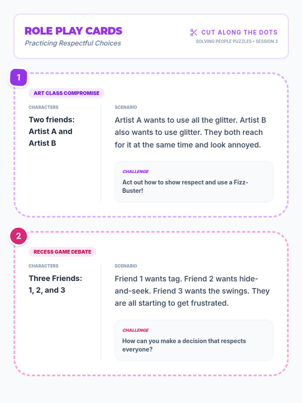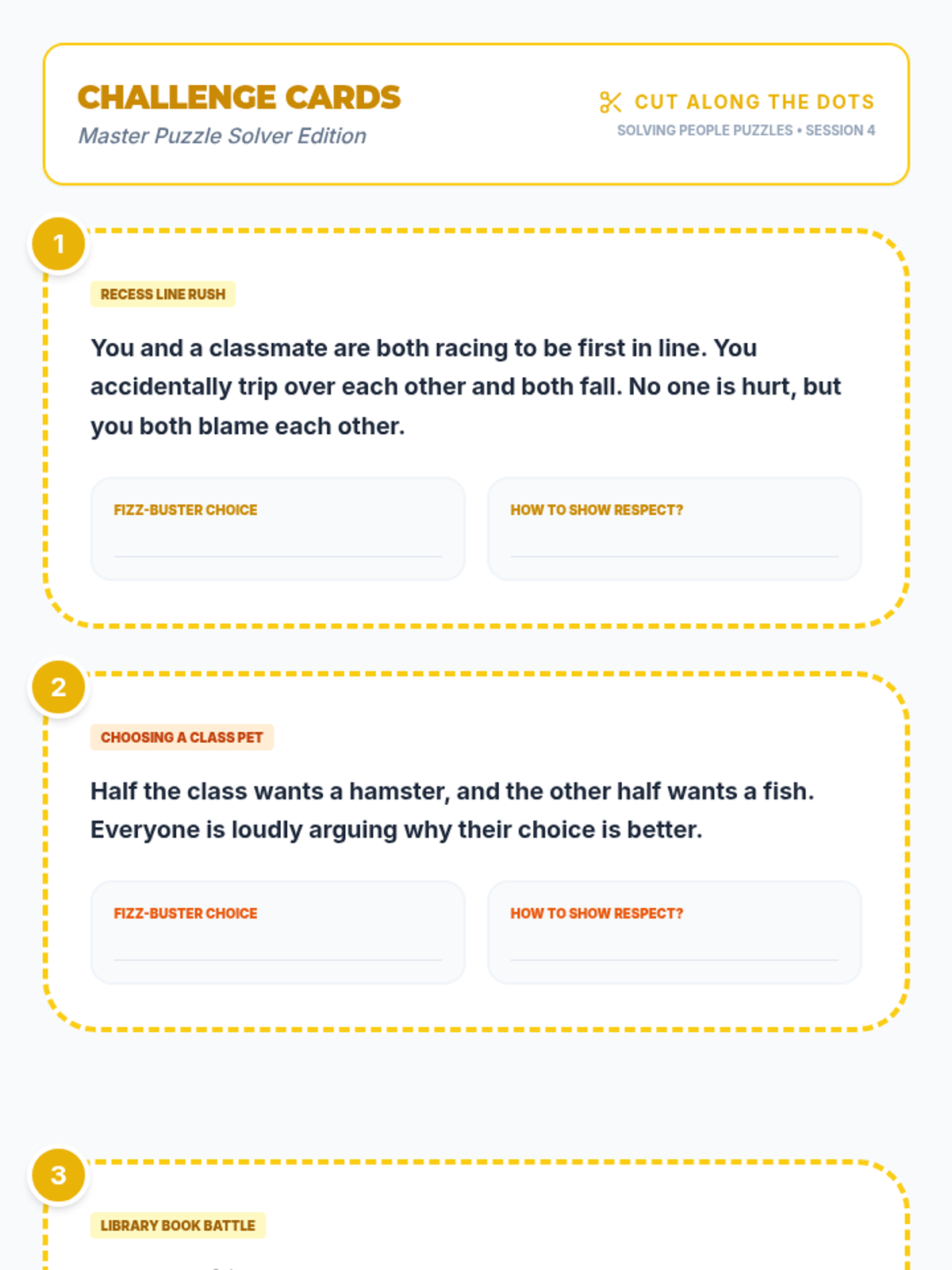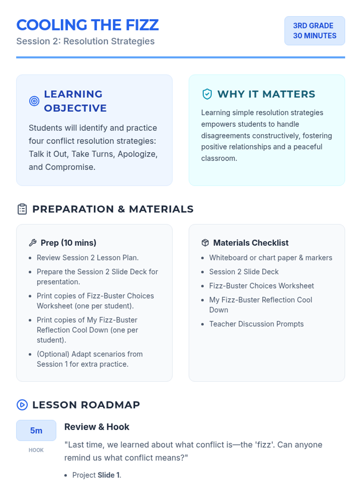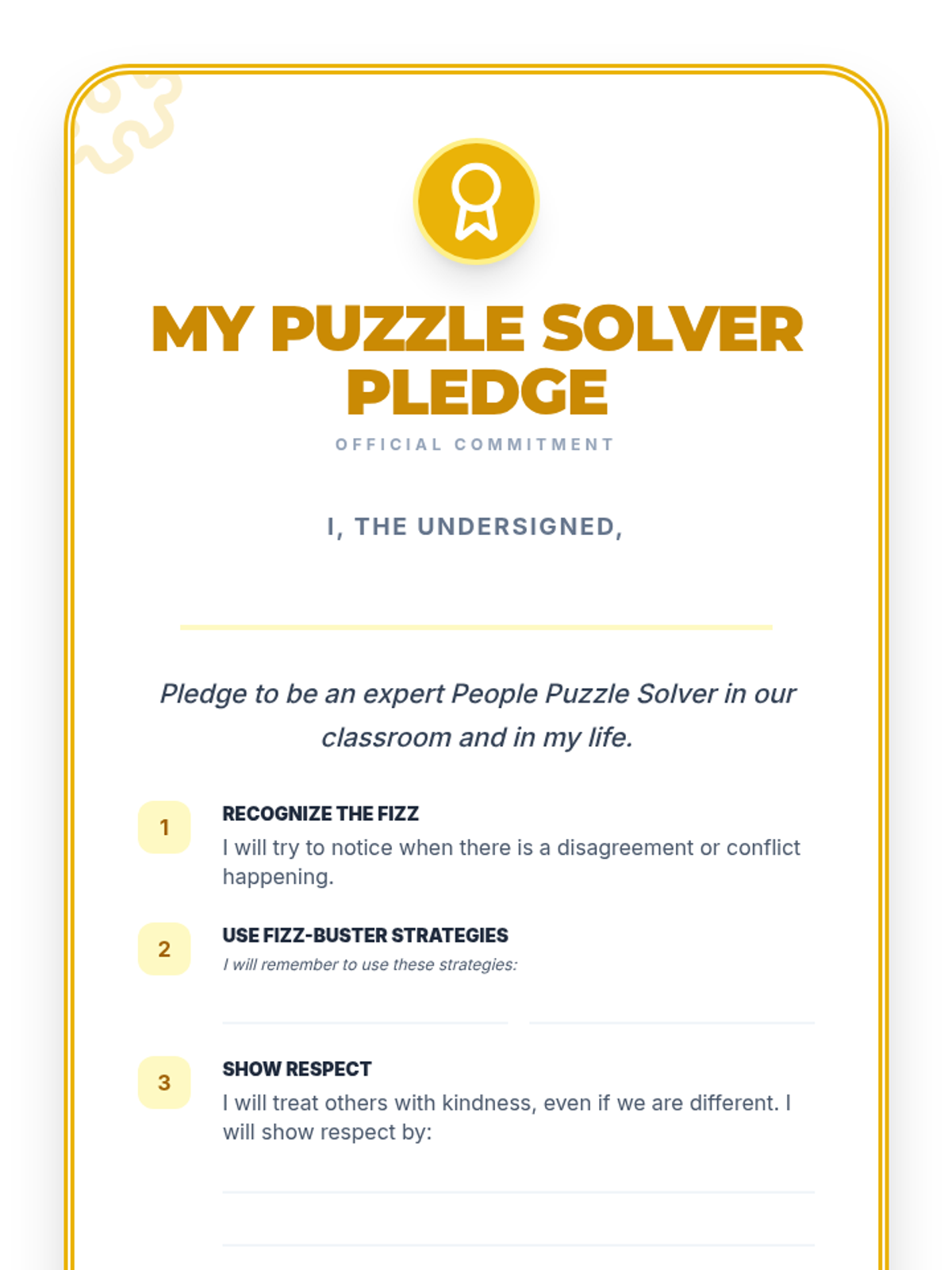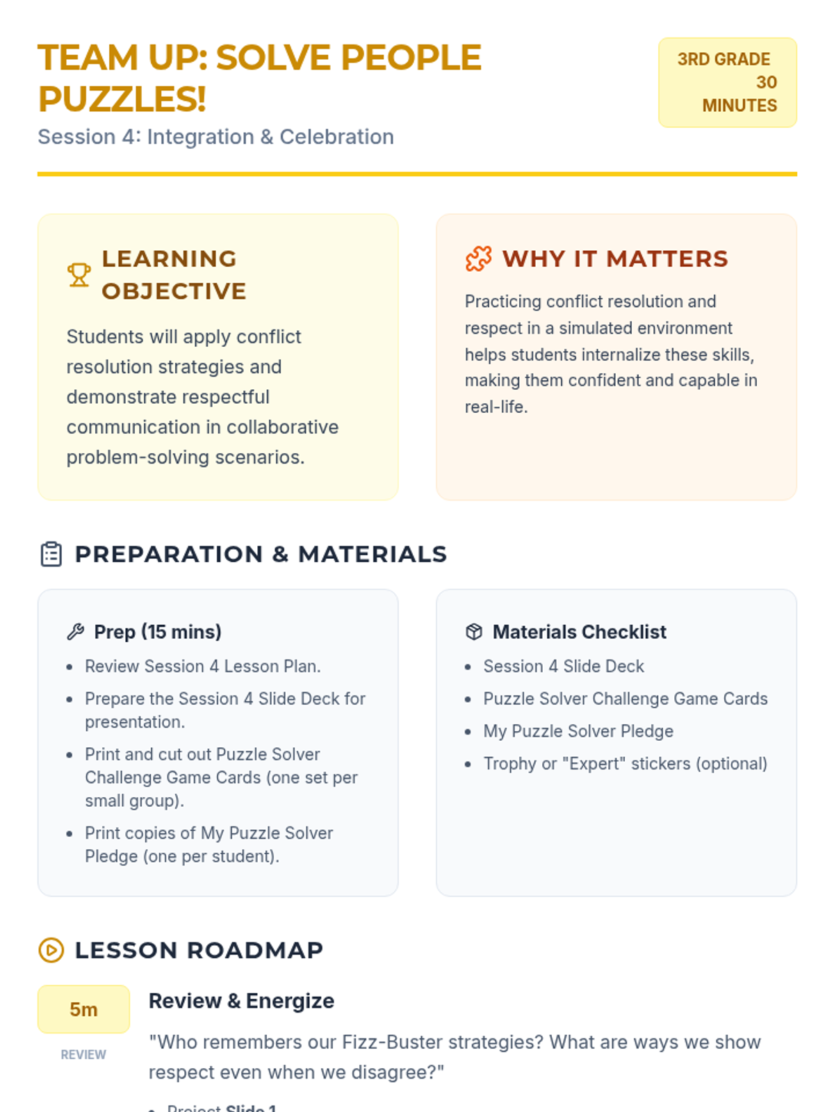A four-session Tier 1 social-emotional learning sequence for 3rd graders focused on identifying conflict ('fizz'), applying resolution strategies ('fizz-busters'), and practicing respect for diverse perspectives. Students use a 'people puzzle' metaphor to navigate disagreements and build a harmonious classroom community.
