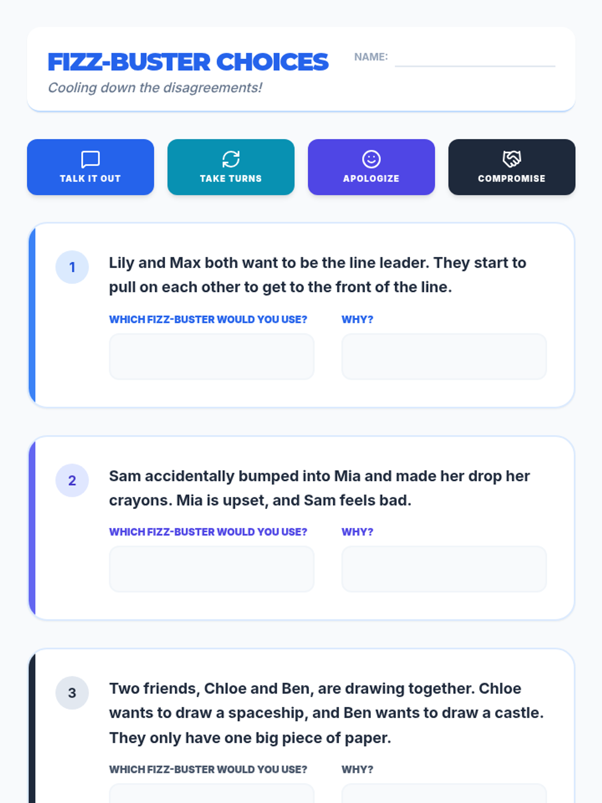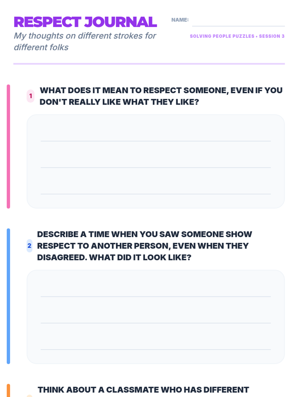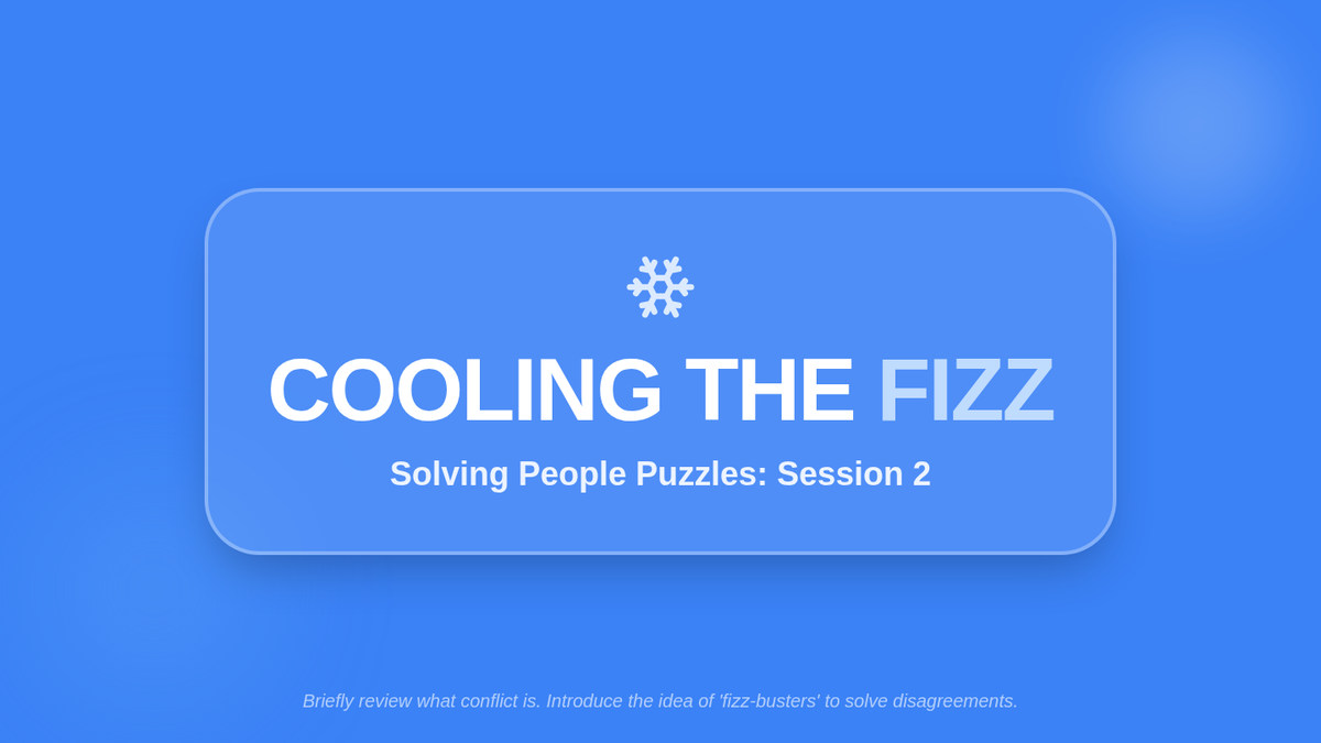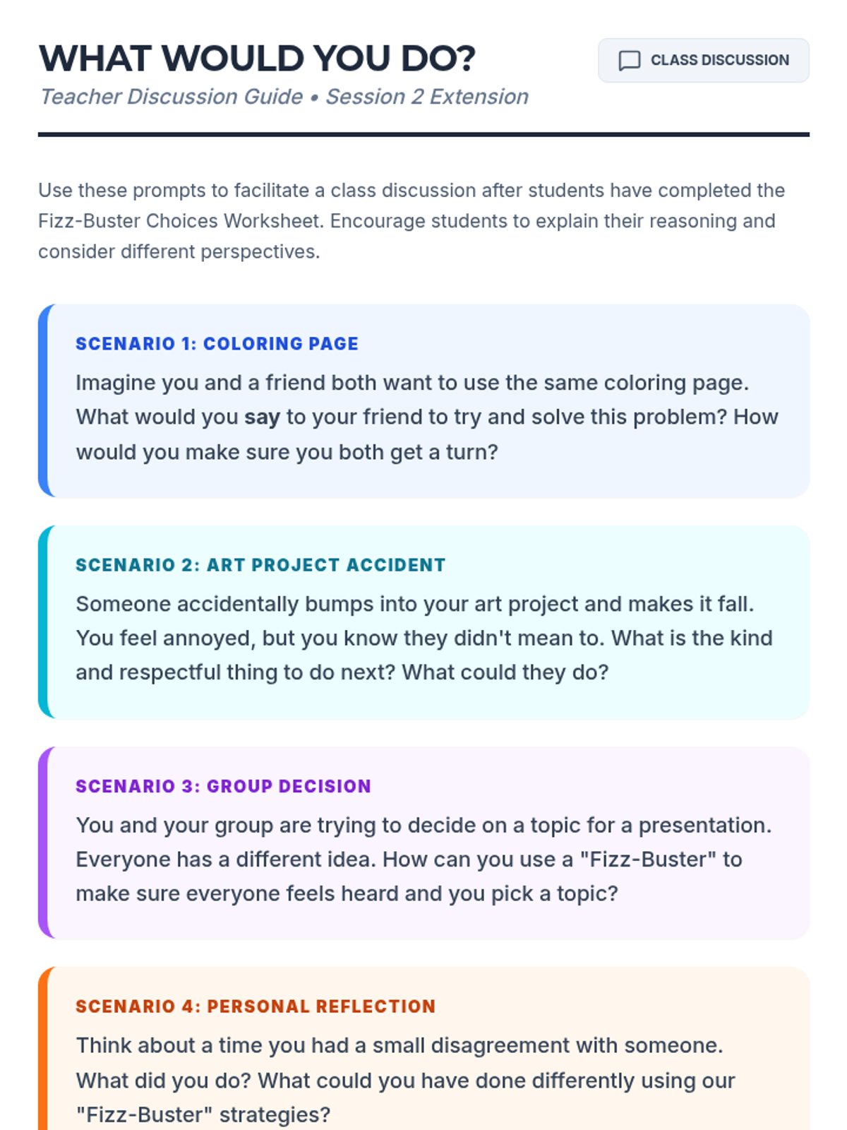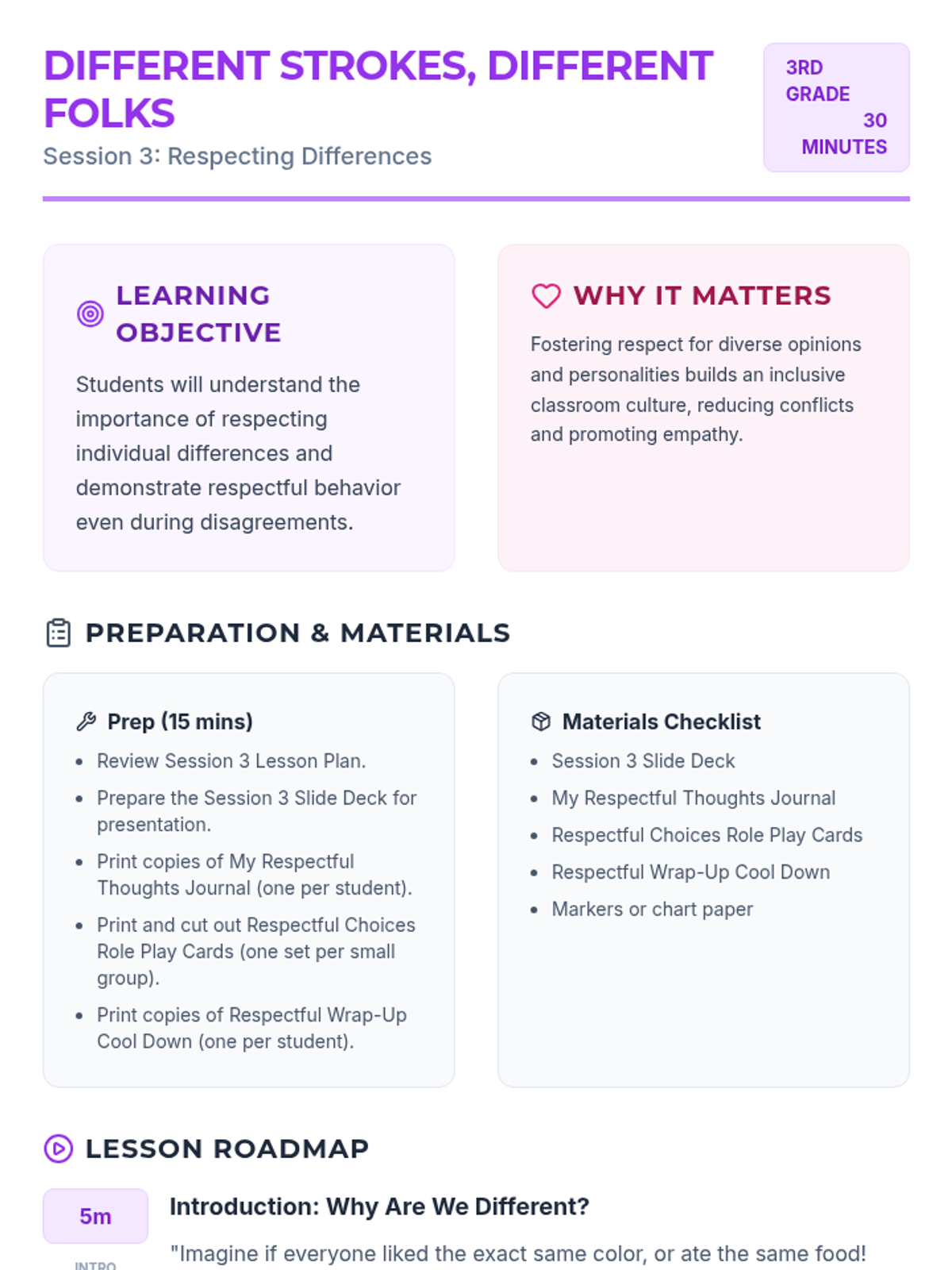 A four-session Tier 1 social-emotional learning sequence for 3rd graders focused on identifying conflict ('fizz'), applying resolution strategies ('fizz-busters'), and practicing respect for diverse perspectives. Students use a 'people puzzle' metaphor to navigate disagreements and build a harmonious classroom community.