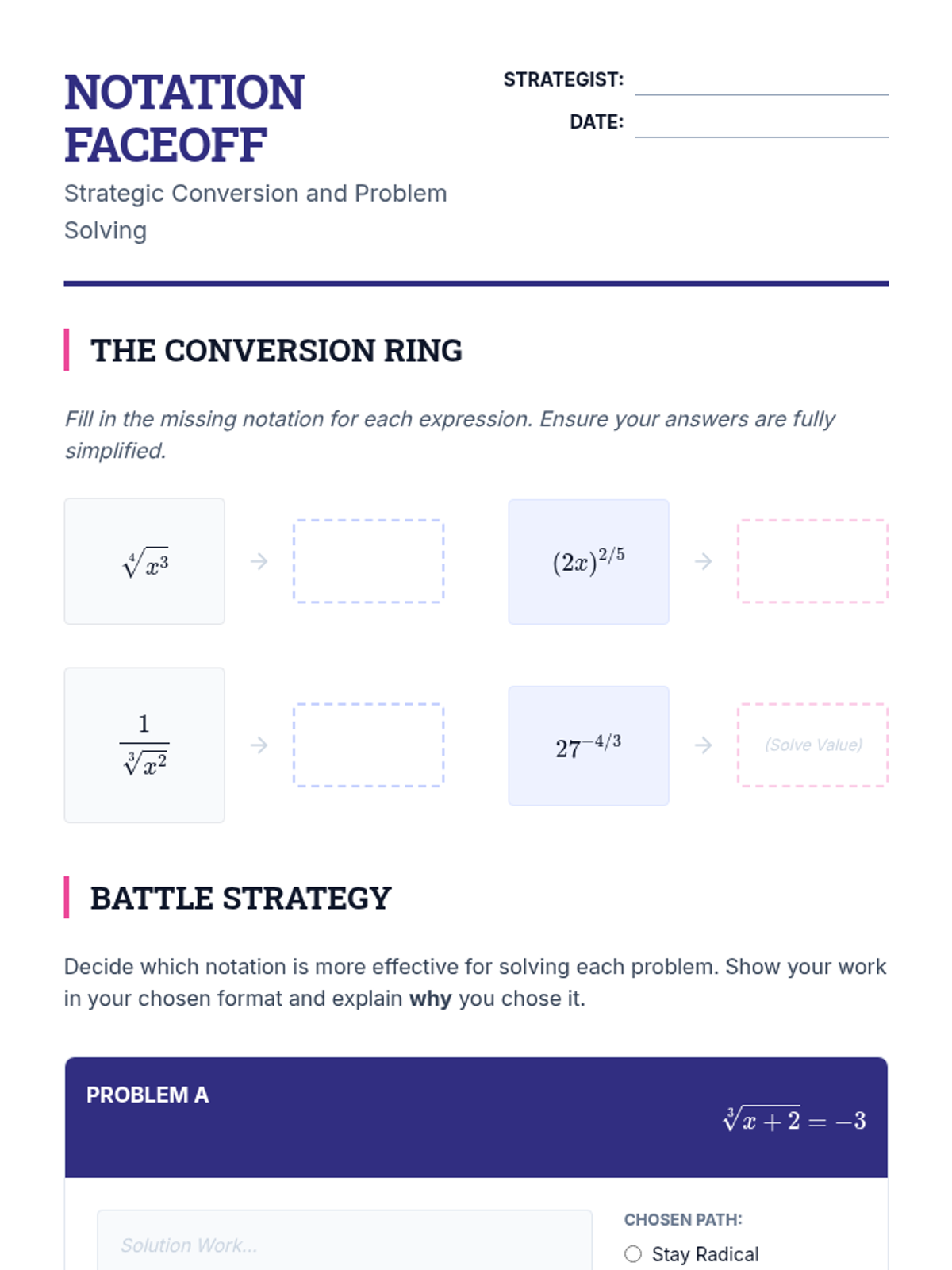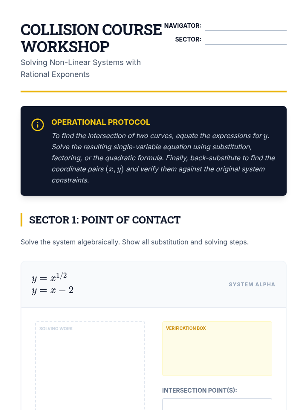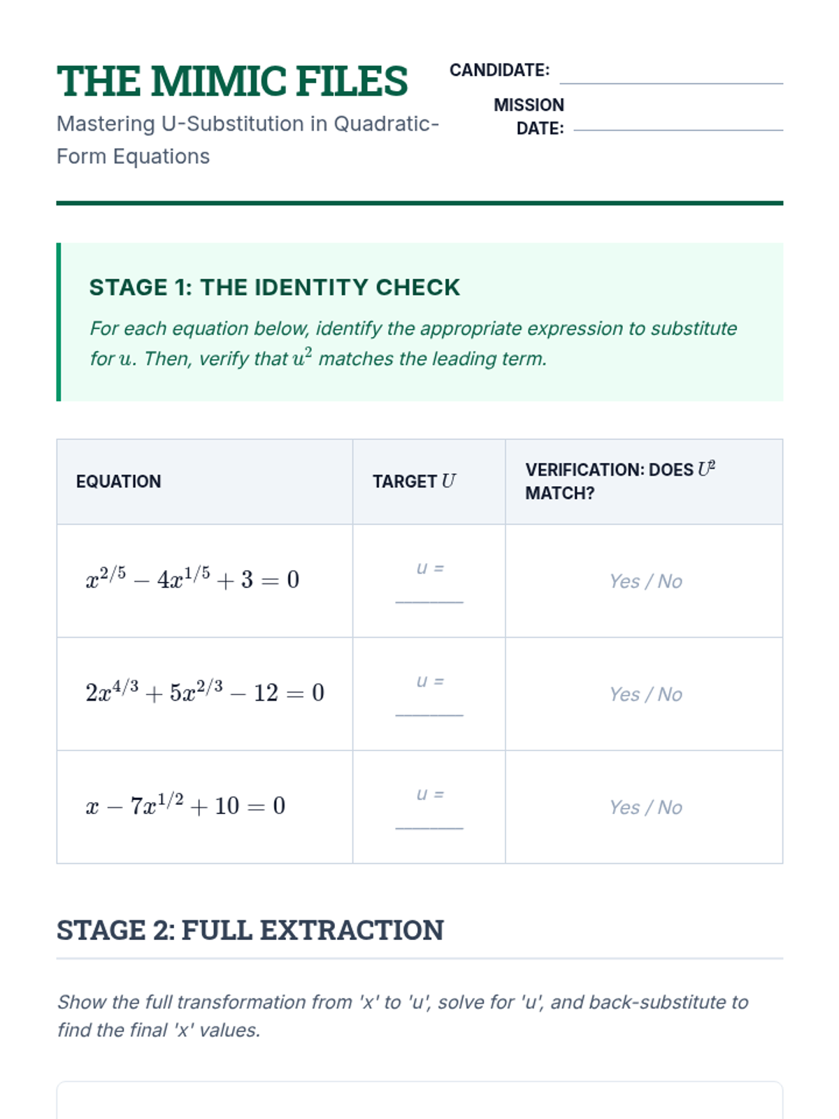 A comprehensive unit for undergraduate students focusing on the algebraic techniques and logical pitfalls involved in solving equations with variables raised to rational exponents. Students progress from basic isolation to quadratic-form structures and non-linear systems.