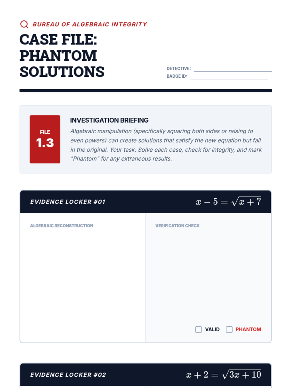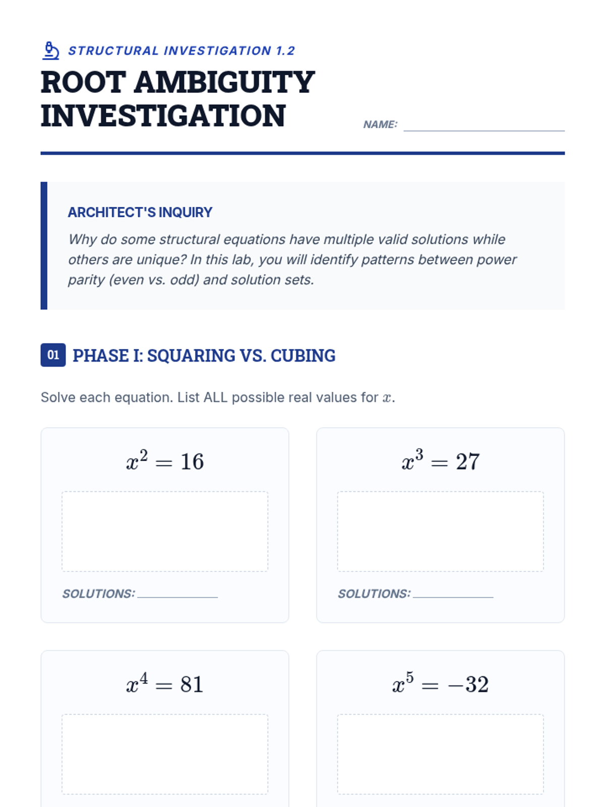A lesson sequence focusing on the algebraic and graphical properties of radical equations, bridging the gap between symbolic manipulation and visual intersection points.