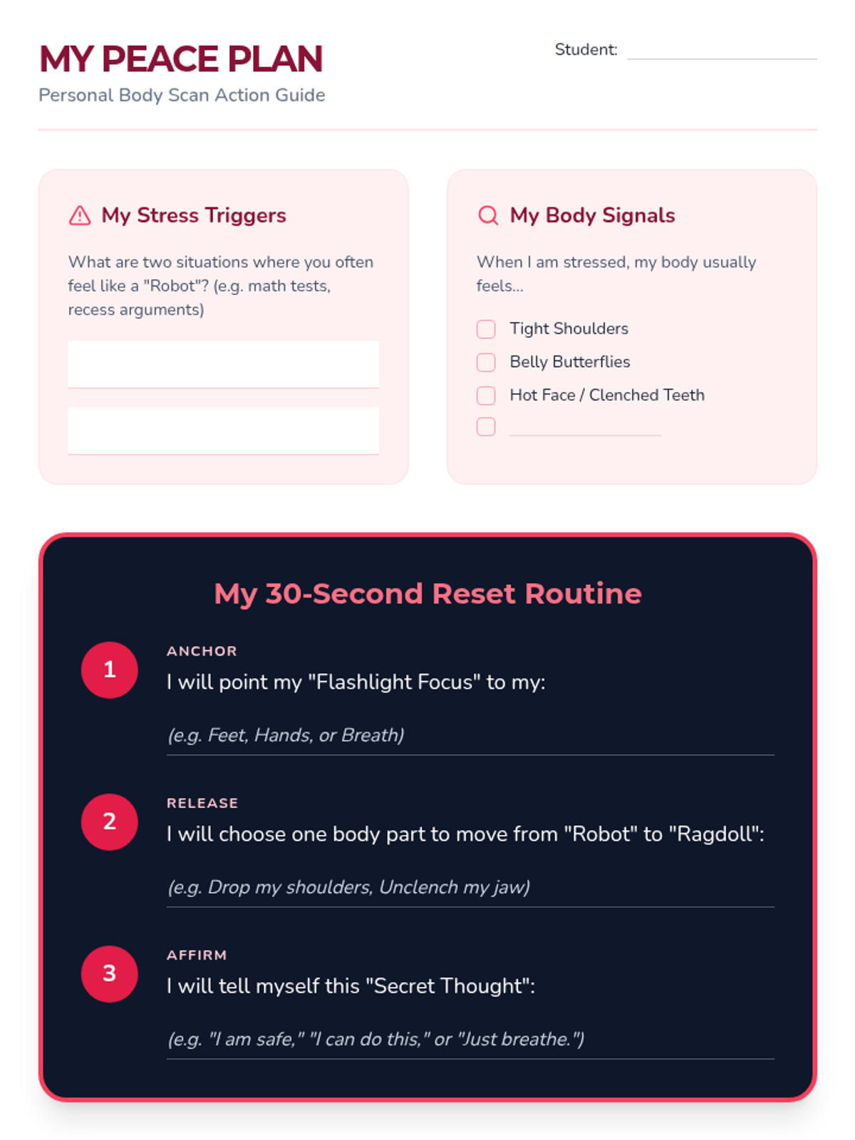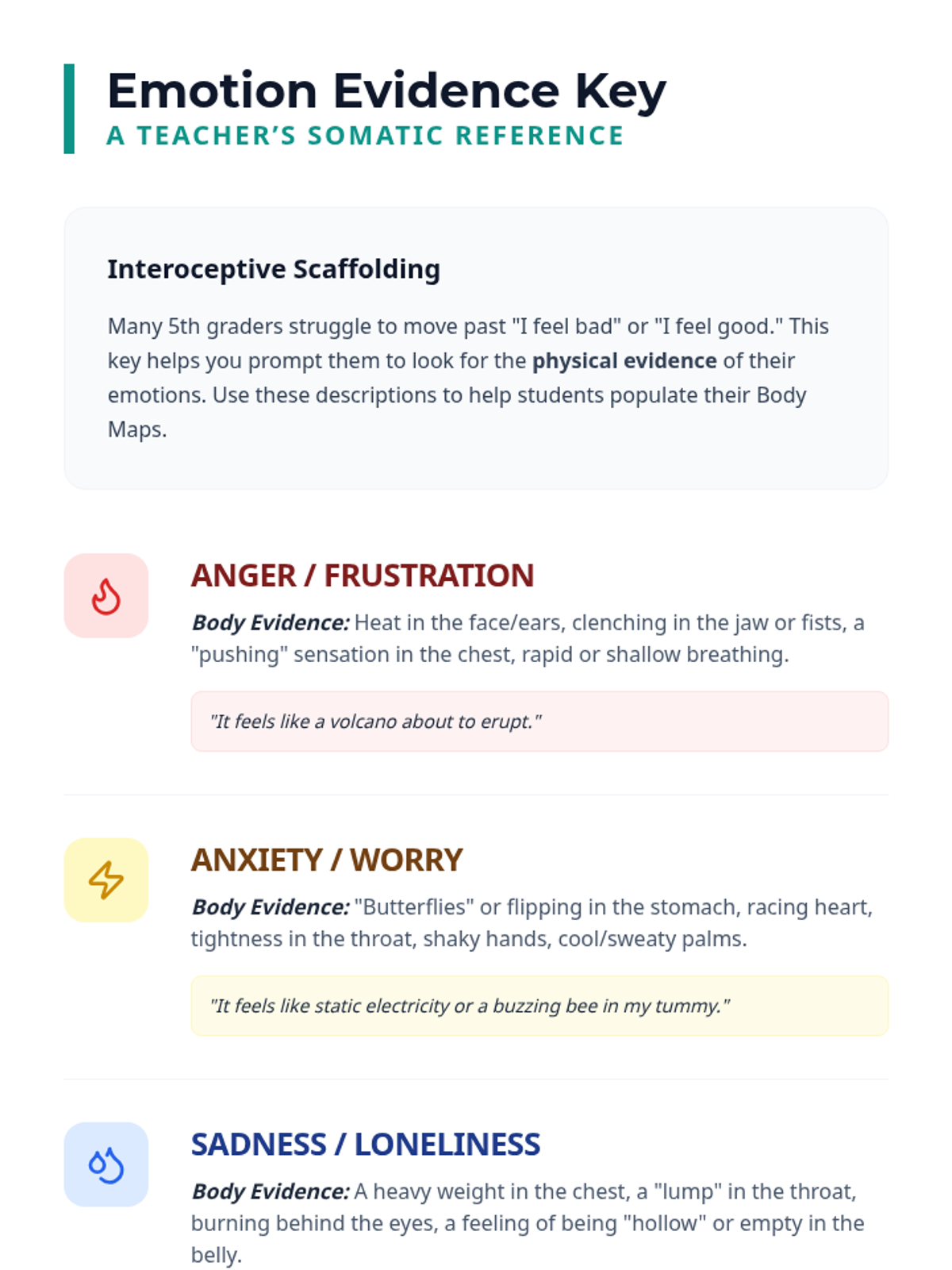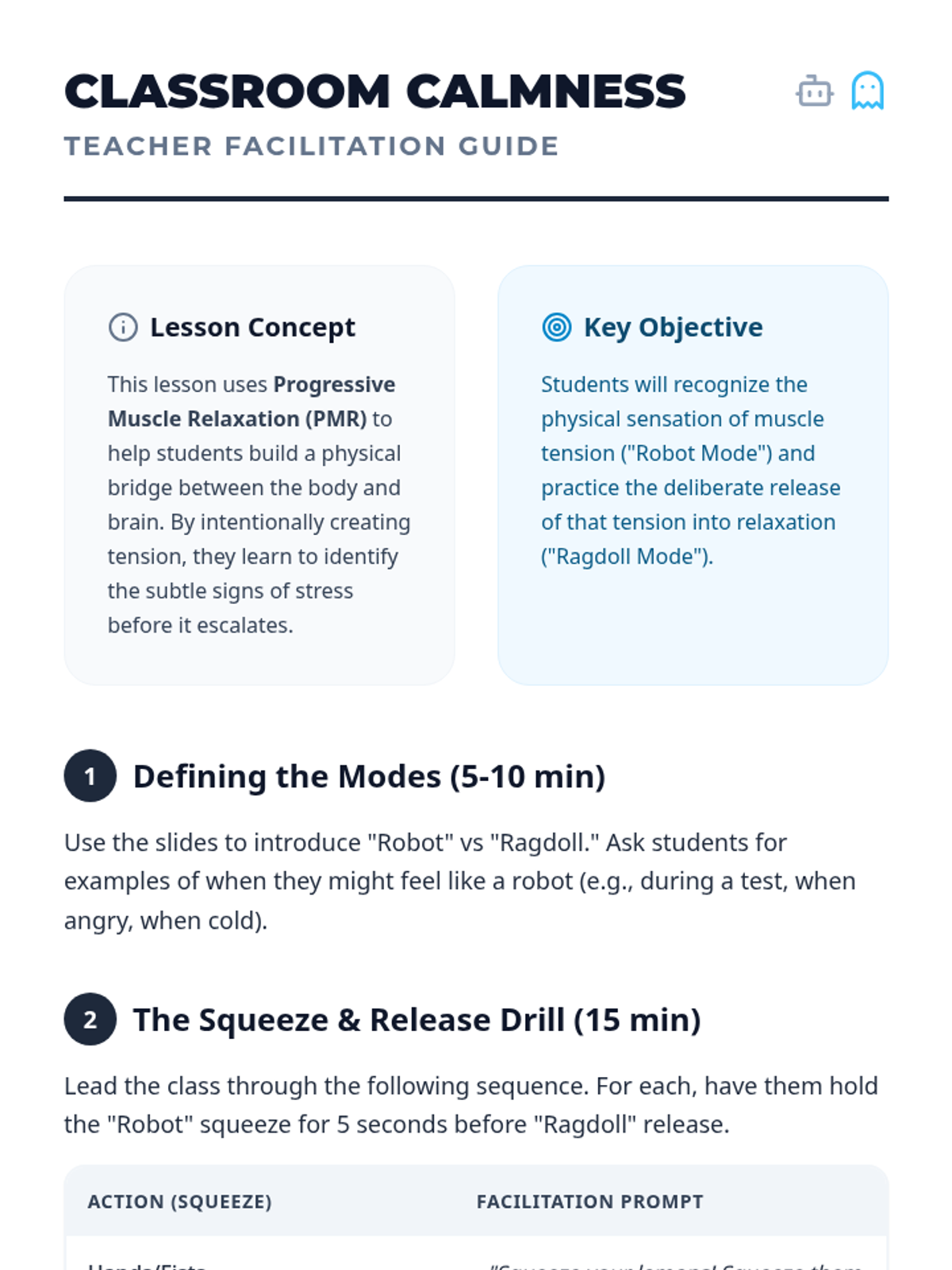 A comprehensive 5th-grade mindfulness sequence that guides students from basic sensory awareness to independent emotional regulation using body scan meditation techniques. Students learn to map emotions physically and develop personal stress-management routines.