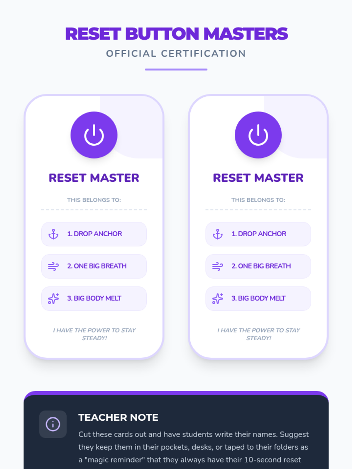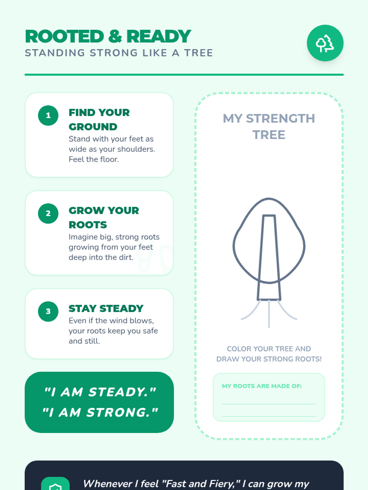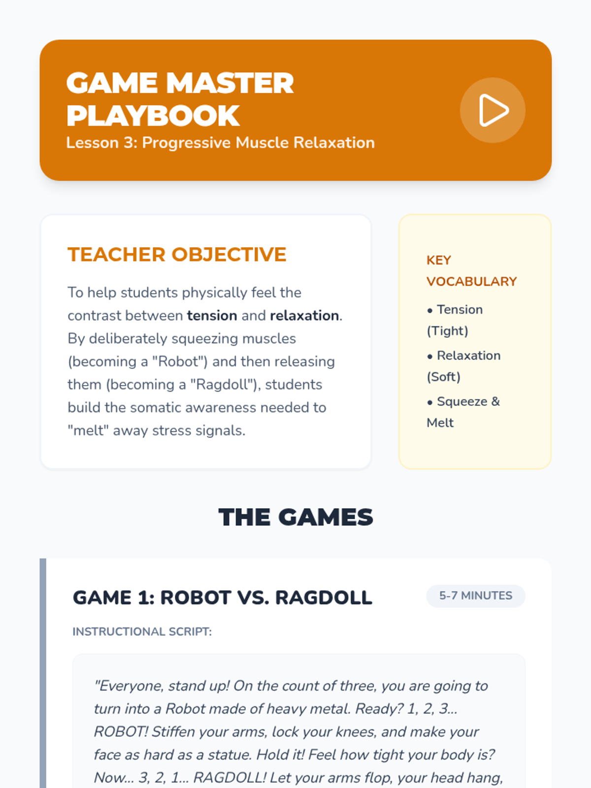 A 5-lesson series for 1st graders focusing on somatic grounding techniques, teaching students to recognize body signals, master belly breathing, release muscle tension, and build physical stability to manage distress.