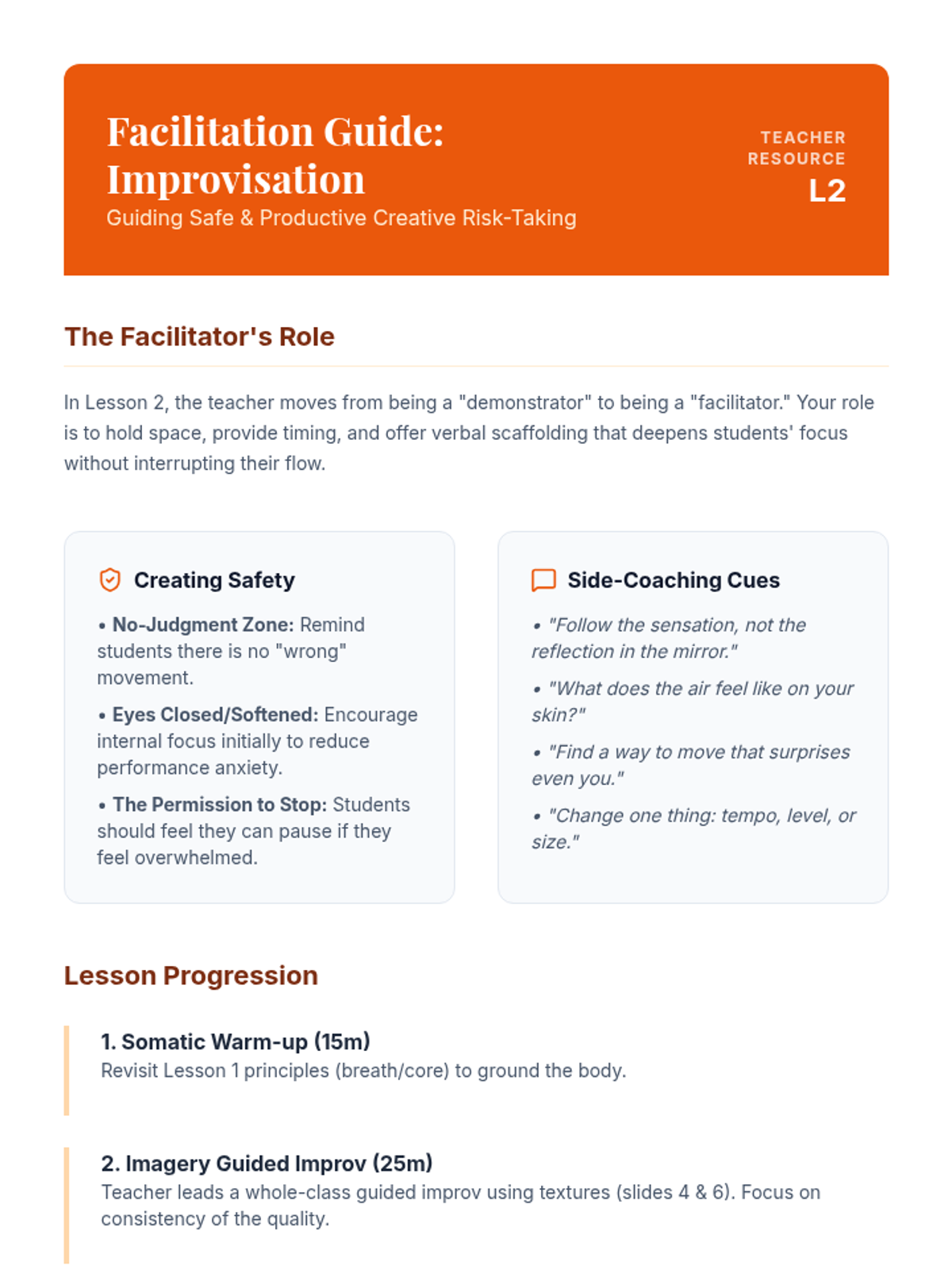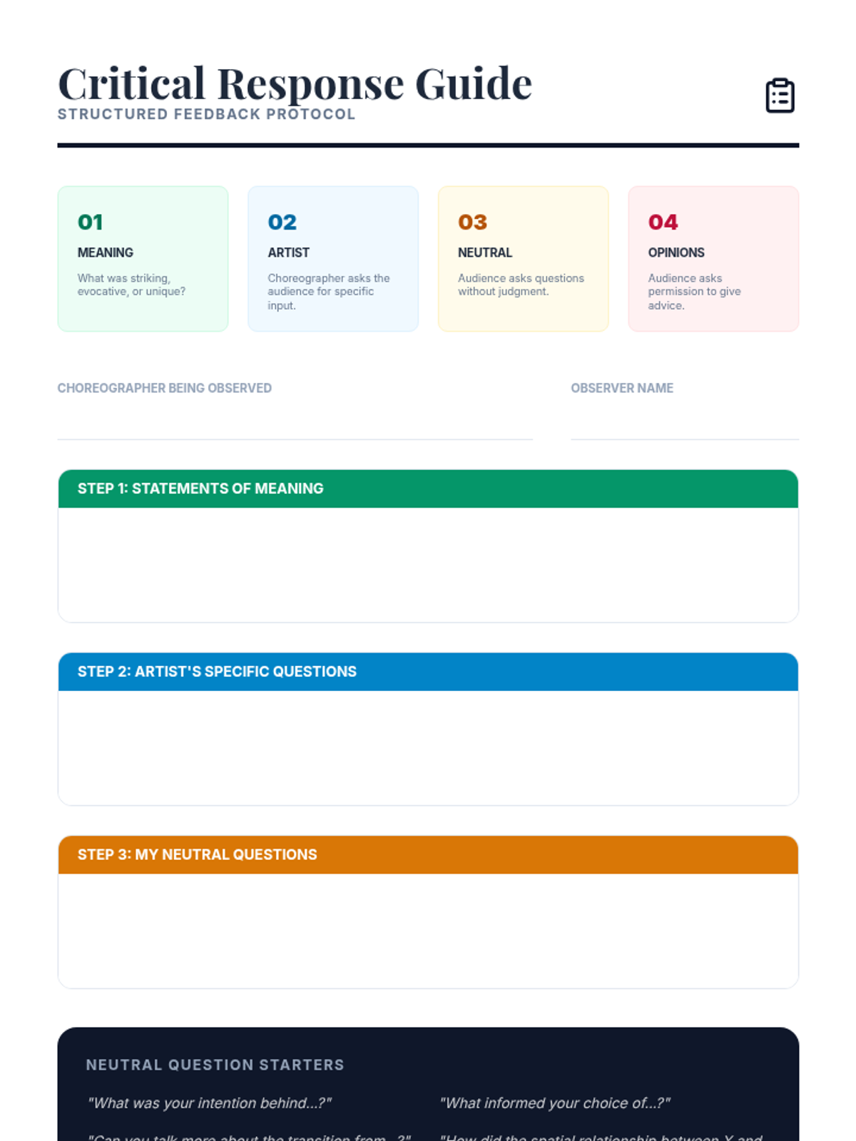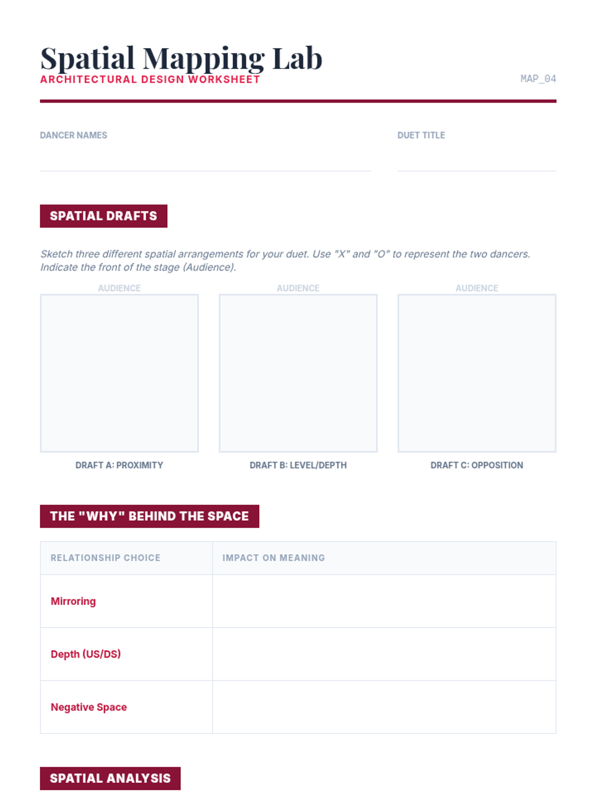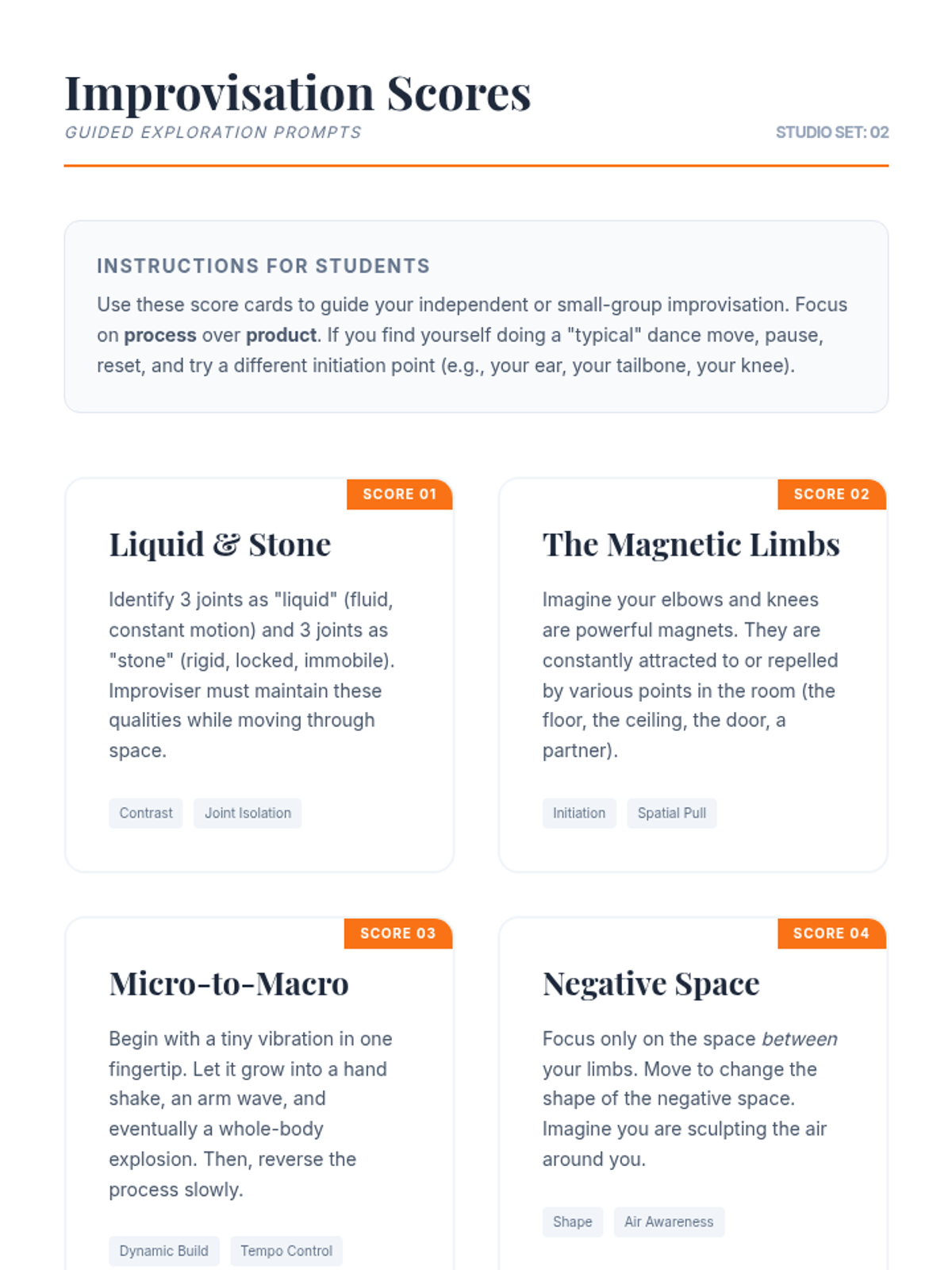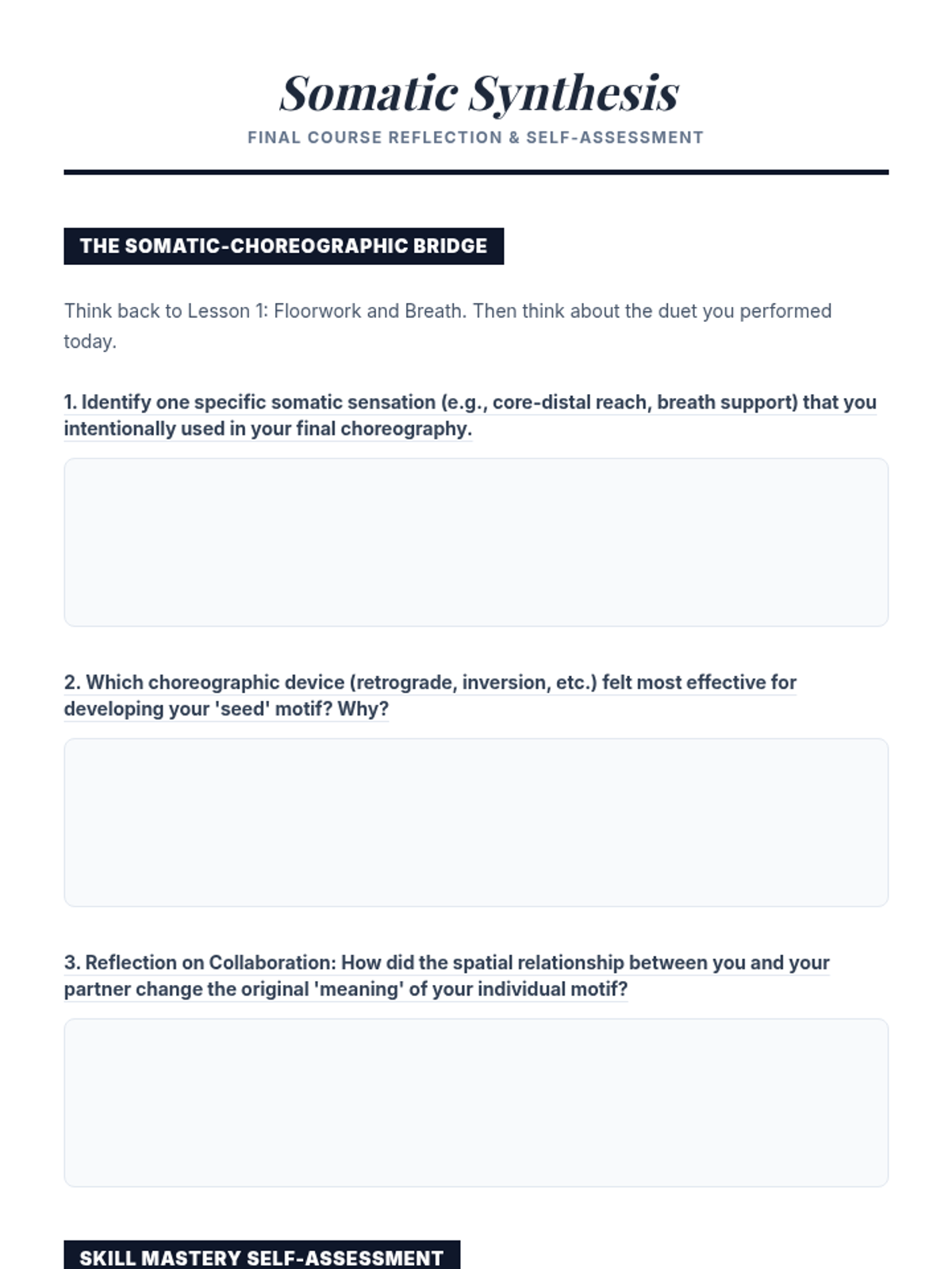 A comprehensive undergraduate dance sequence that bridges internal somatic awareness with choreographic principles. Students progress from floor-based somatic explorations to creating and critiquing original movement phrases using professional choreographic devices.