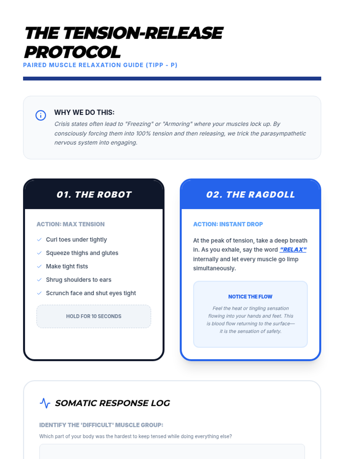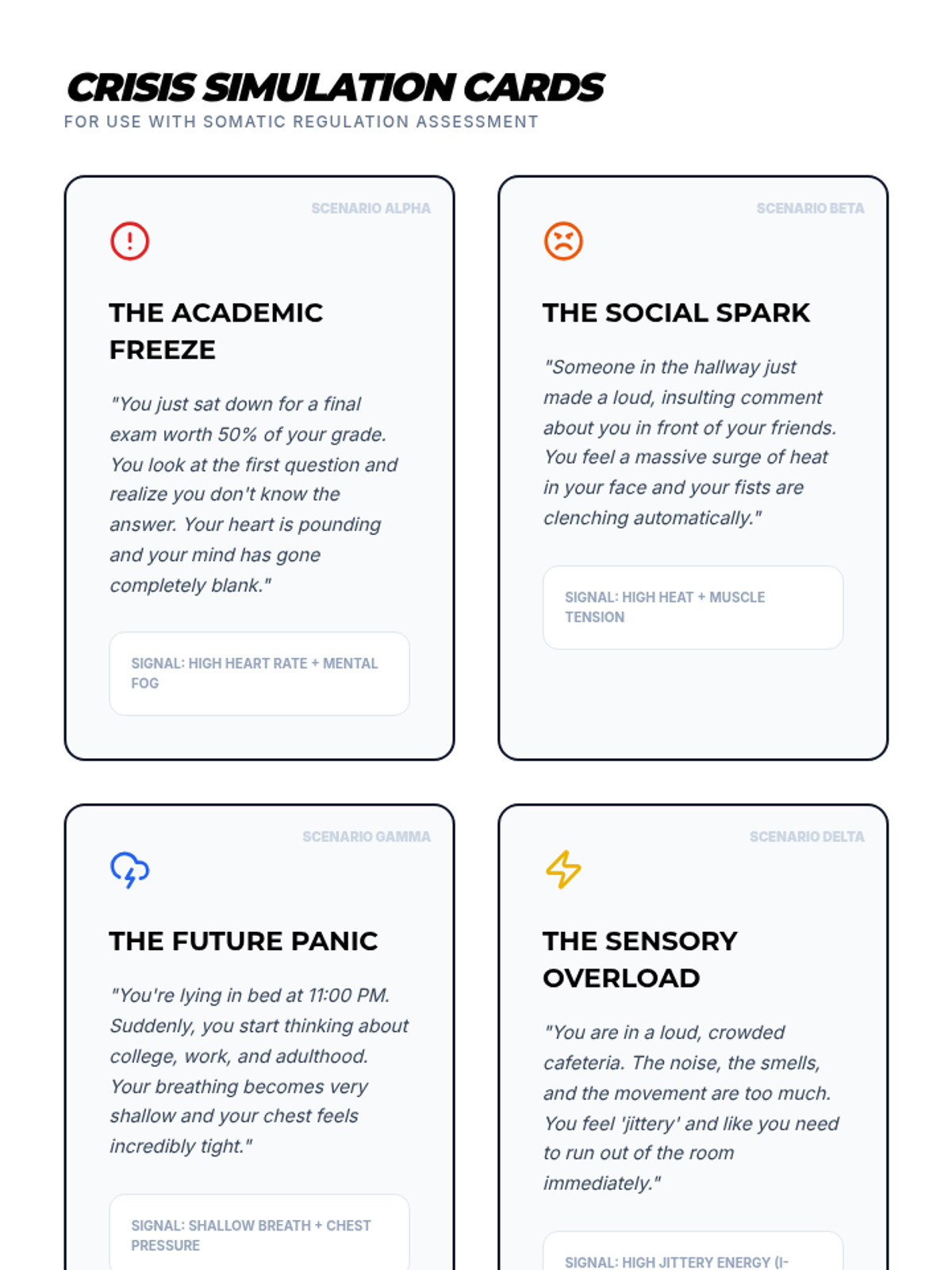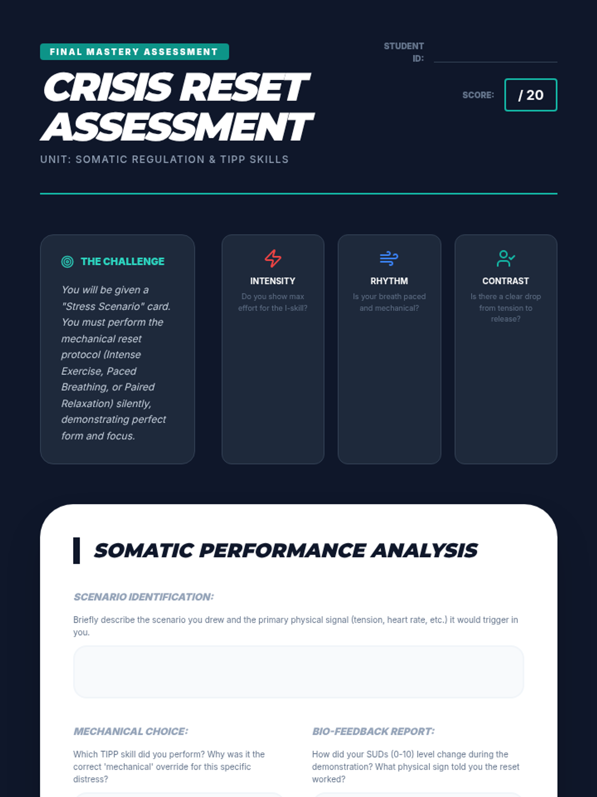 A sequence for 11th-grade students focusing on Somatic Engagement and TIPP skills (Intense Exercise, Paced Breathing, Paired Muscle Relaxation) to override psychological distress using physical interventions.
