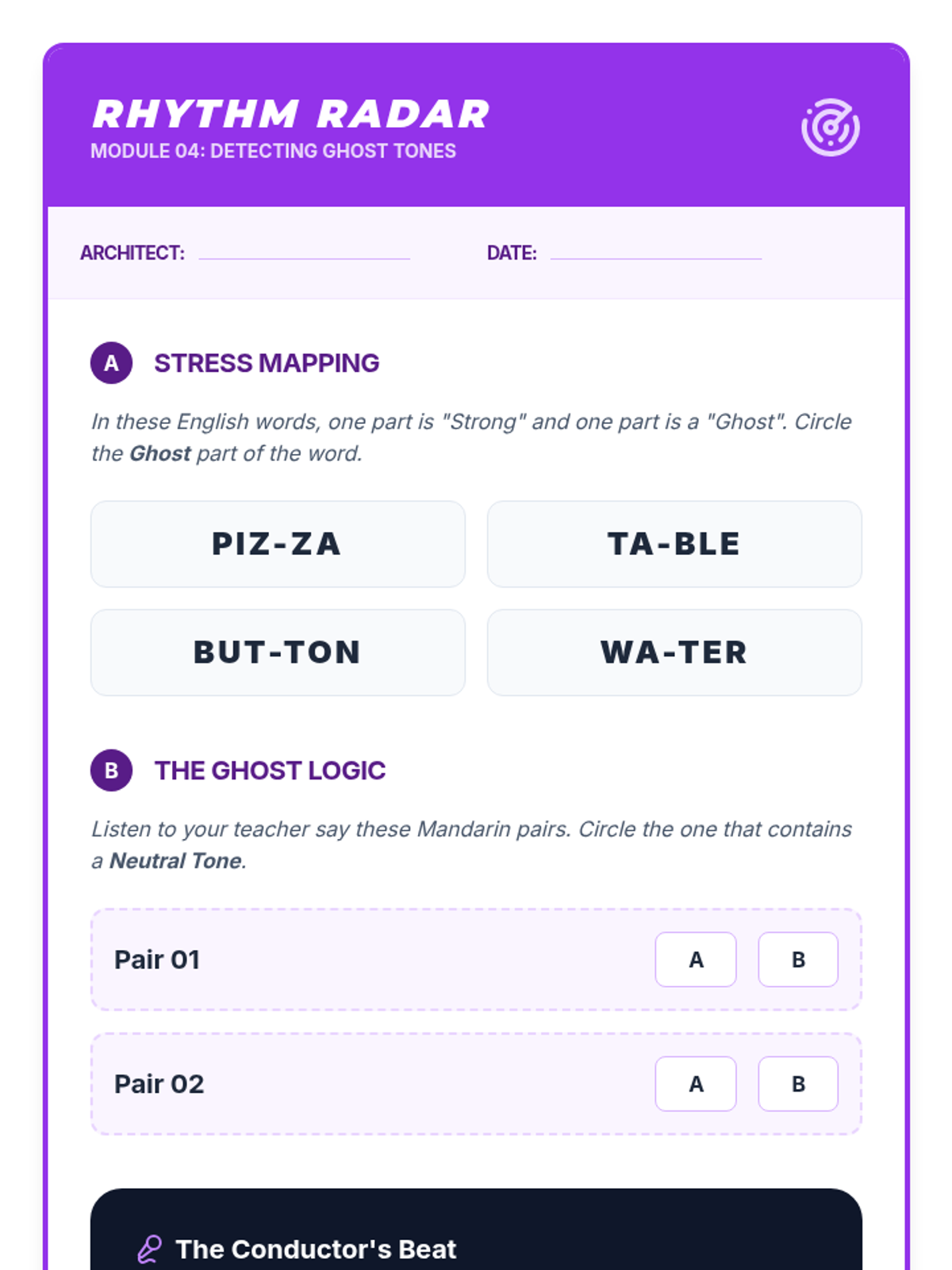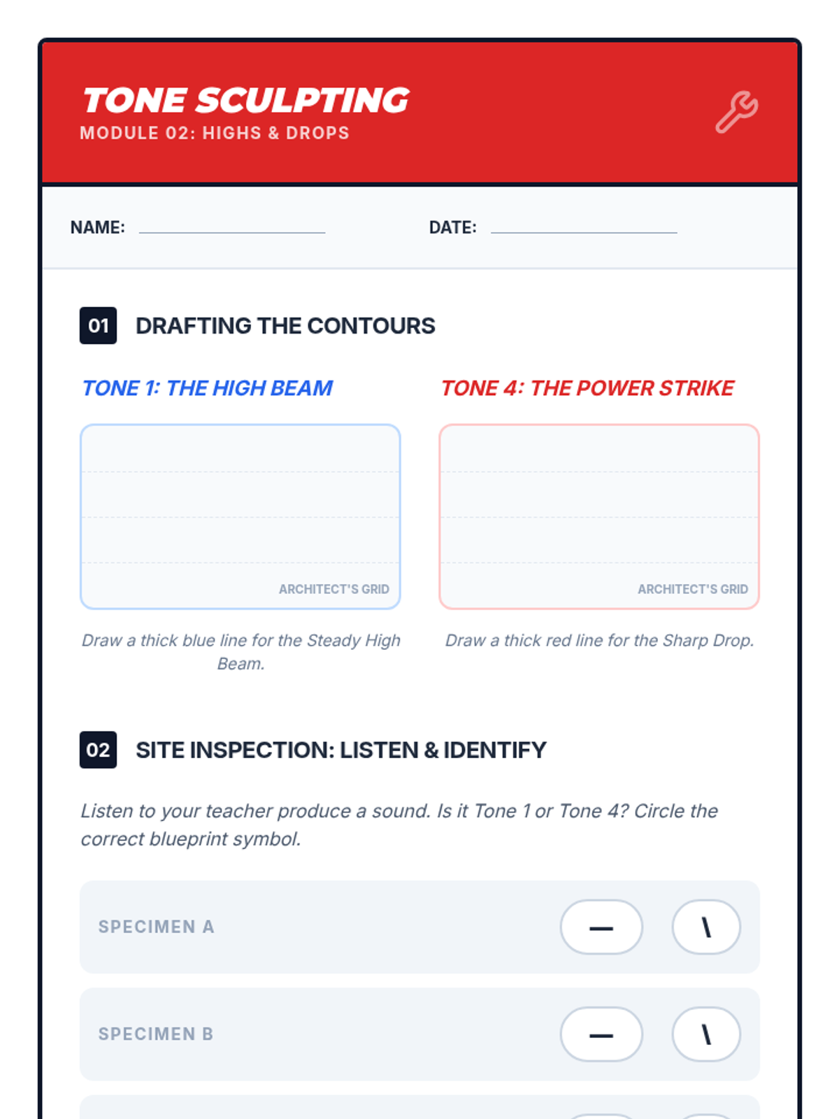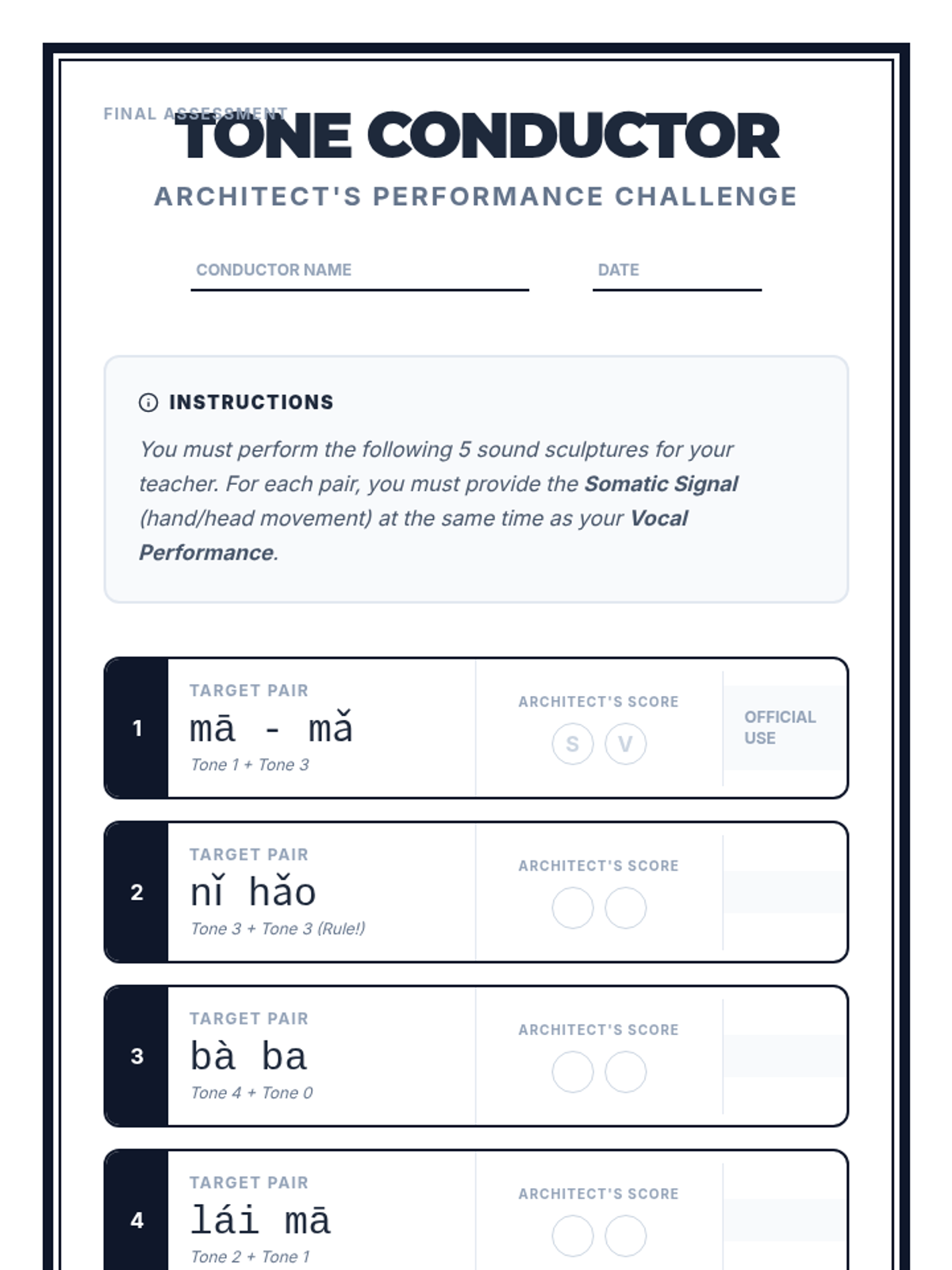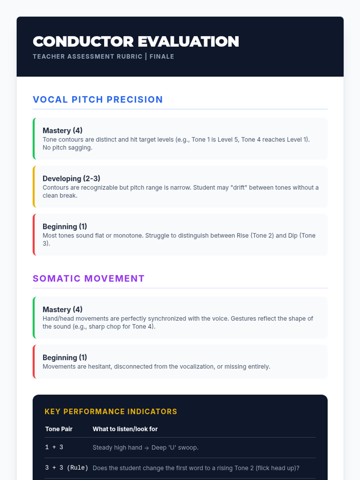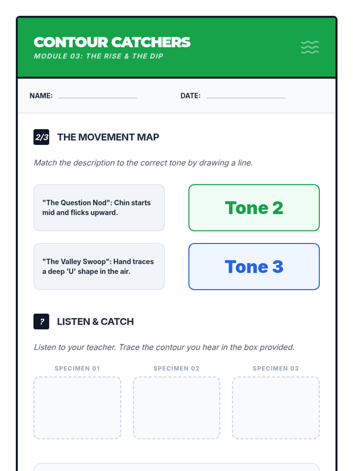 A somatic approach to Mandarin tones for 6th graders, connecting physical movement and body awareness to vocal pitch control. Students transition from recognizing pitch in English to 'conducting' their own Mandarin tone production.