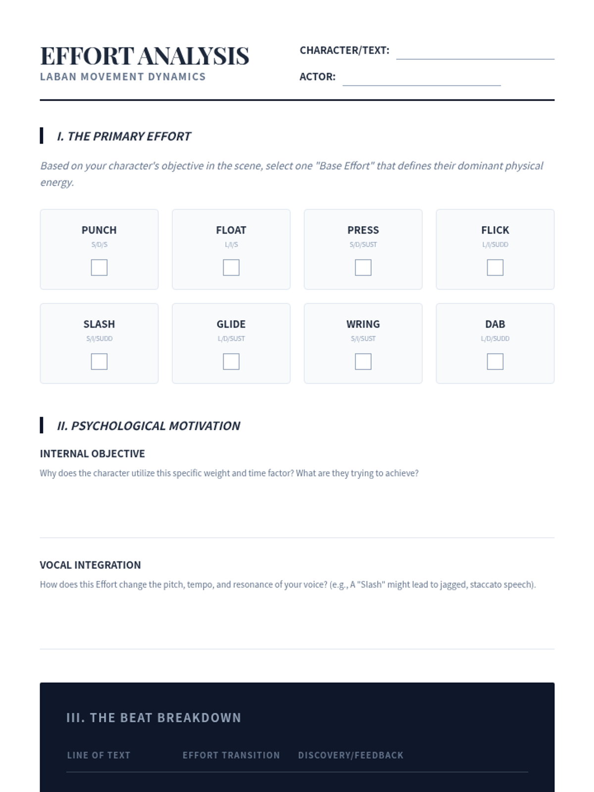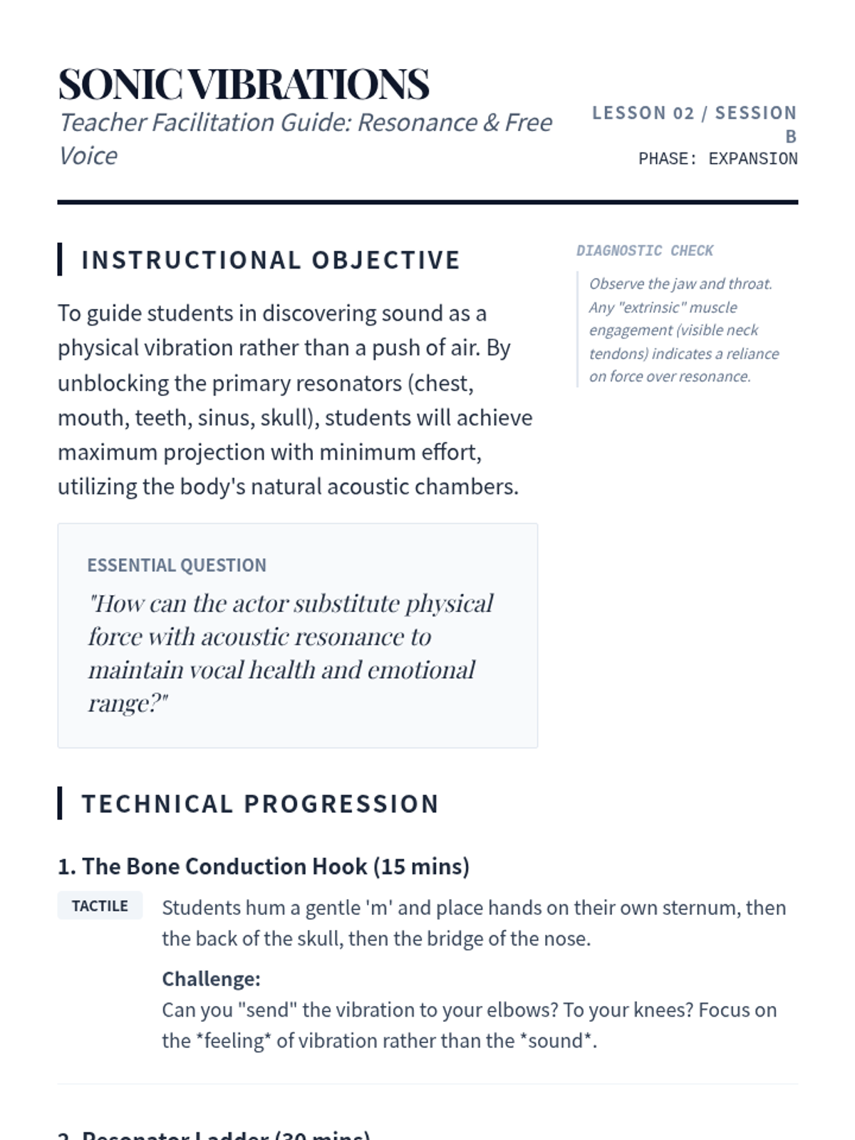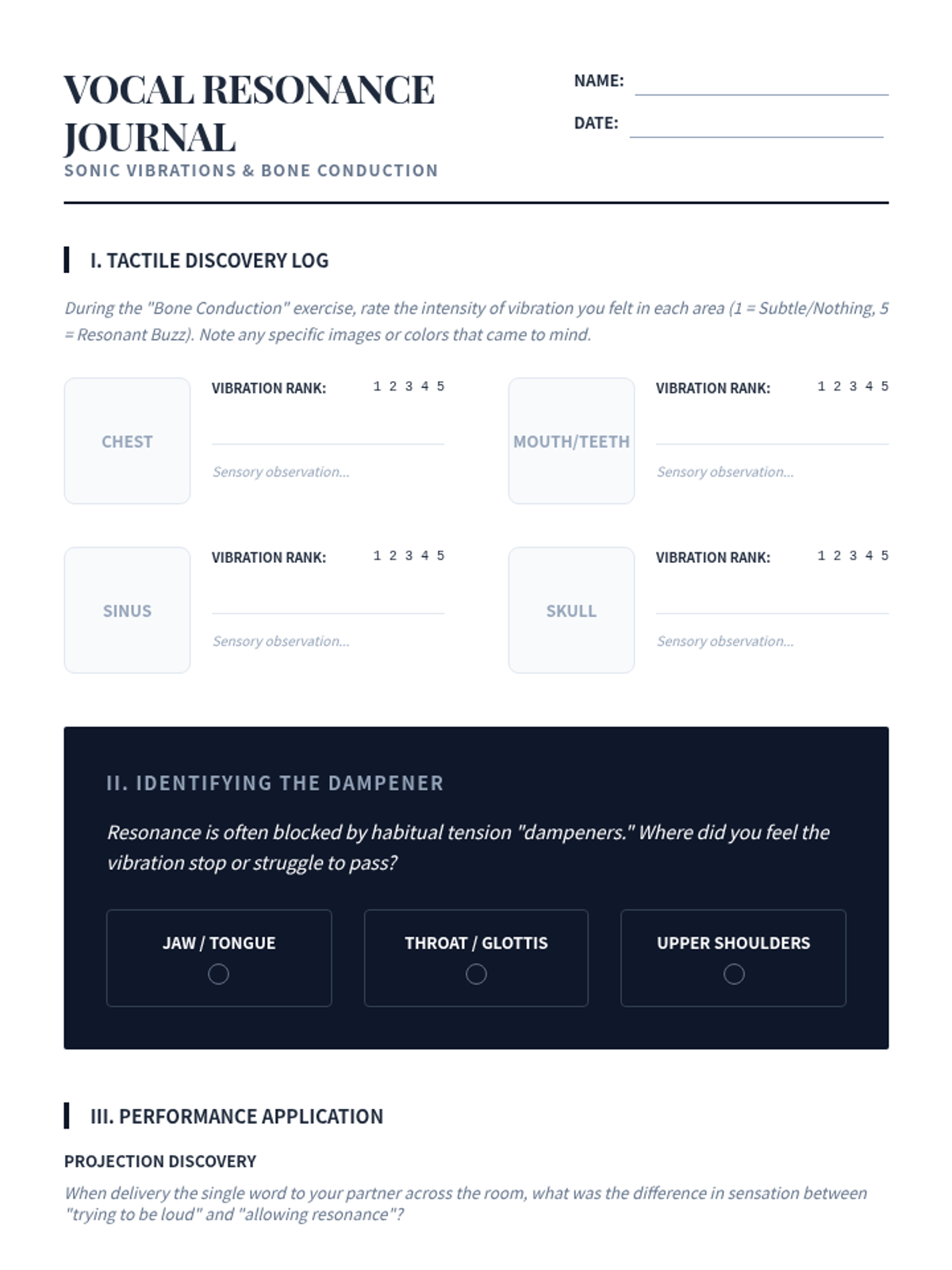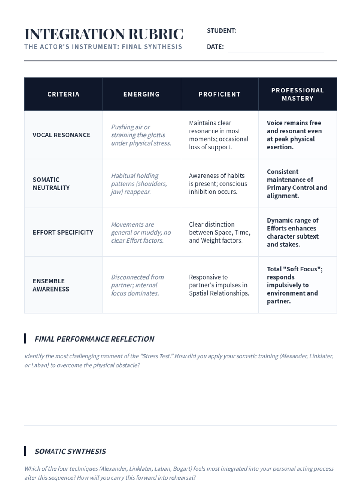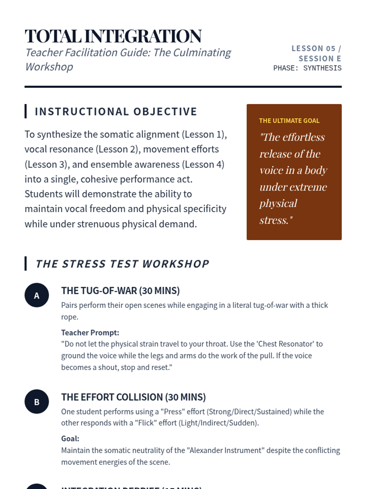 This advanced sequence for graduate theater students explores somatic practices to eliminate physical tension and unlock vocal power. By integrating Alexander Technique, Linklater Voice, Laban Movement Analysis, and Bogart's Viewpoints, students develop a responsive and resonant 'actor's instrument' capable of meeting the demands of professional performance.