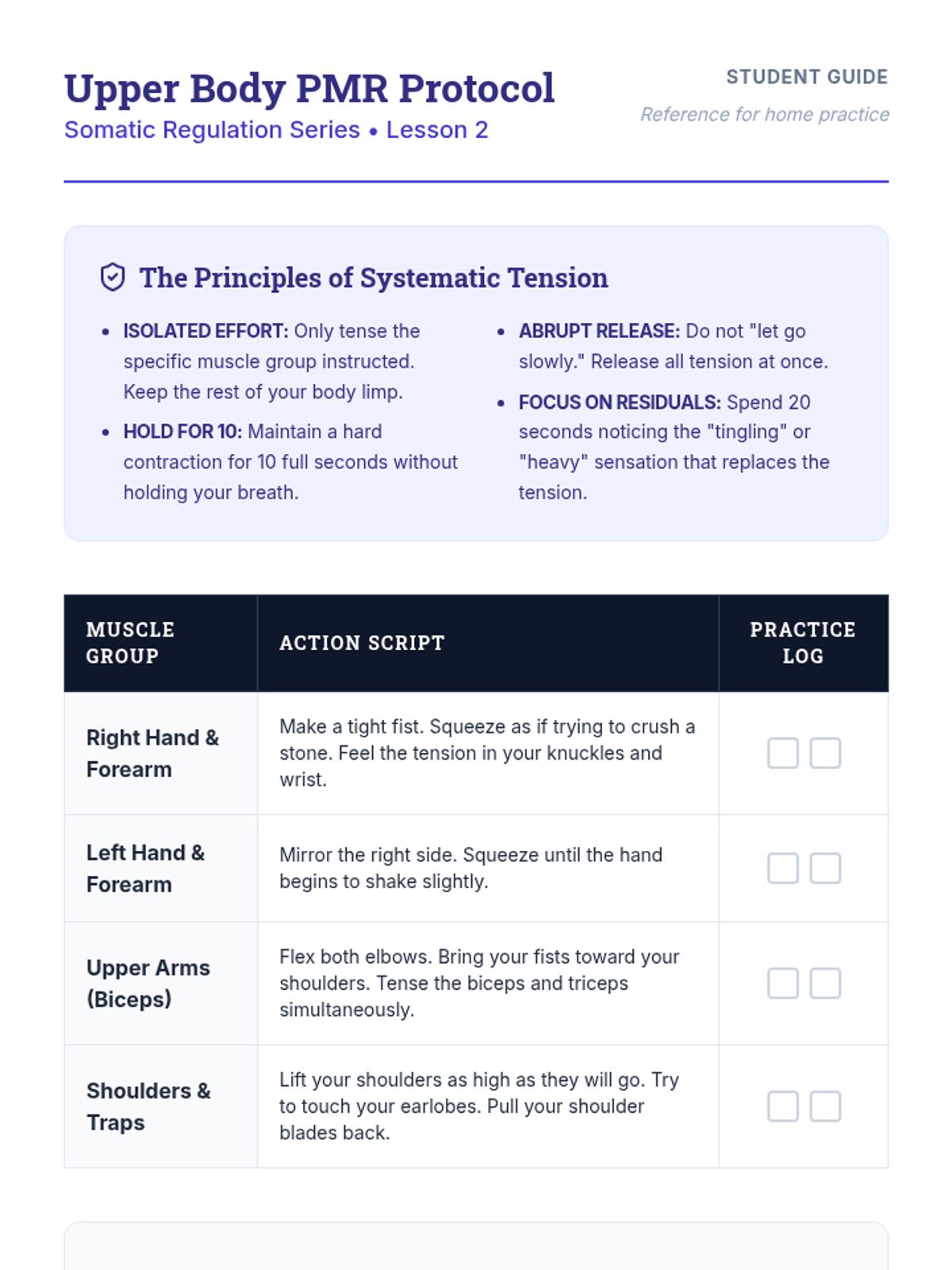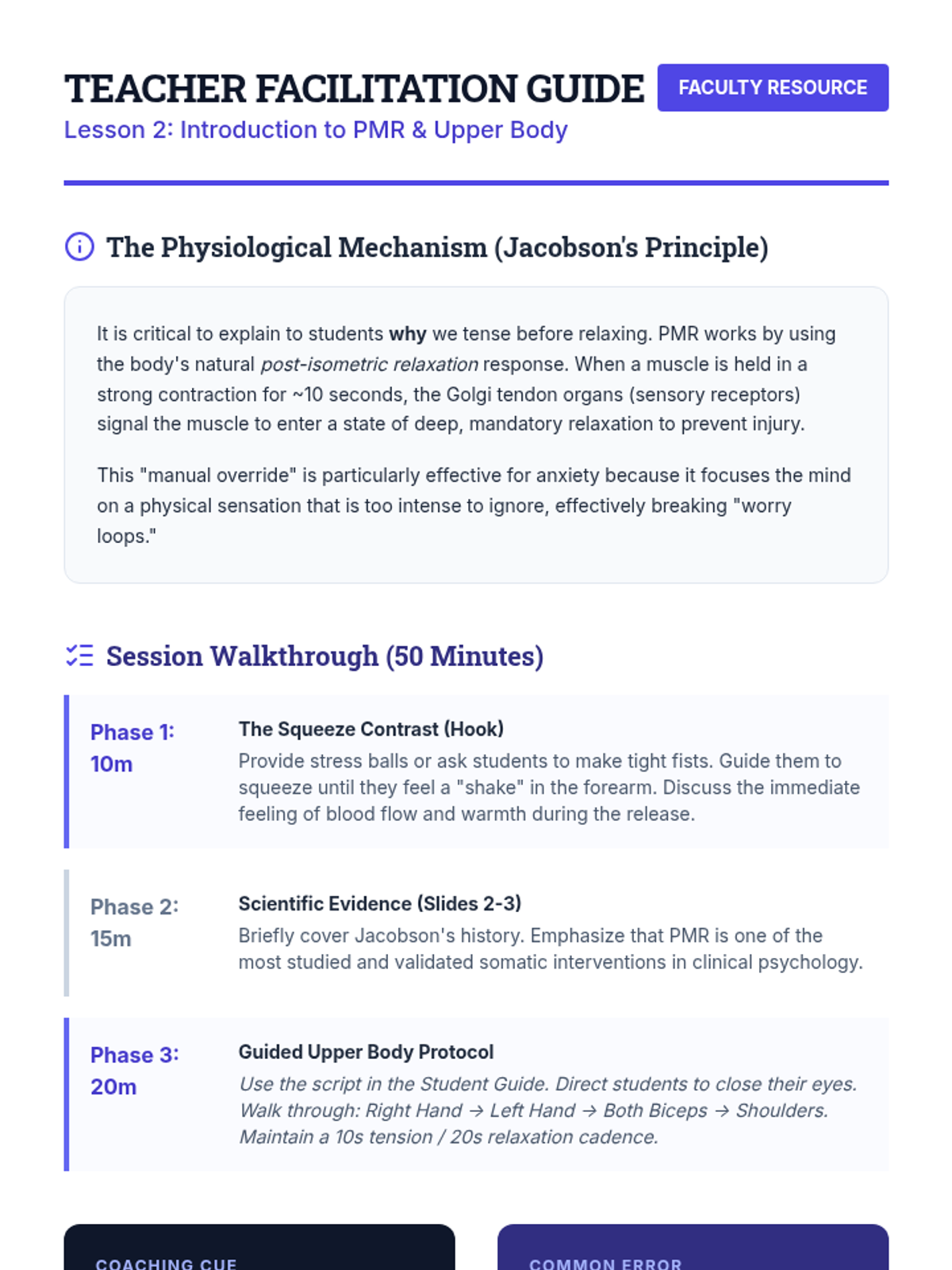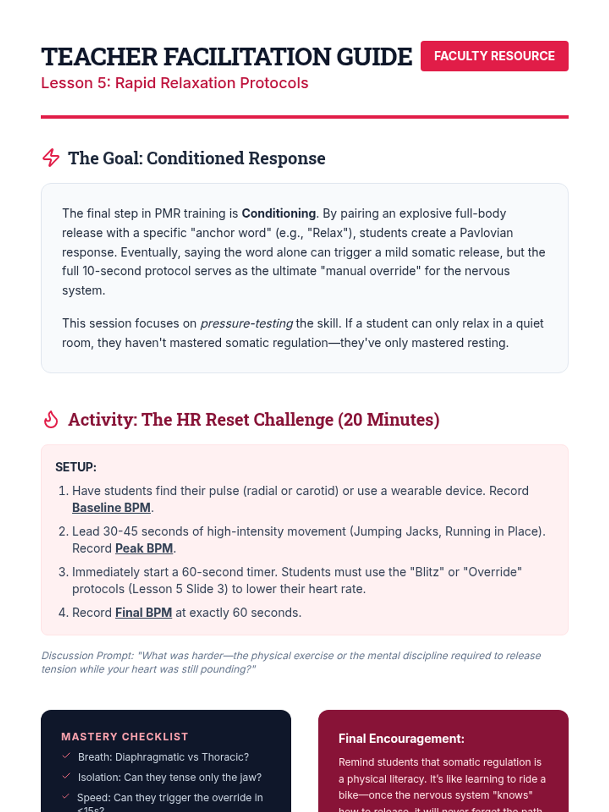 A comprehensive 5-lesson sequence on somatic regulation and Progressive Muscle Relaxation (PMR) for undergraduate students. It covers anatomical breath mechanics, systematic muscle group isolation, and rapid relaxation protocols for real-world stress management.