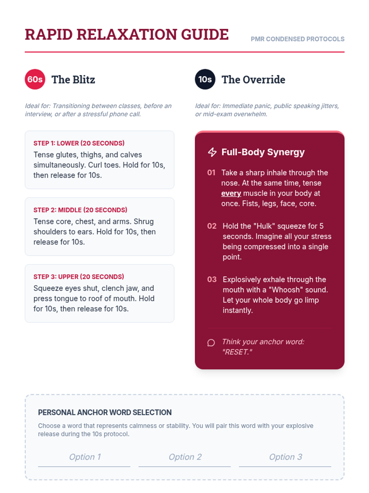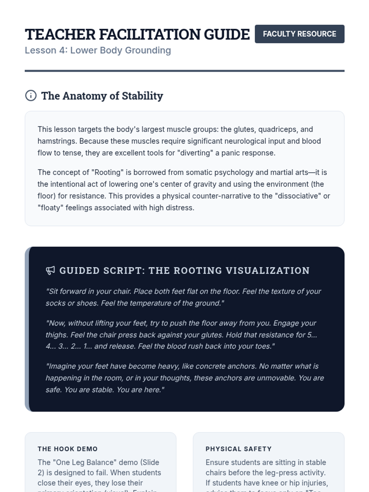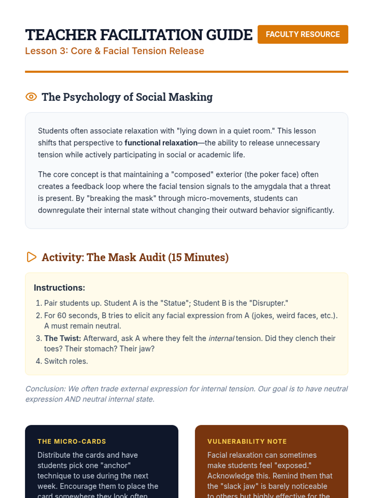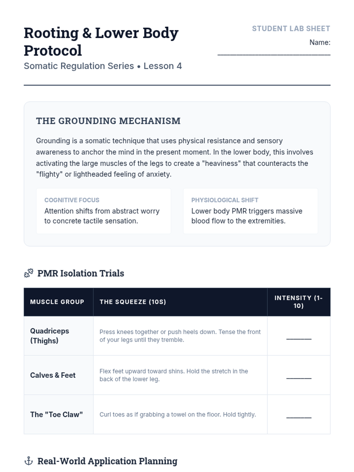 A comprehensive 5-lesson sequence on somatic regulation and Progressive Muscle Relaxation (PMR) for undergraduate students. It covers anatomical breath mechanics, systematic muscle group isolation, and rapid relaxation protocols for real-world stress management.