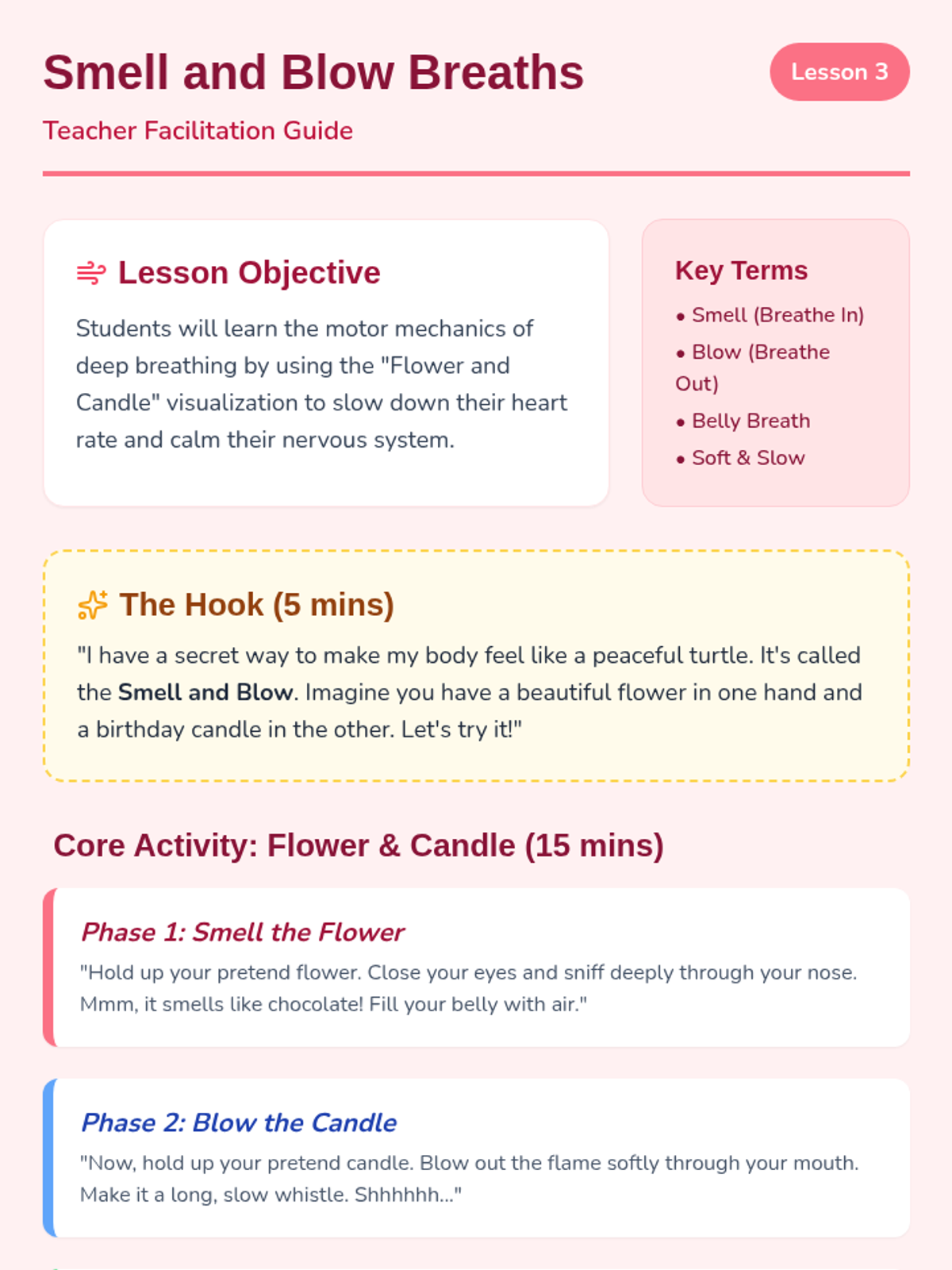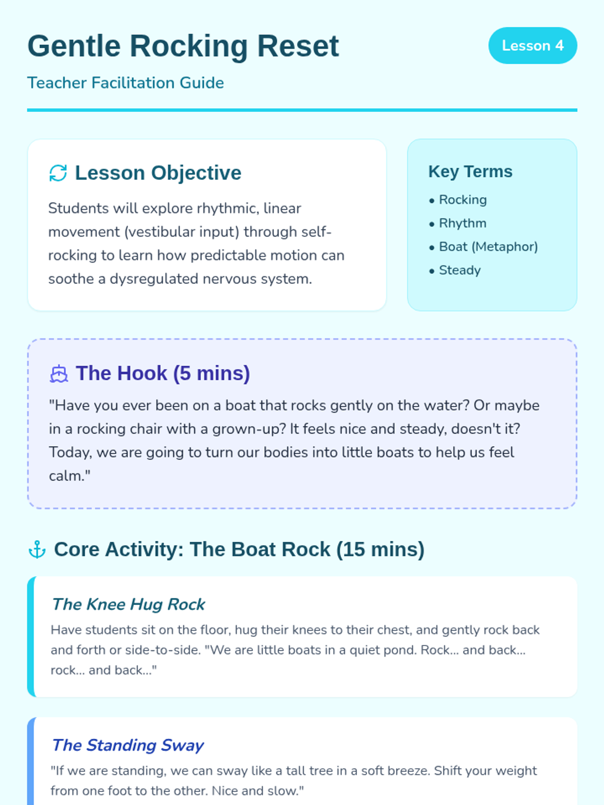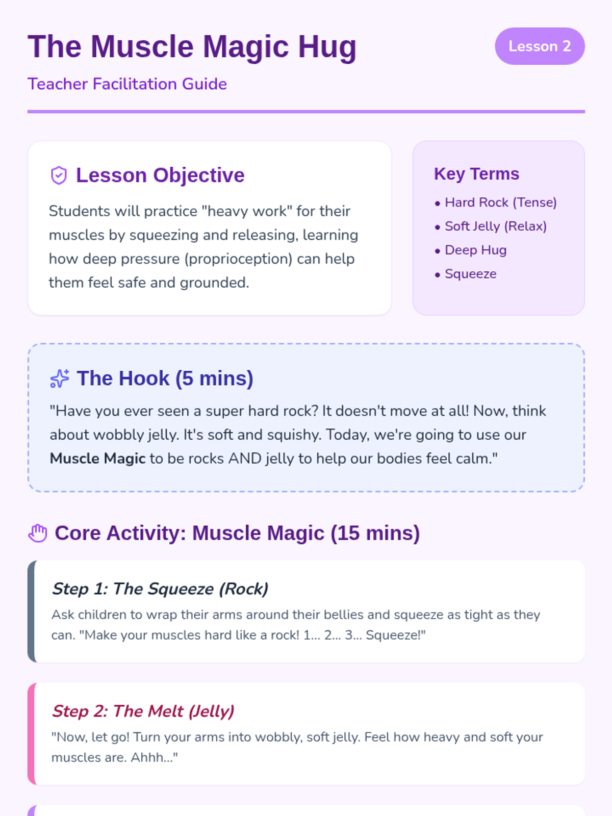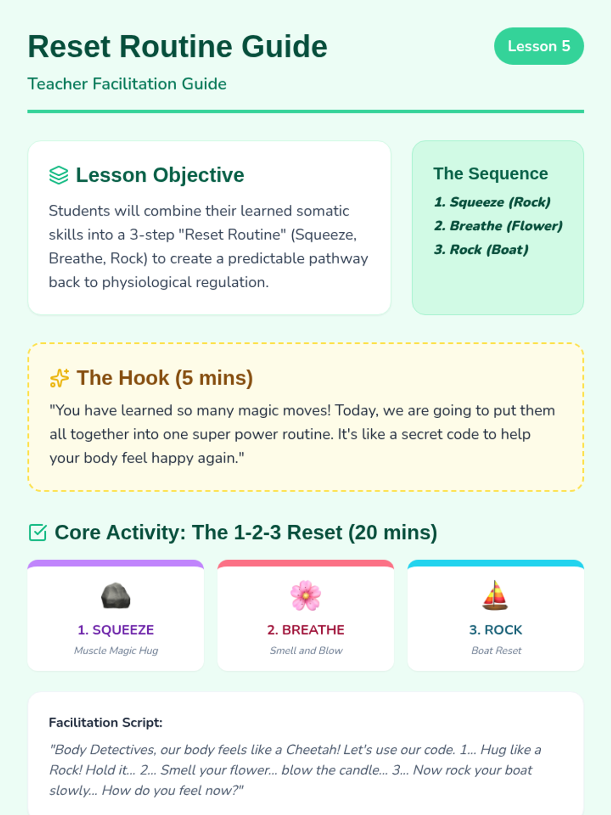 A 5-lesson sequence for Pre-K students focused on somatic awareness and physiological regulation strategies. Students learn to identify 'fast' and 'slow' body states and practice specific physical techniques (squeezing, breathing, rocking) to recover from dysregulation.