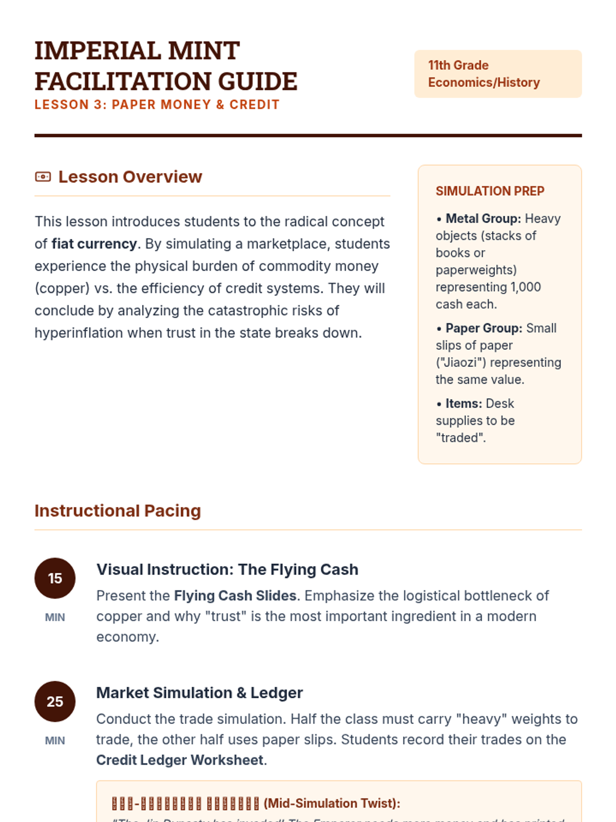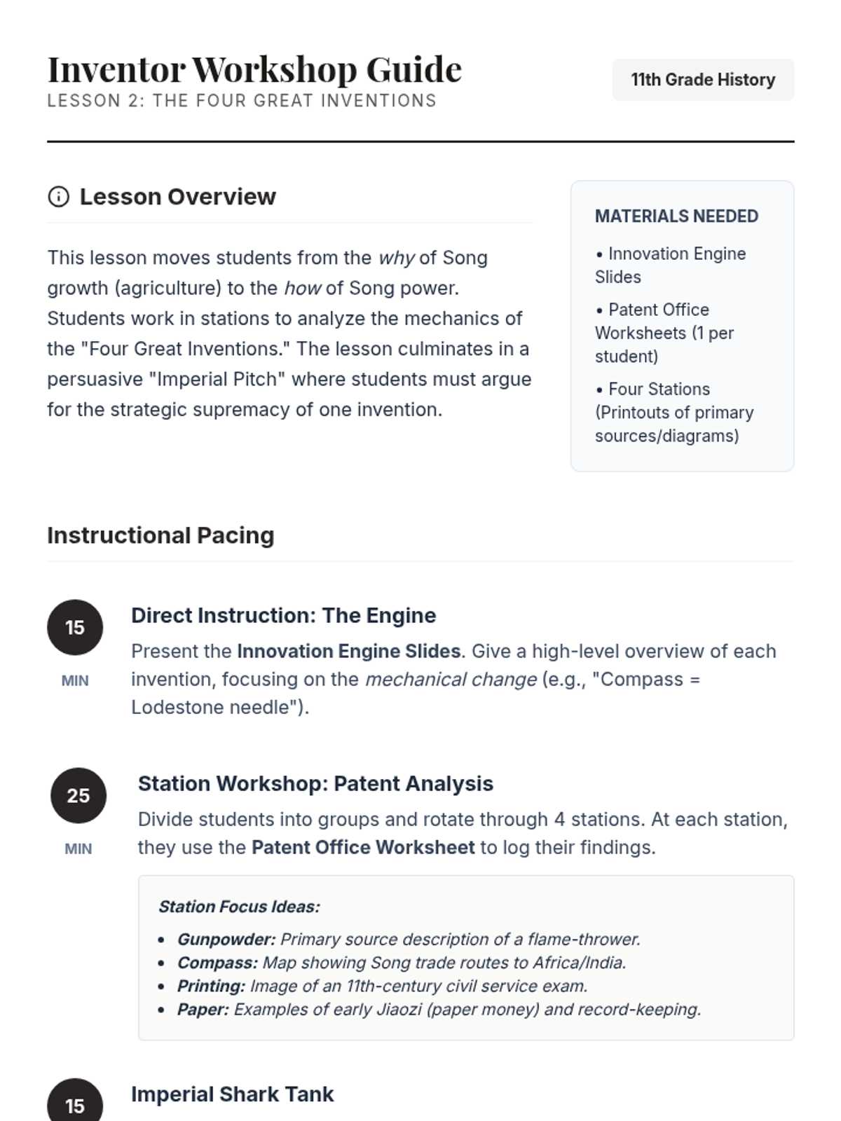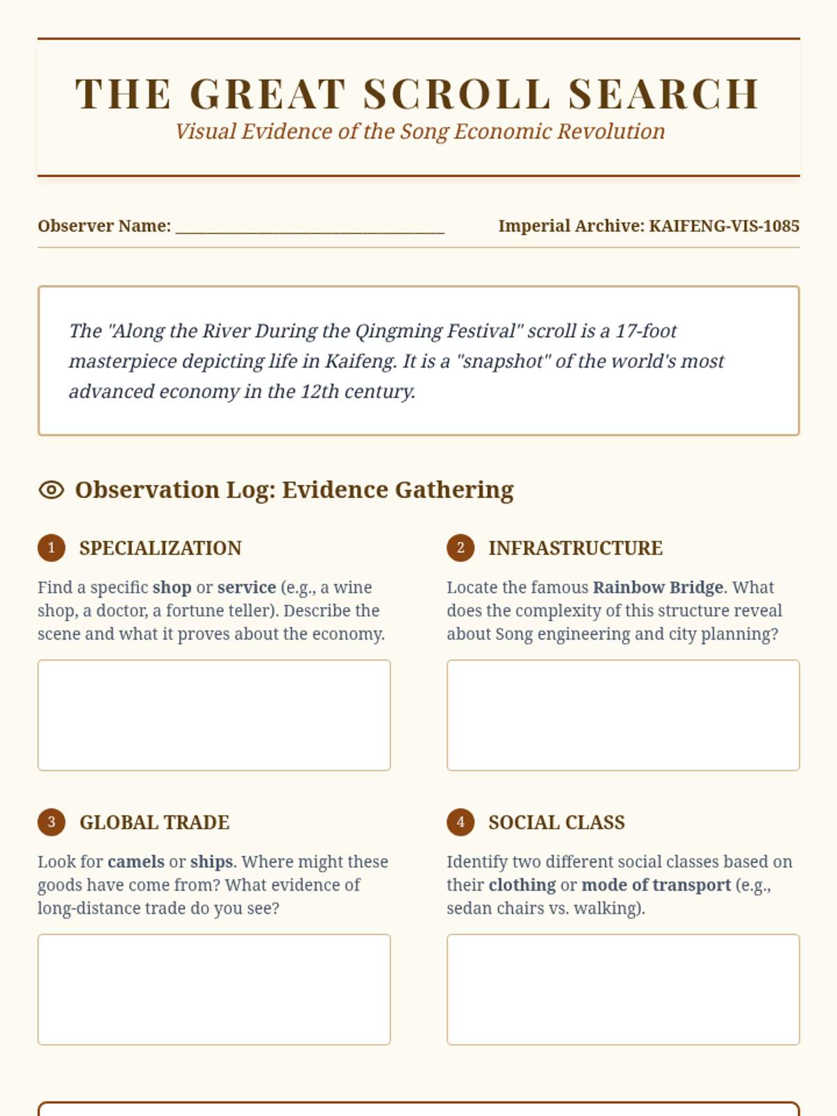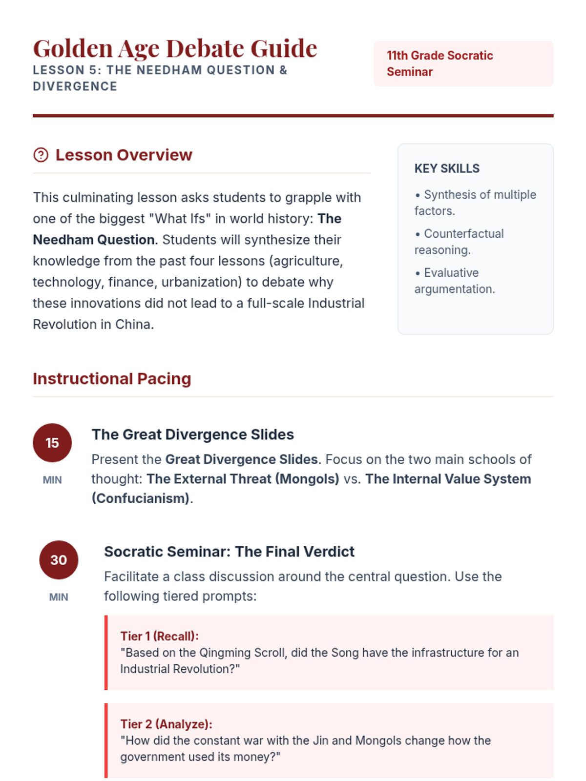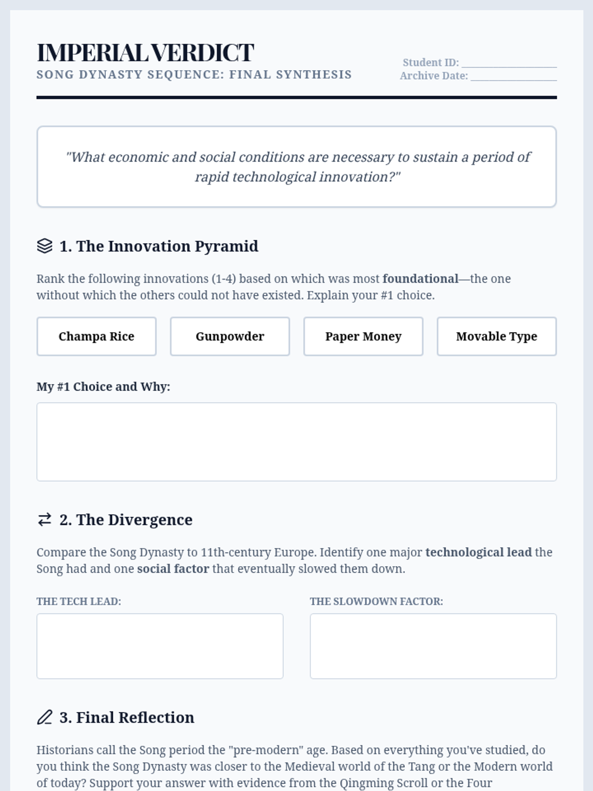 This 5-lesson sequence explores the 'Song Dynasty Economic Revolution,' analyzing the technological and economic innovations that placed China at the forefront of global development. Students examine agricultural breakthroughs, the 'Four Great Inventions,' financial systems like paper money, and the urbanization depicted in the Qingming Scroll to understand the conditions required for rapid innovation.