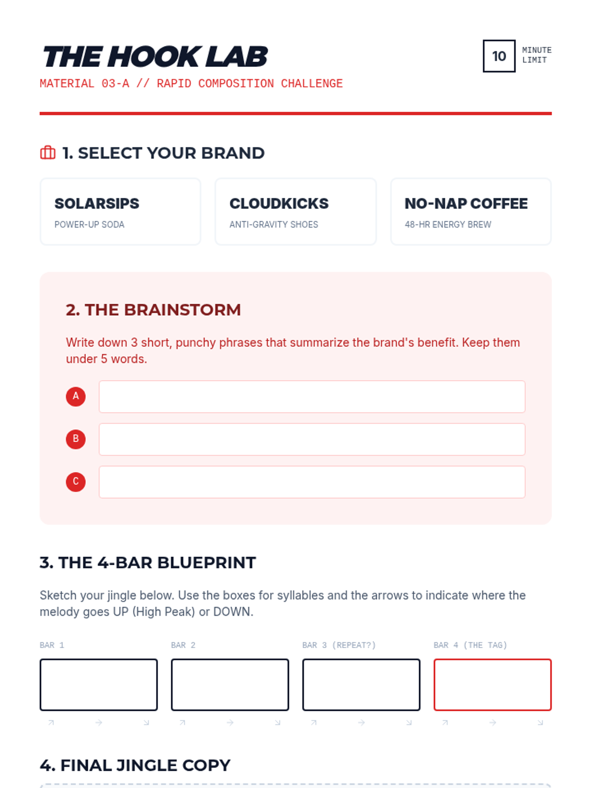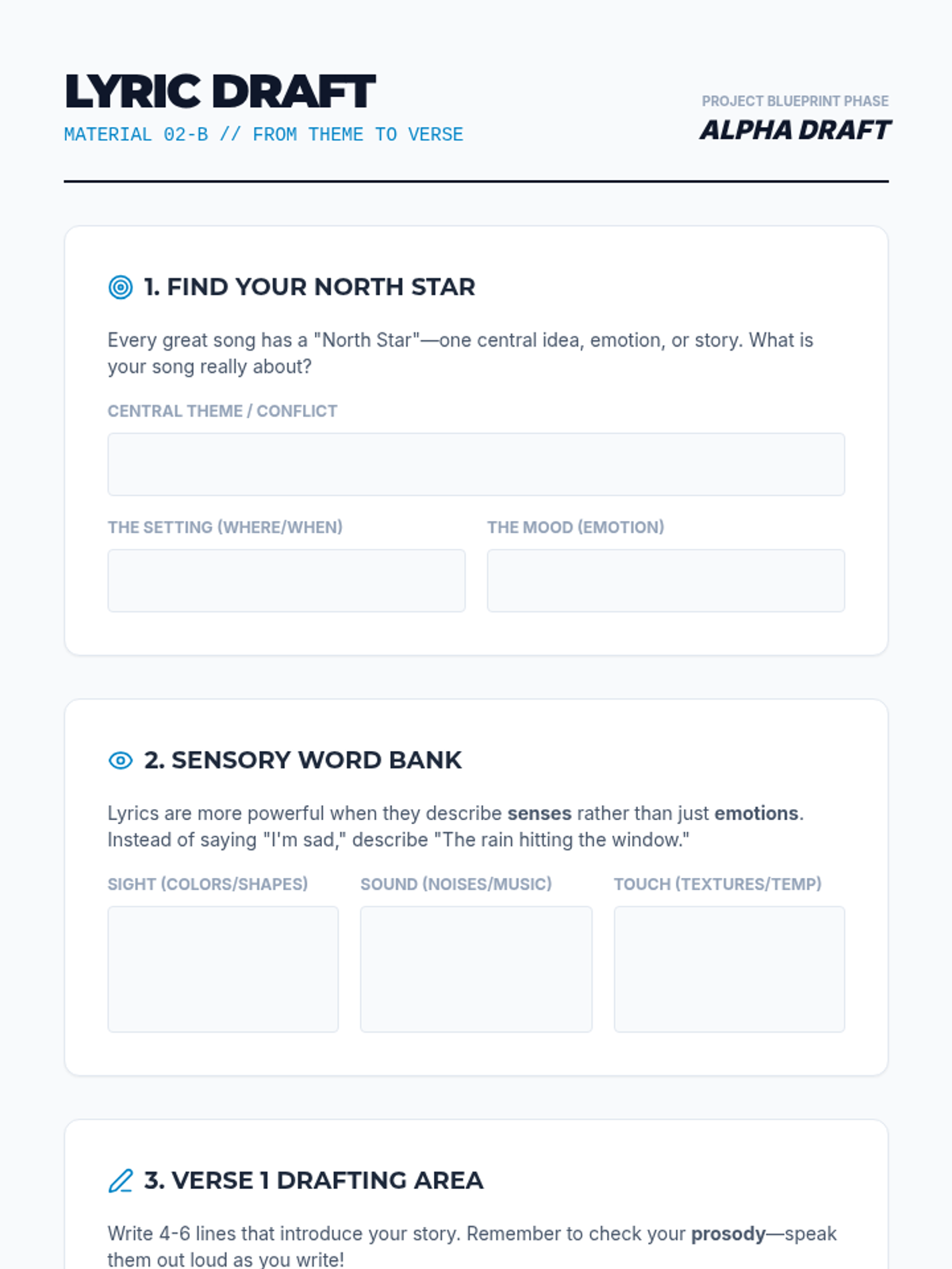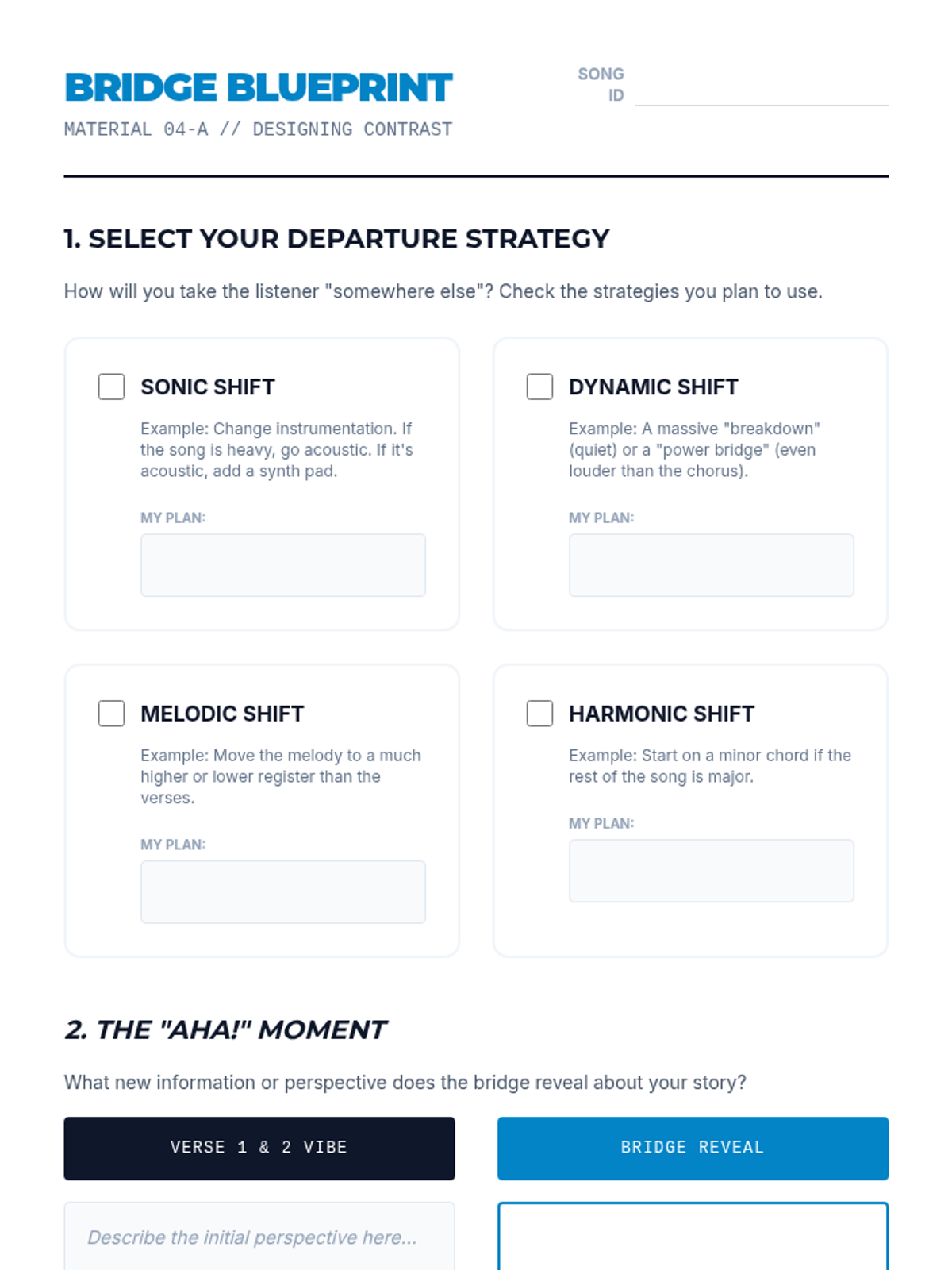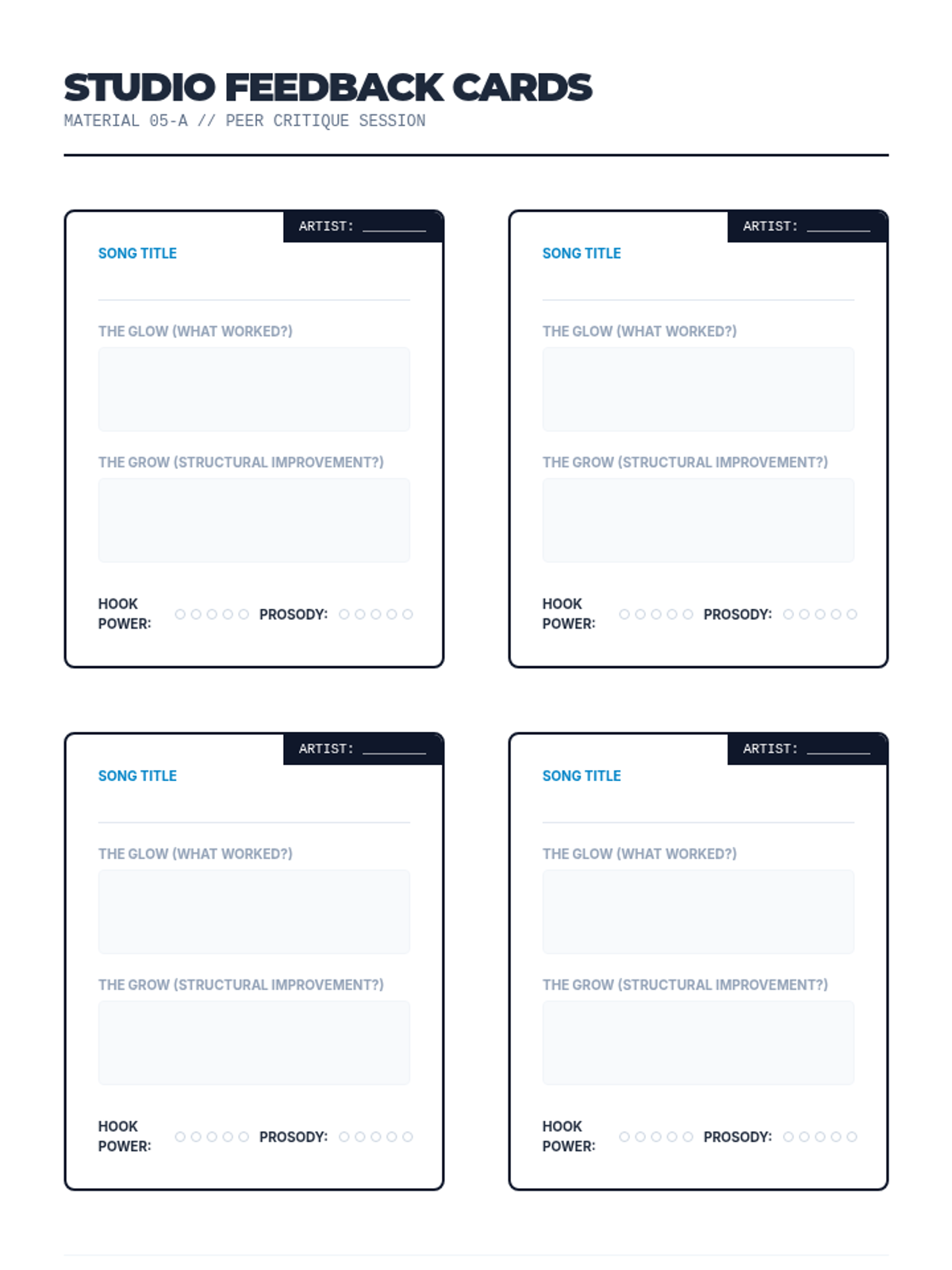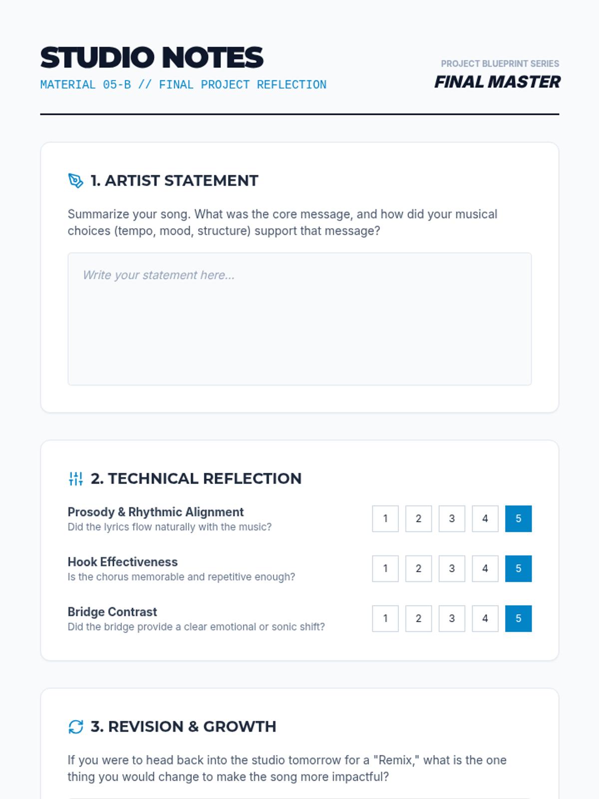 A comprehensive songwriting sequence that guides 10th-grade students through the structural and lyrical elements of composition, culminating in an original song. Students learn to map song energy, master prosody, craft catchy hooks, and design impactful bridges.