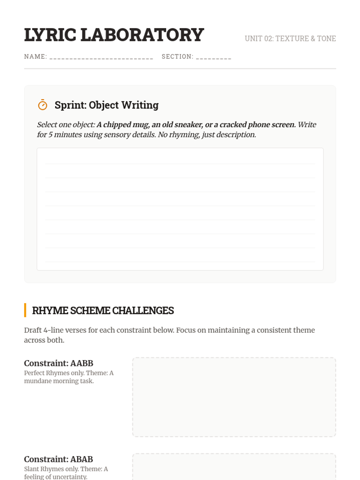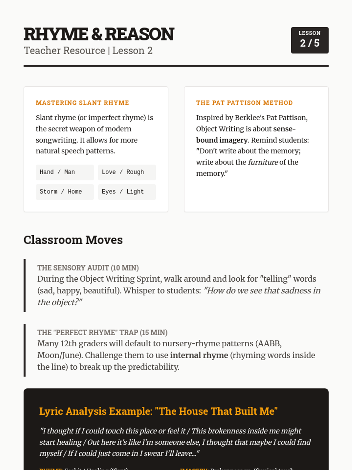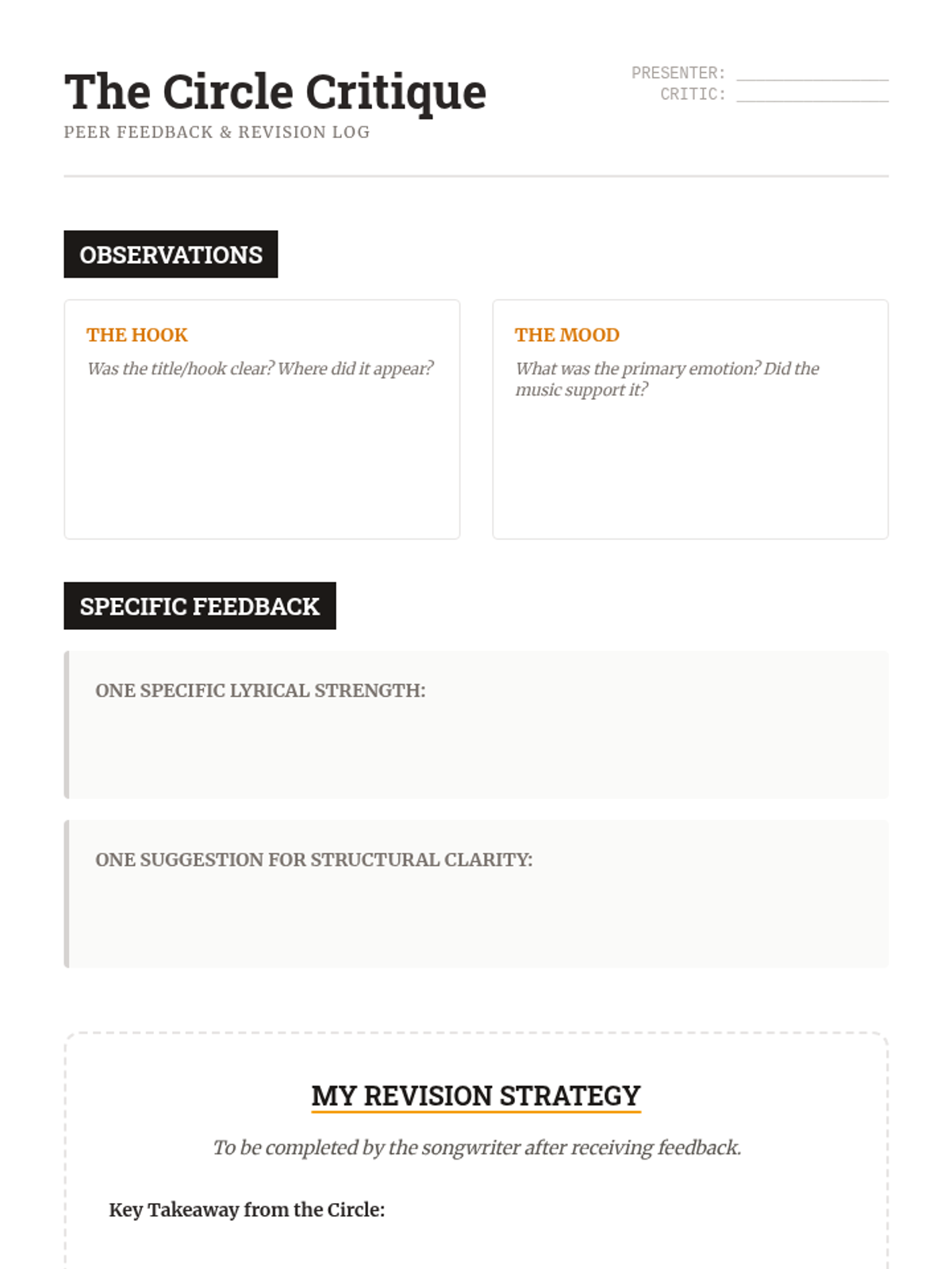 A comprehensive 12th-grade songwriter's workshop focusing on the intersection of structure, lyricism, melody, and harmony. Students move from analytical deconstruction of popular forms to the creation and peer-review of original compositions.