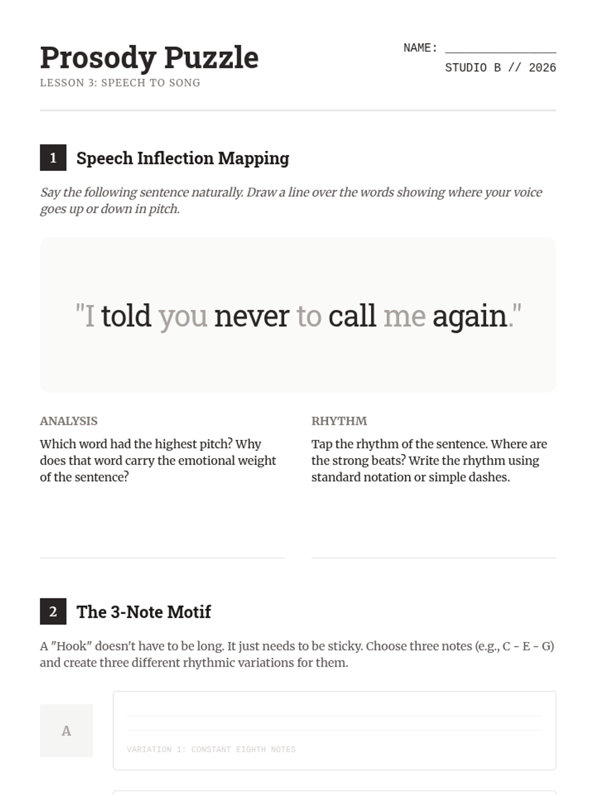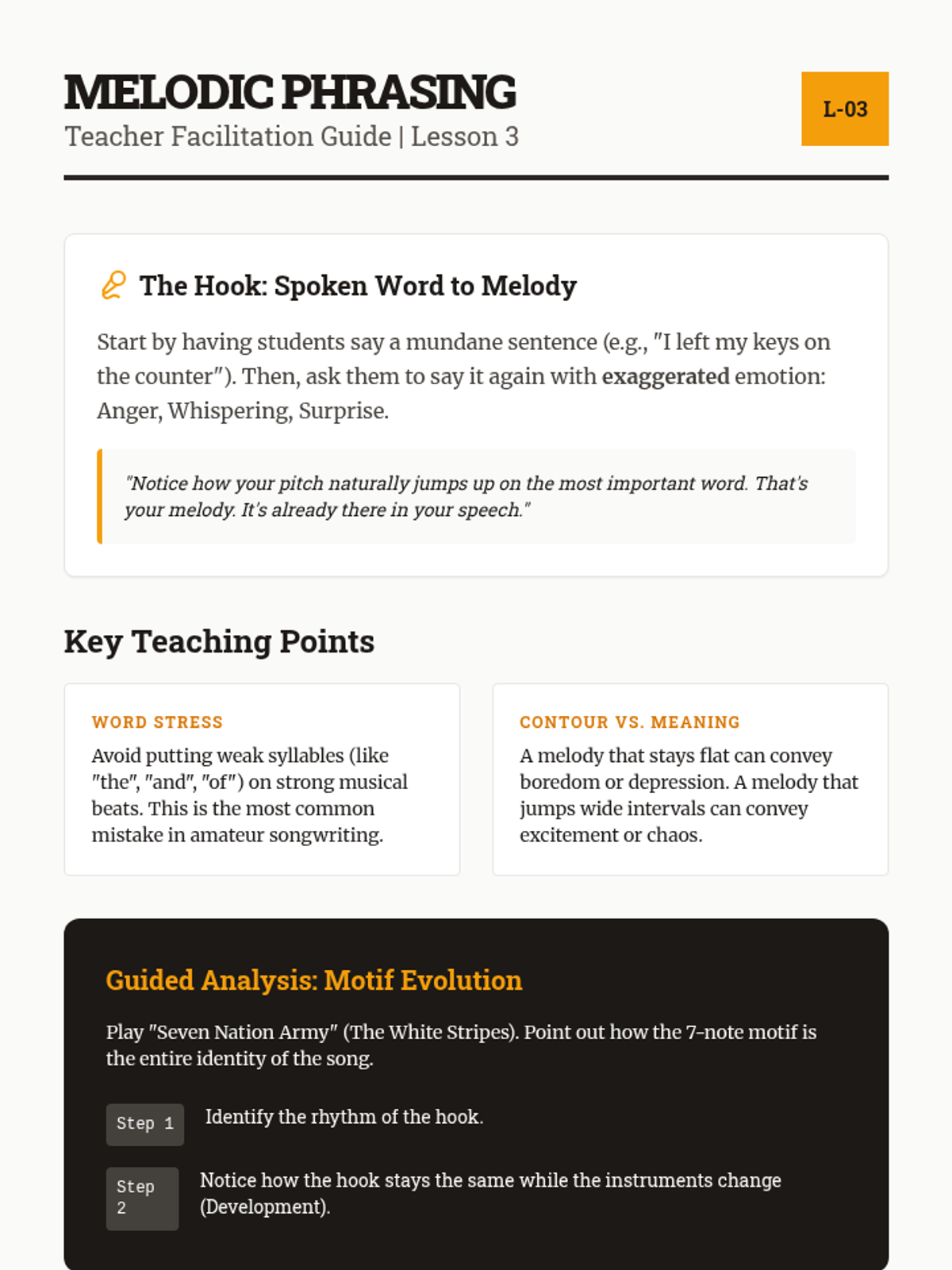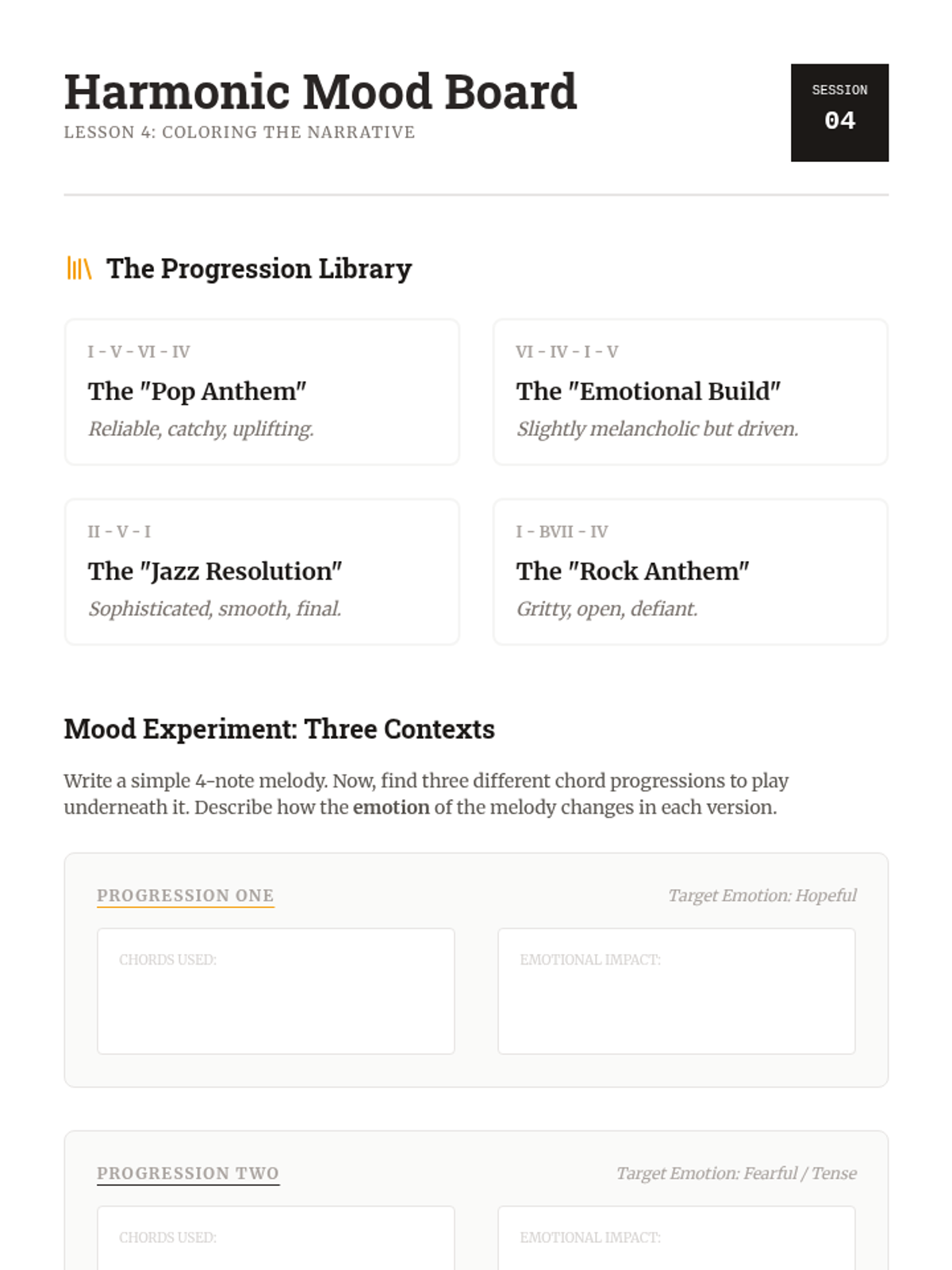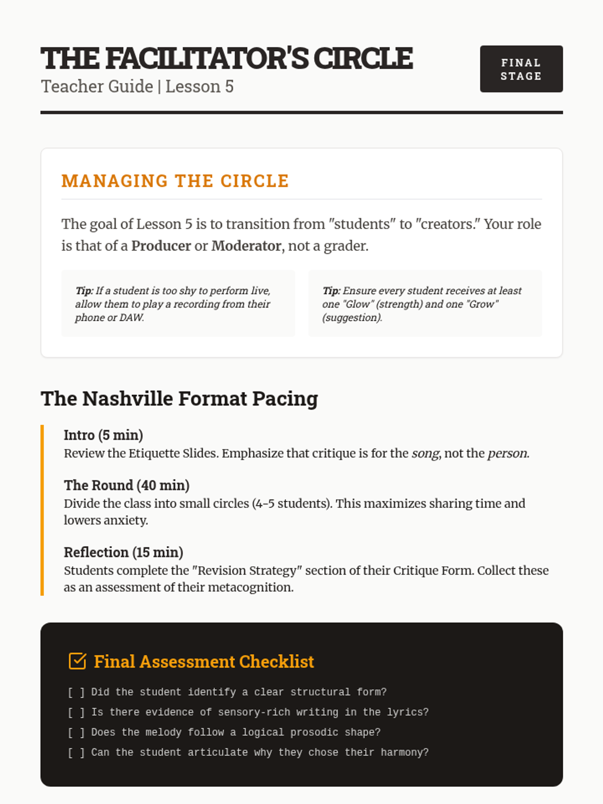 A comprehensive 12th-grade songwriter's workshop focusing on the intersection of structure, lyricism, melody, and harmony. Students move from analytical deconstruction of popular forms to the creation and peer-review of original compositions.