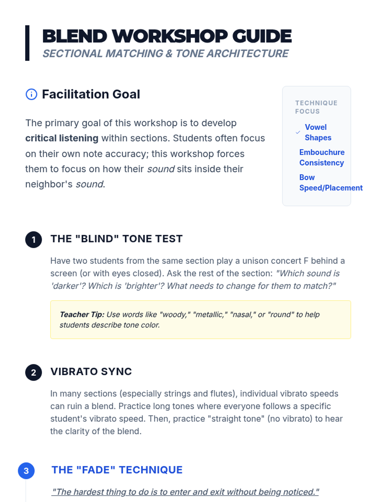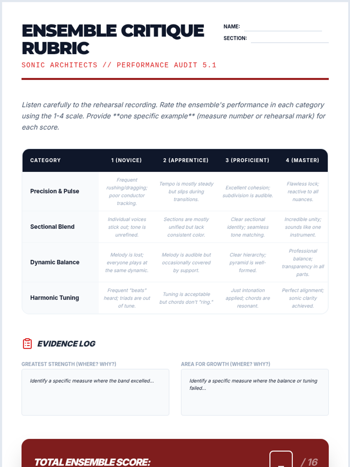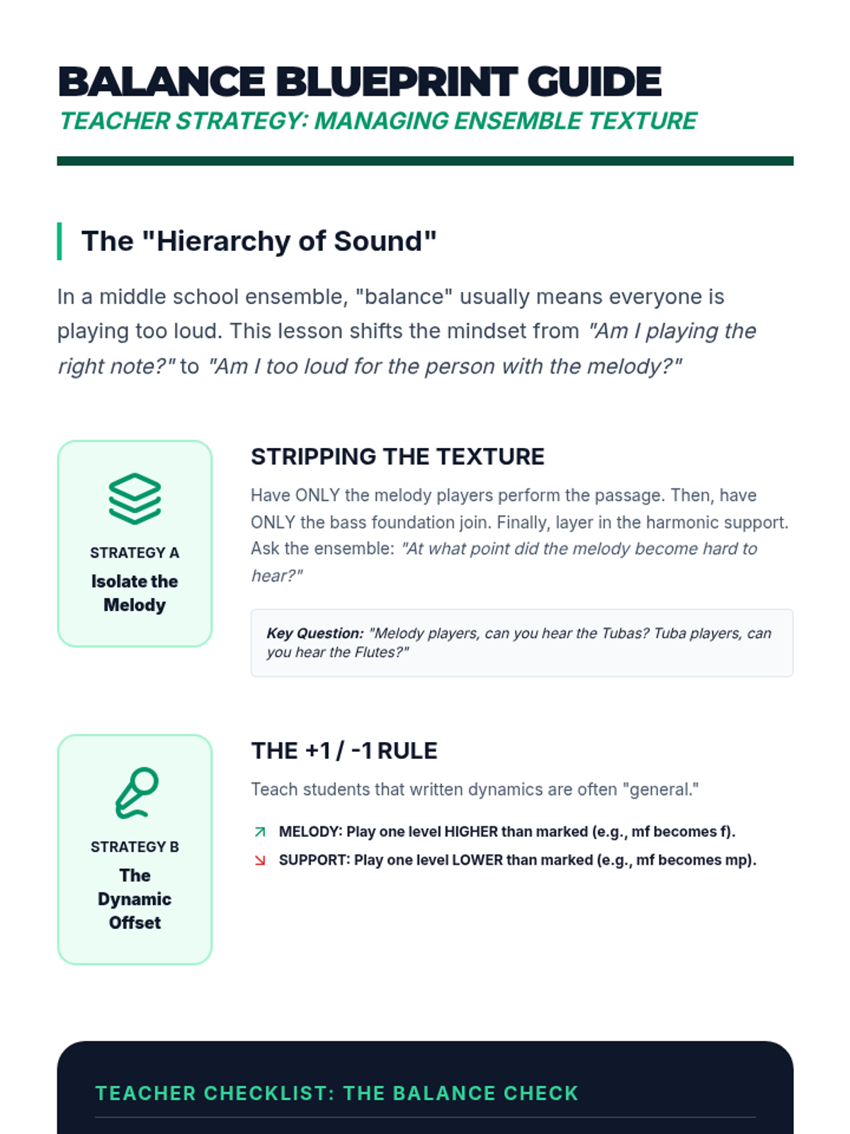 A comprehensive 8th-grade music sequence focusing on ensemble cohesion, balance, and critical listening skills. Students transition from individual contributors to integral parts of a unified sonic structure through exercises in pulse, blend, intonation, and dynamic hierarchy.