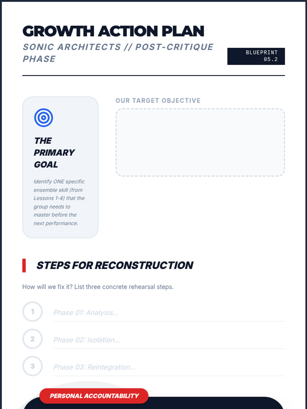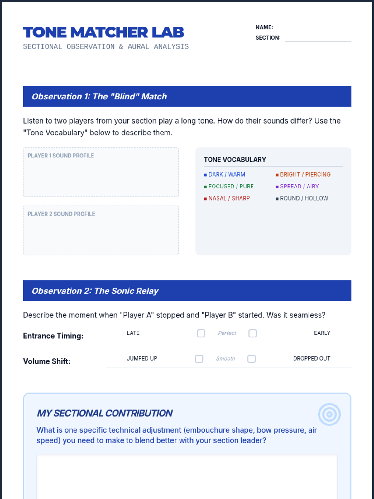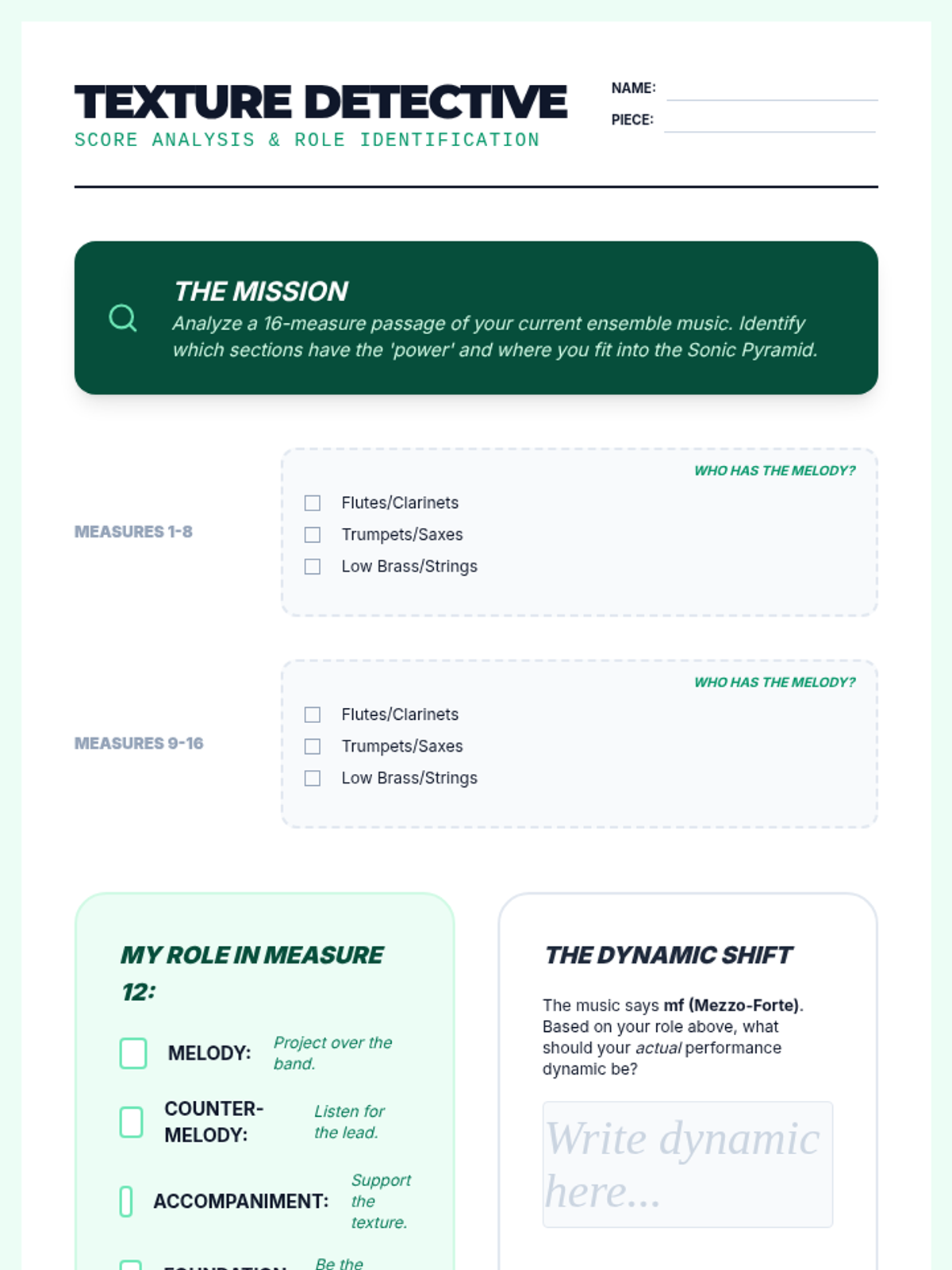 A comprehensive 8th-grade music sequence focusing on ensemble cohesion, balance, and critical listening skills. Students transition from individual contributors to integral parts of a unified sonic structure through exercises in pulse, blend, intonation, and dynamic hierarchy.