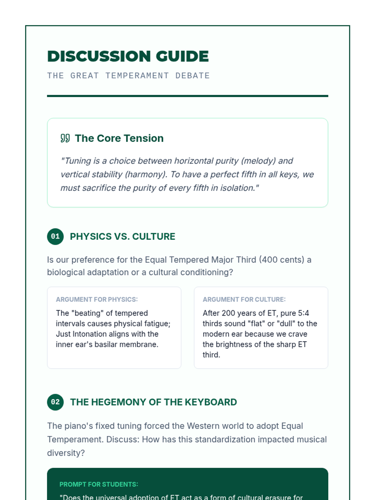 A graduate-level exploration of music fundamentals through the lens of acoustics, psychoacoustics, and tuning systems. Students investigate the physics of sound, frequency ratios, and the historical evolution of scales from Pythagorean to Equal Temperament.
