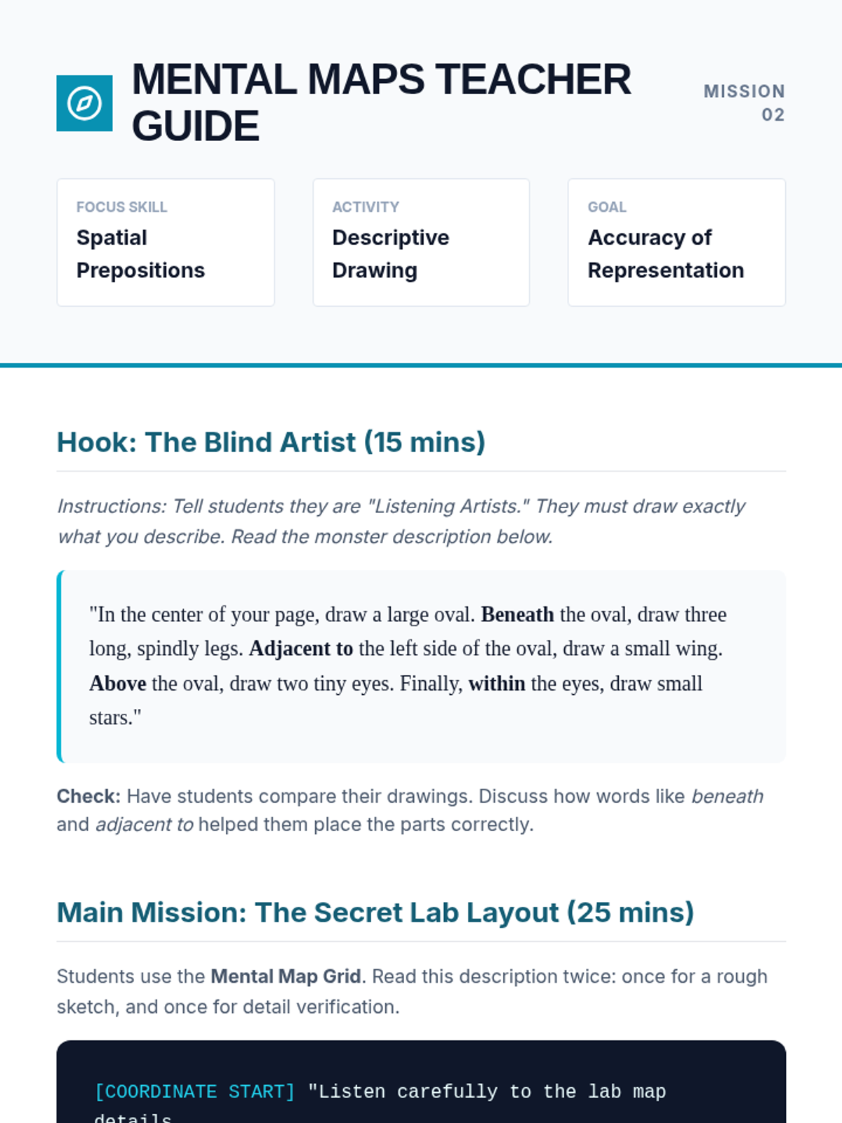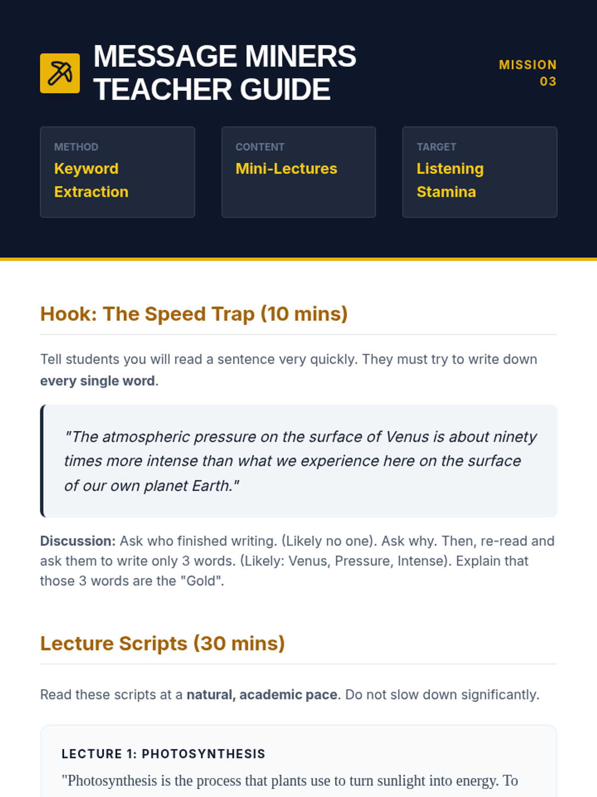 This 5th-grade ESL listening sequence focuses on academic readiness by training students to decode complex, multi-step instructions and academic lectures. Students will master signal words, spatial visualization, keyword note-taking, and natural speech reductions through a series of "Listening Agent" missions.