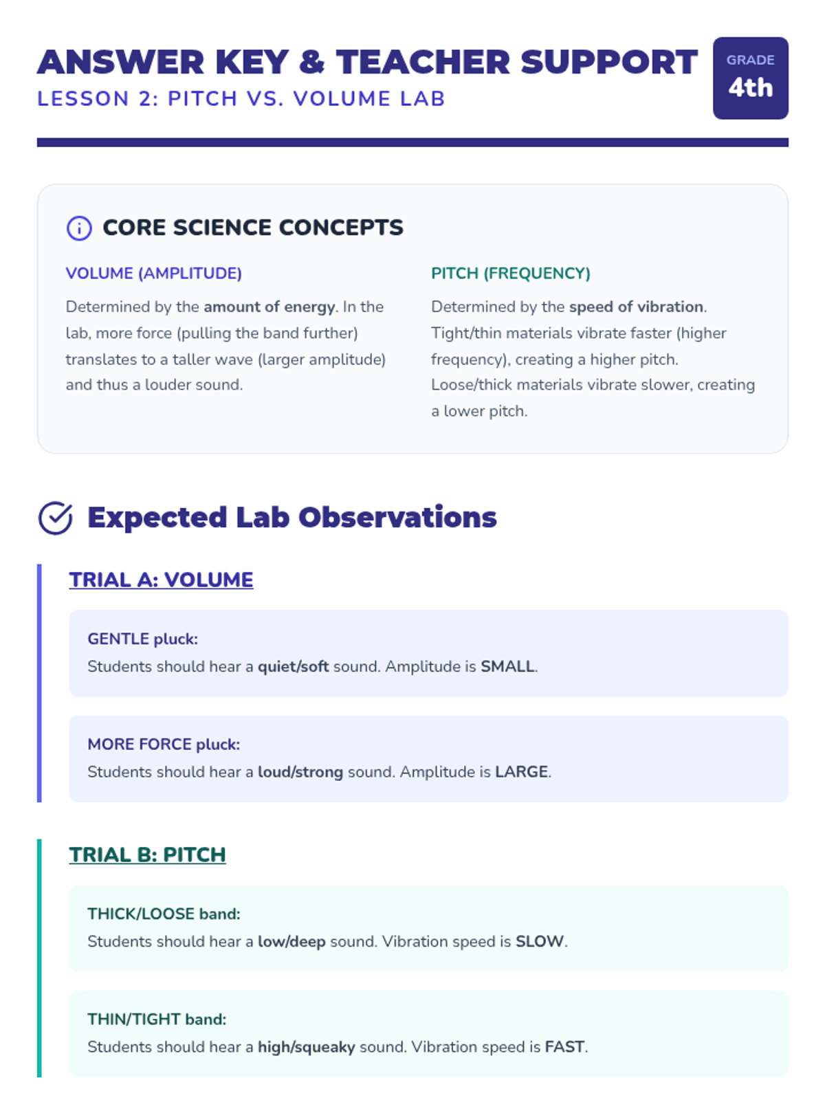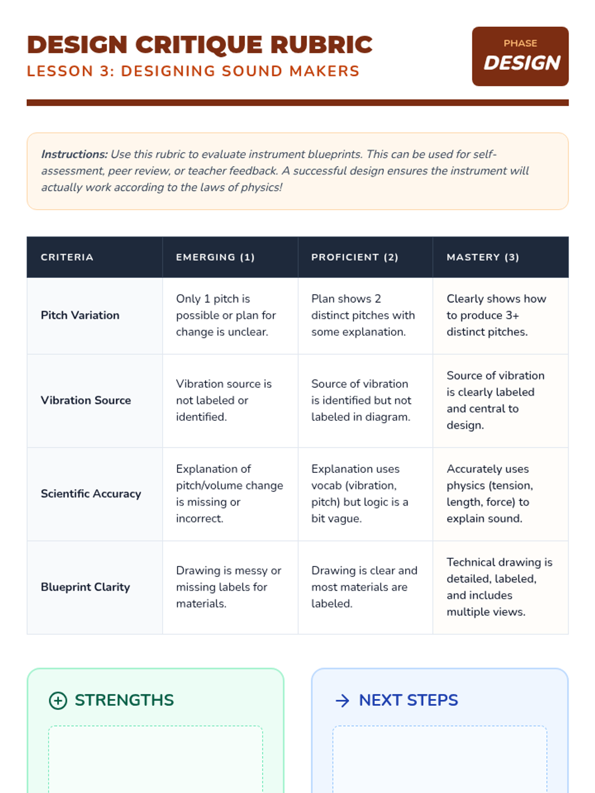 Students investigate the physics of sound, focusing on the relationship between vibration, volume, and pitch. The sequence utilizes a project-based approach where students design and test musical instruments to apply their understanding of wave properties. Learners explore how changing the physical characteristics of an object alters the sound waves it produces. The unit concludes with an acoustic engineering showcase.