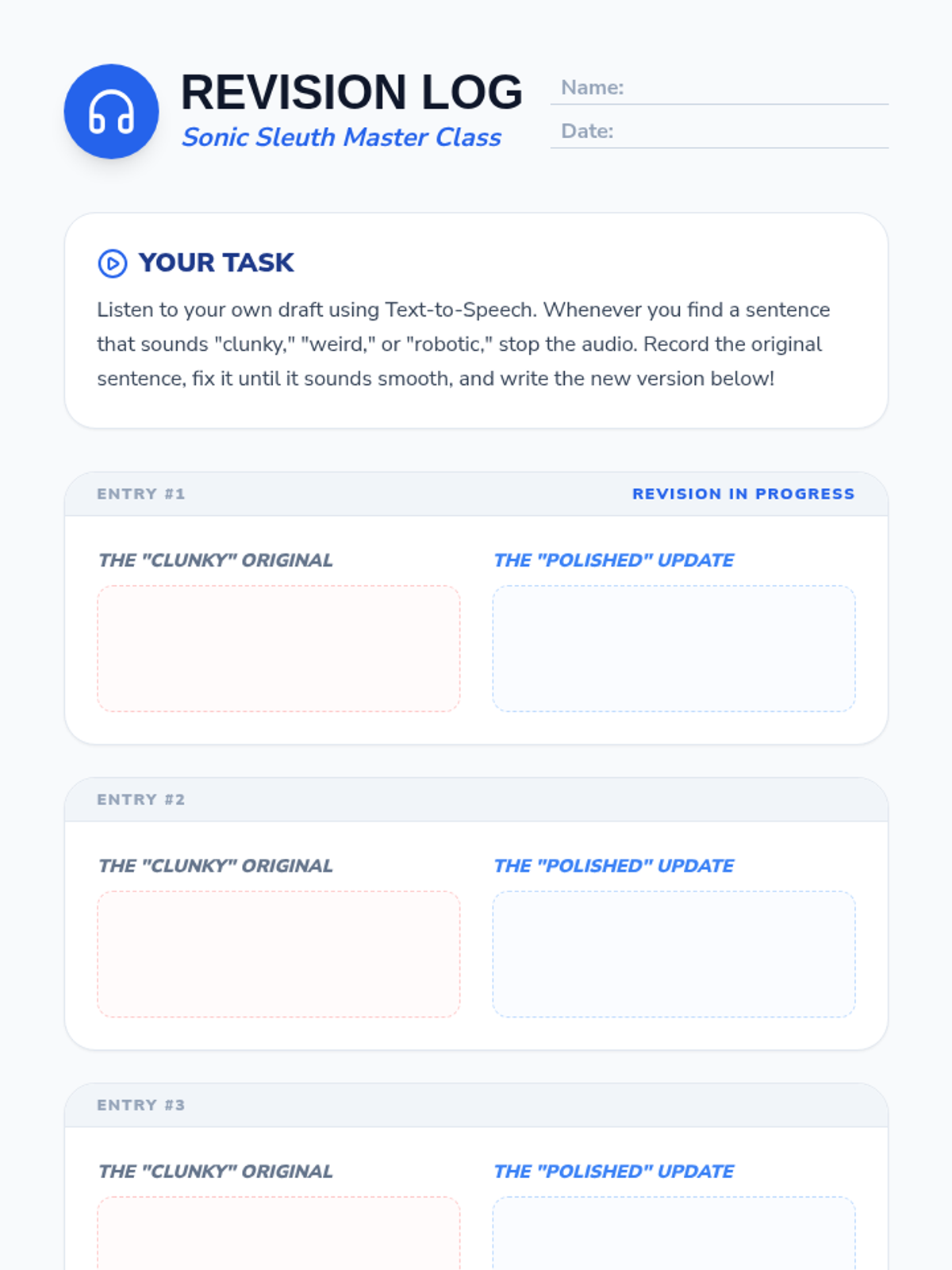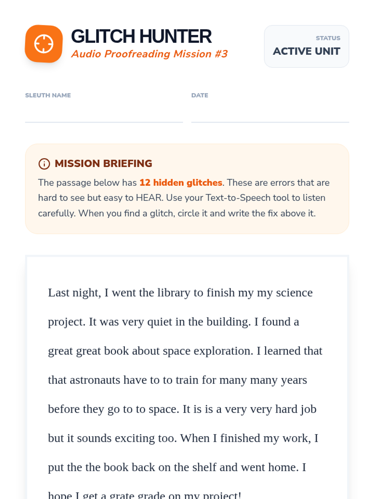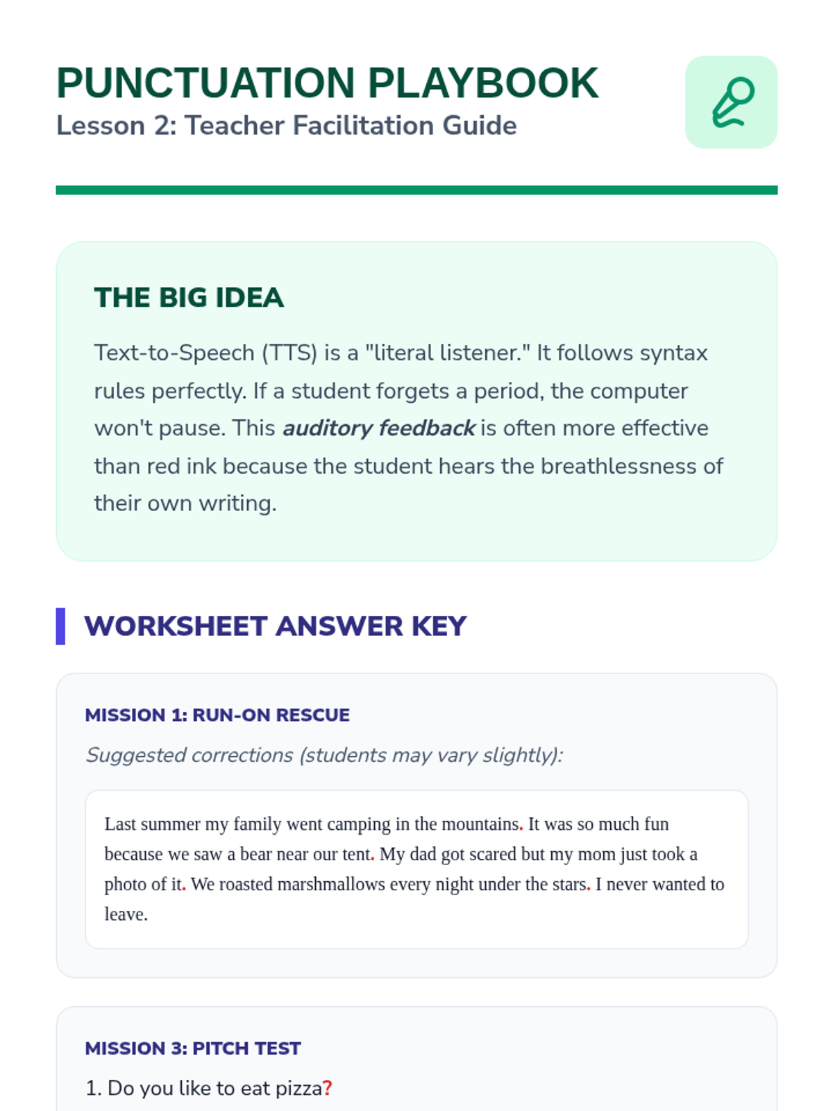 This sequence teaches 5th-grade students how to leverage Text-to-Speech (TTS) technology as a powerful revision and proofreading tool. Students transition from using TTS as a reading accommodation to using it as an active editing strategy, discovering how hearing their own writing helps identify errors that the eye often misses.