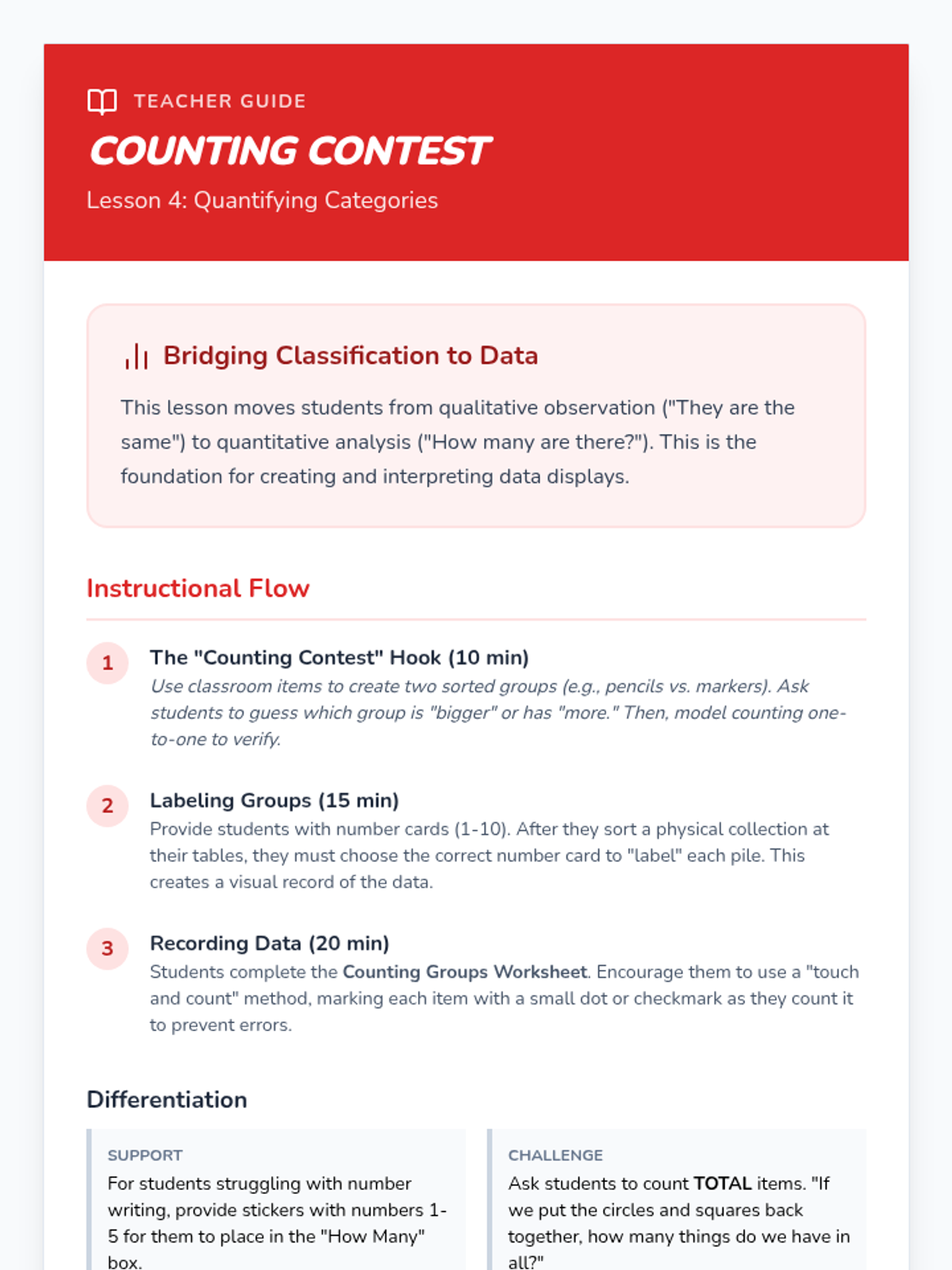 This sequence introduces Kindergarten students to sorting and classifying objects by attributes. They learn to group items by color, shape, size, and texture, explore flexible thinking by re-sorting the same set, and begin quantifying data by counting categories.