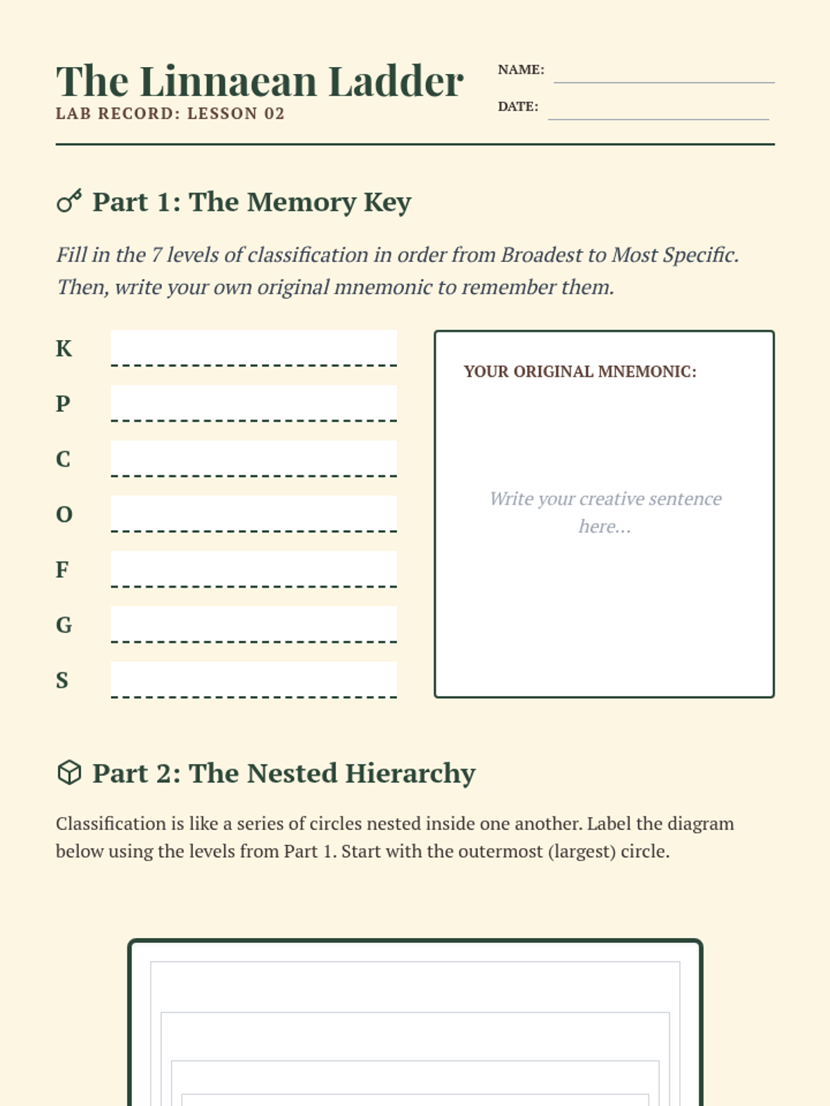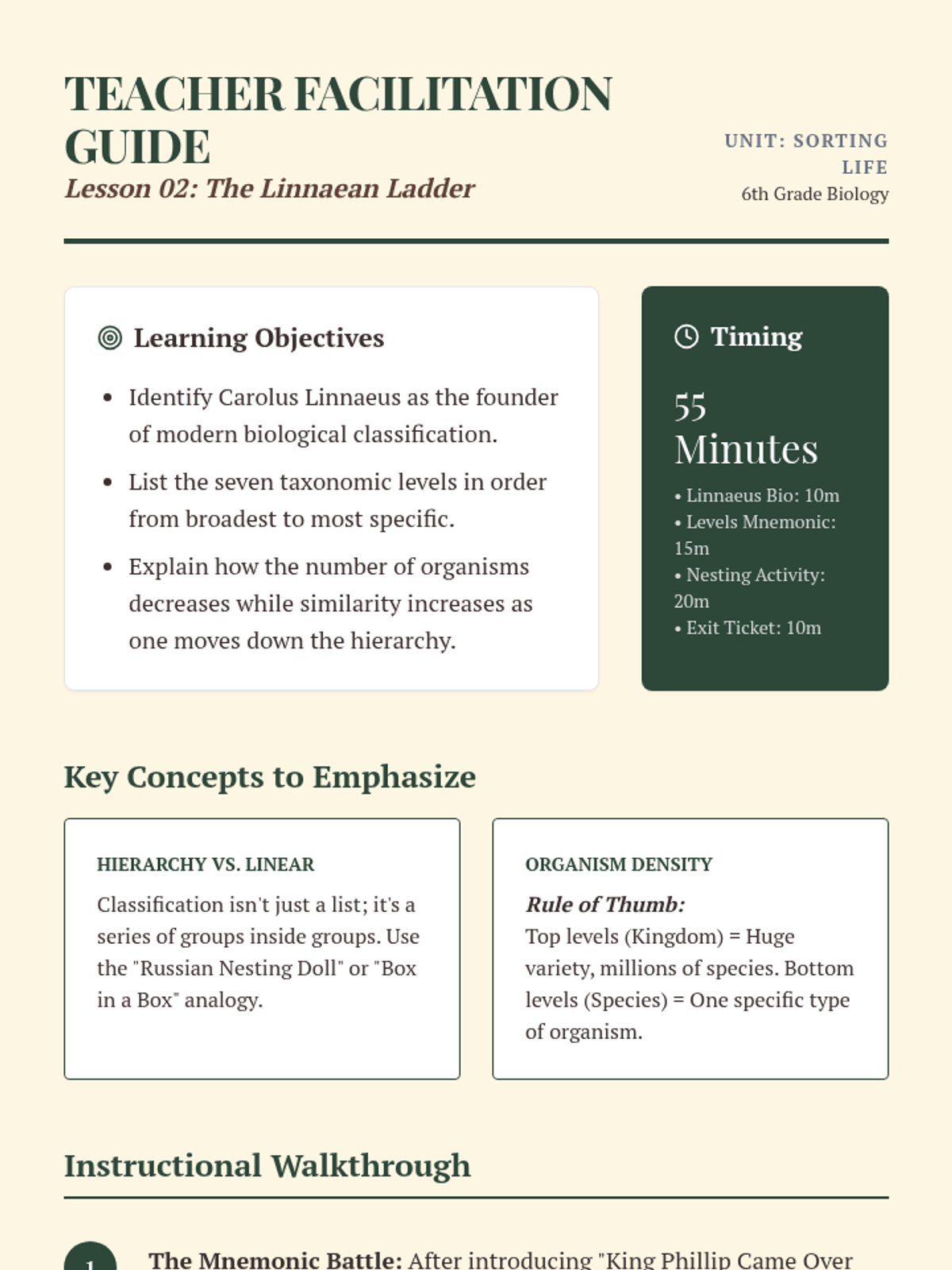 A comprehensive introduction to biological classification for 6th-grade students, moving from the basic logic of sorting everyday objects to the complexities of the Linnaean hierarchy and binomial nomenclature. Students explore the seven taxonomic levels and learn how scientific naming provides a universal language for biology.