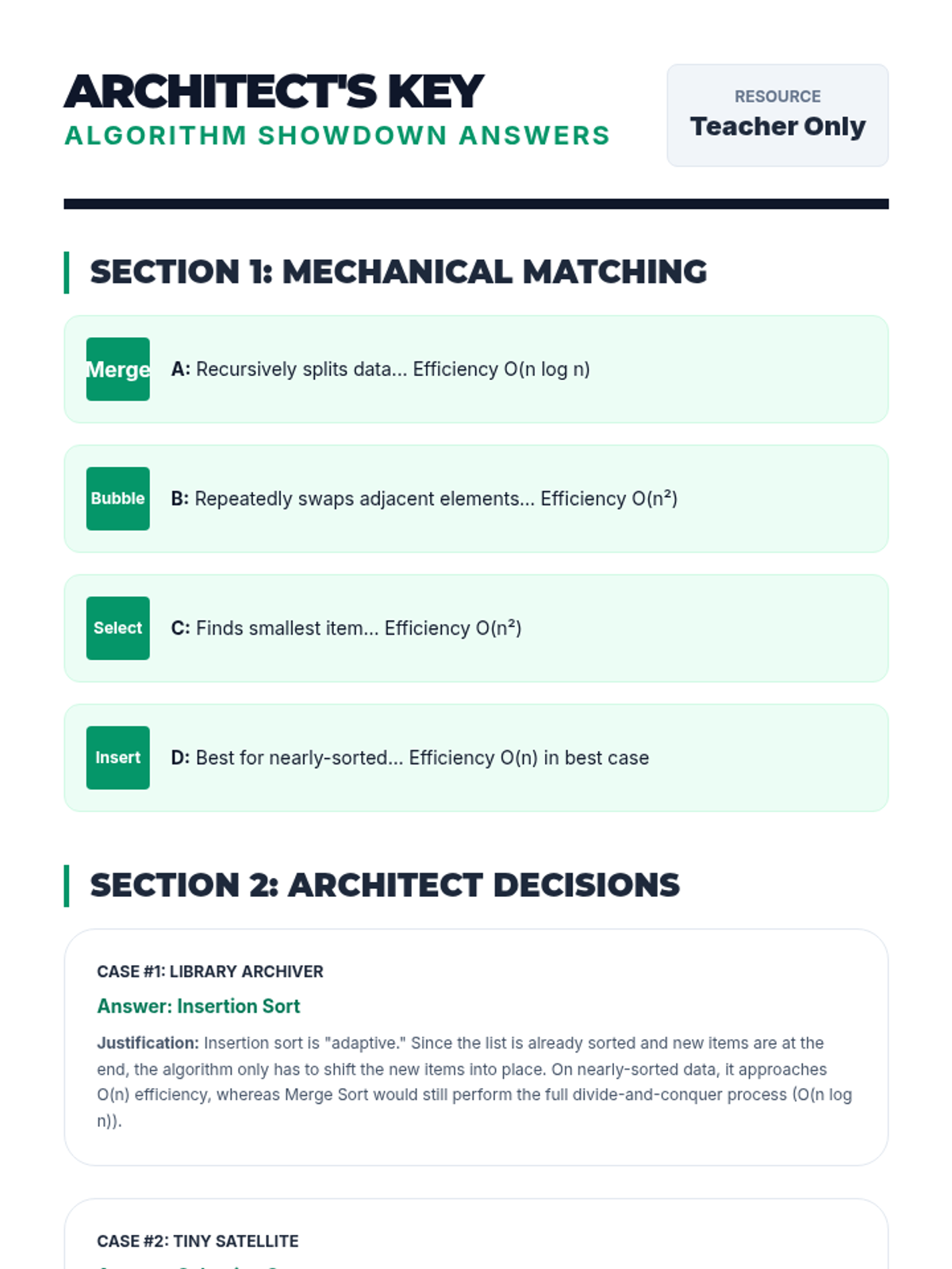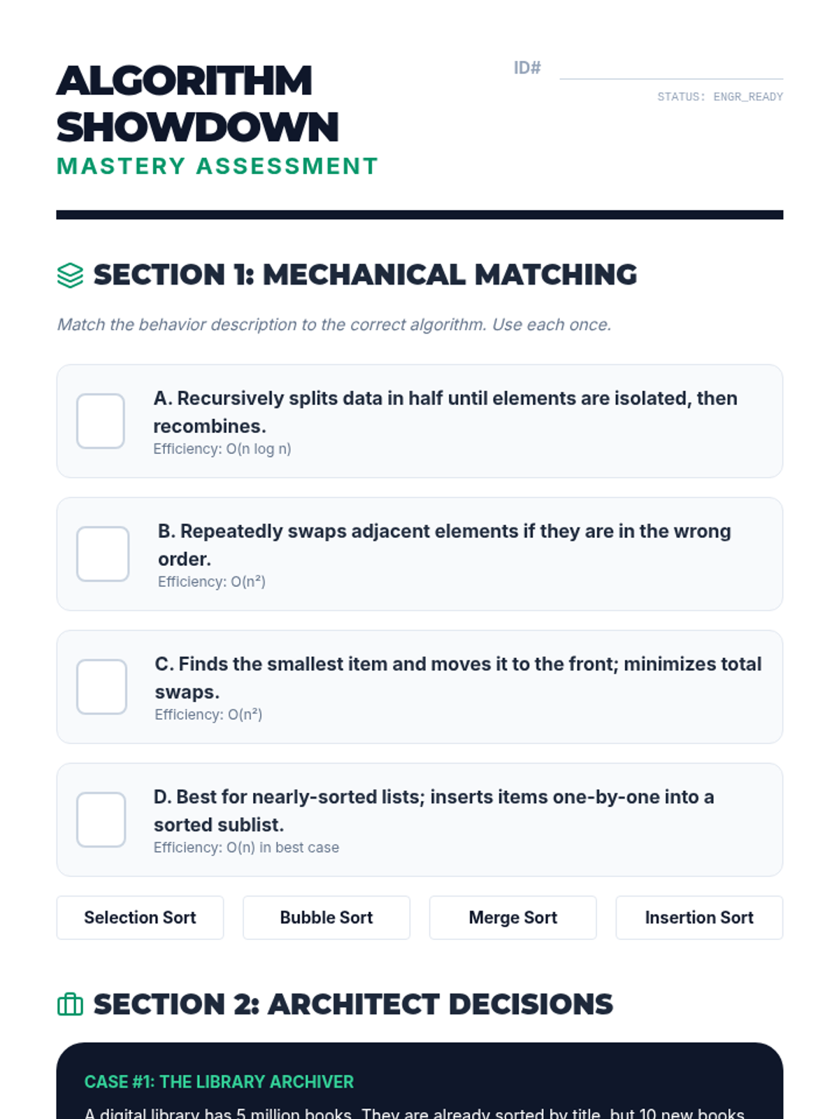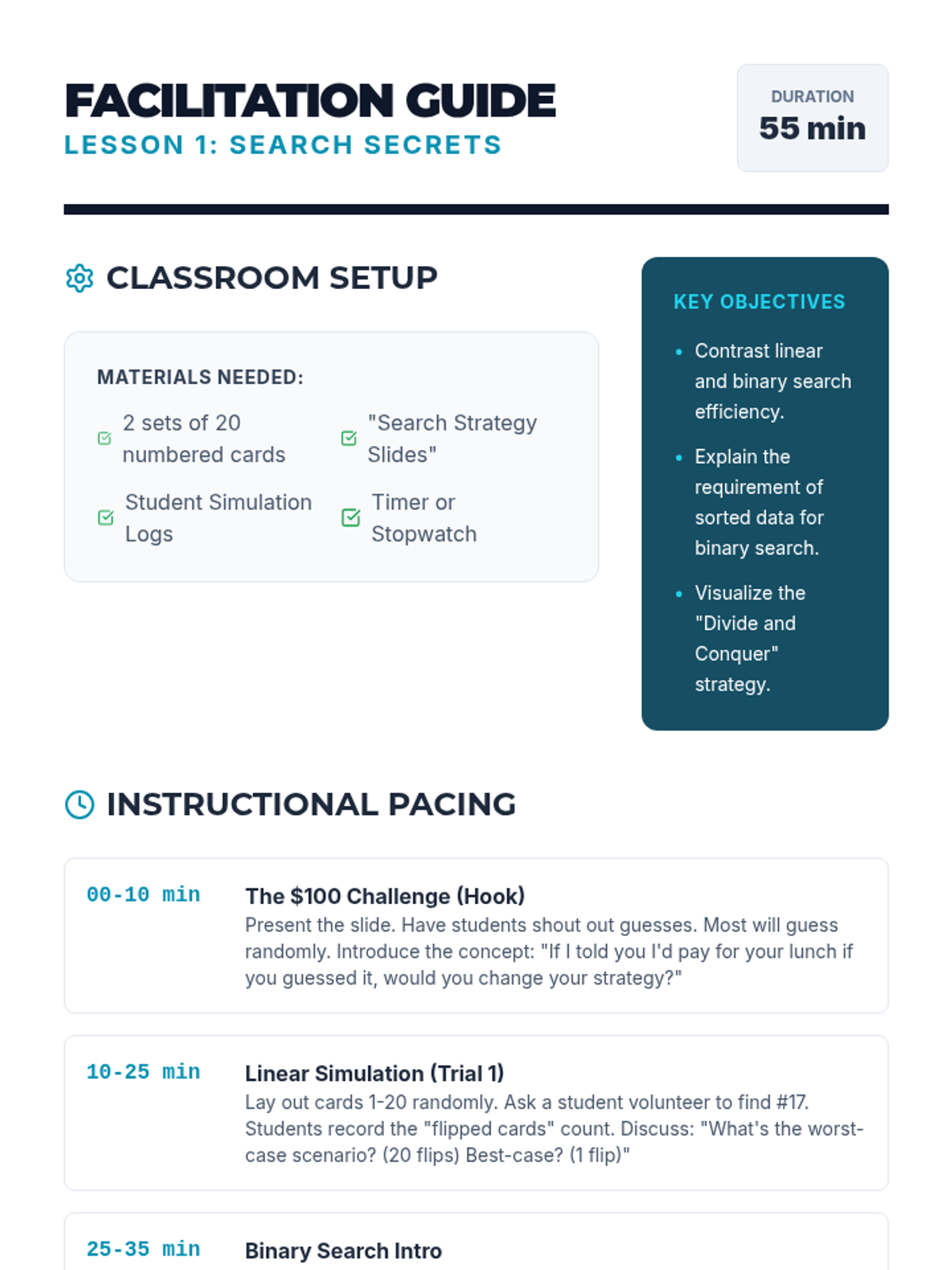 A comprehensive unit for 10th-grade students on searching and sorting algorithms. Students move from physical simulations to conceptual analysis, comparing linear and binary searches before diving into Bubble, Selection, Insertion, and Merge sorts to understand efficiency and algorithm selection.