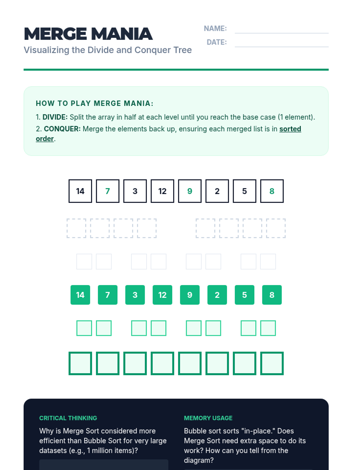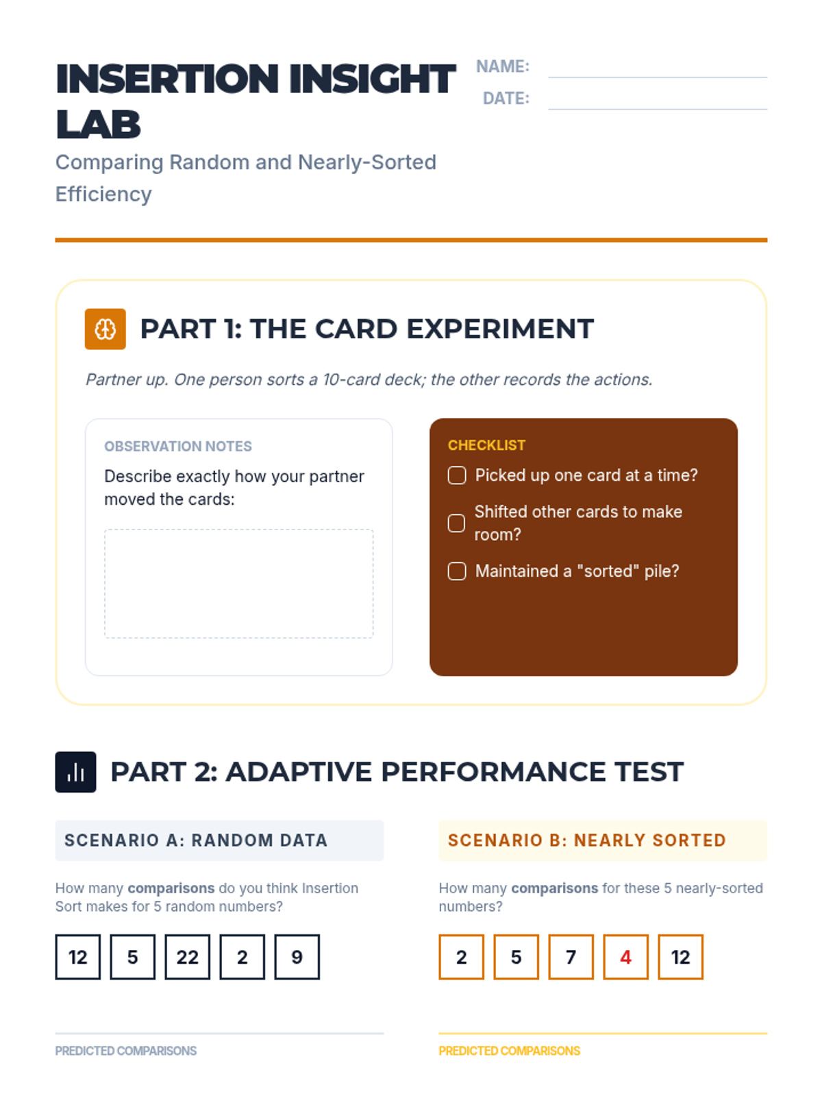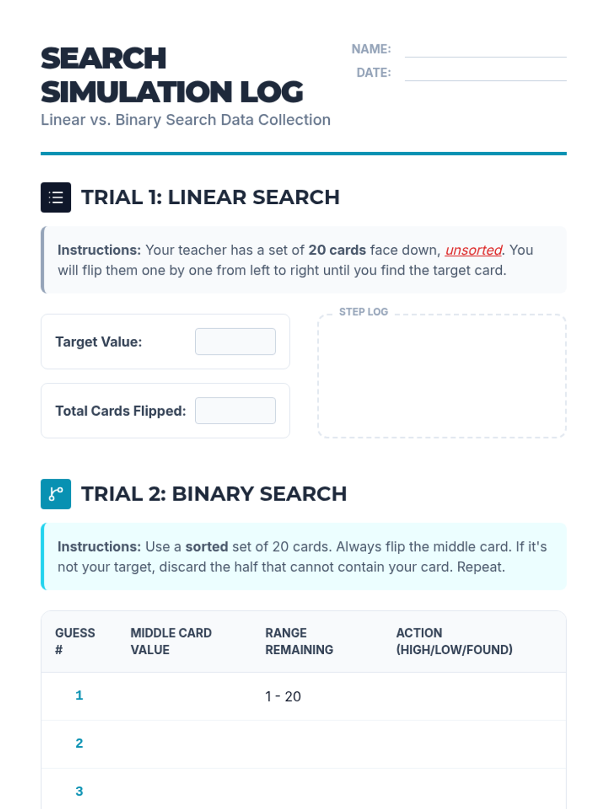 A comprehensive unit for 10th-grade students on searching and sorting algorithms. Students move from physical simulations to conceptual analysis, comparing linear and binary searches before diving into Bubble, Selection, Insertion, and Merge sorts to understand efficiency and algorithm selection.