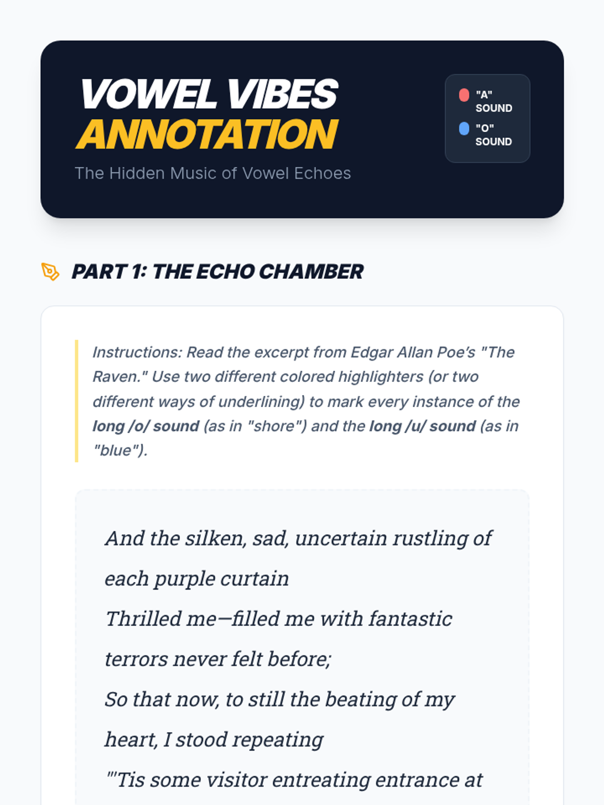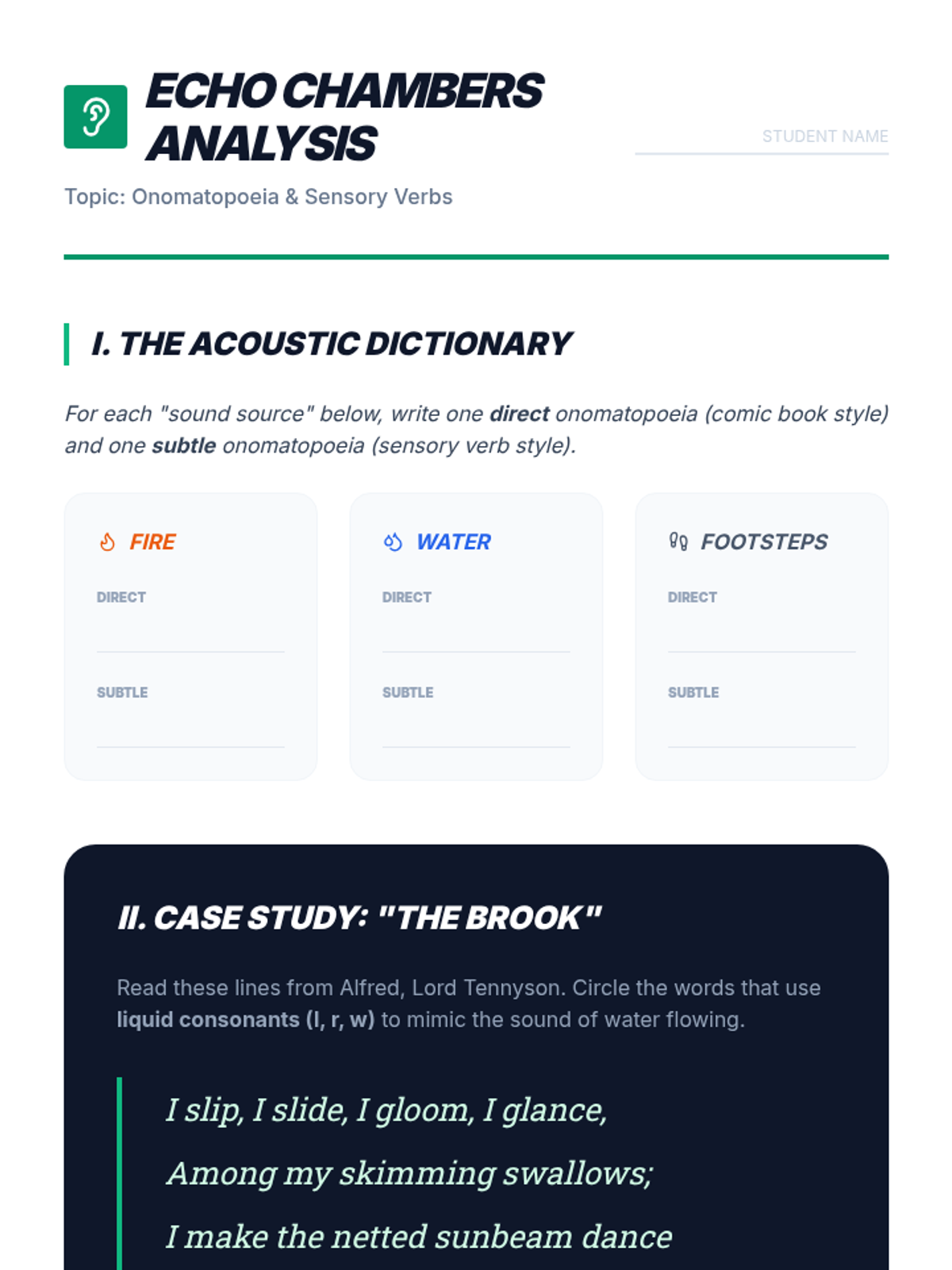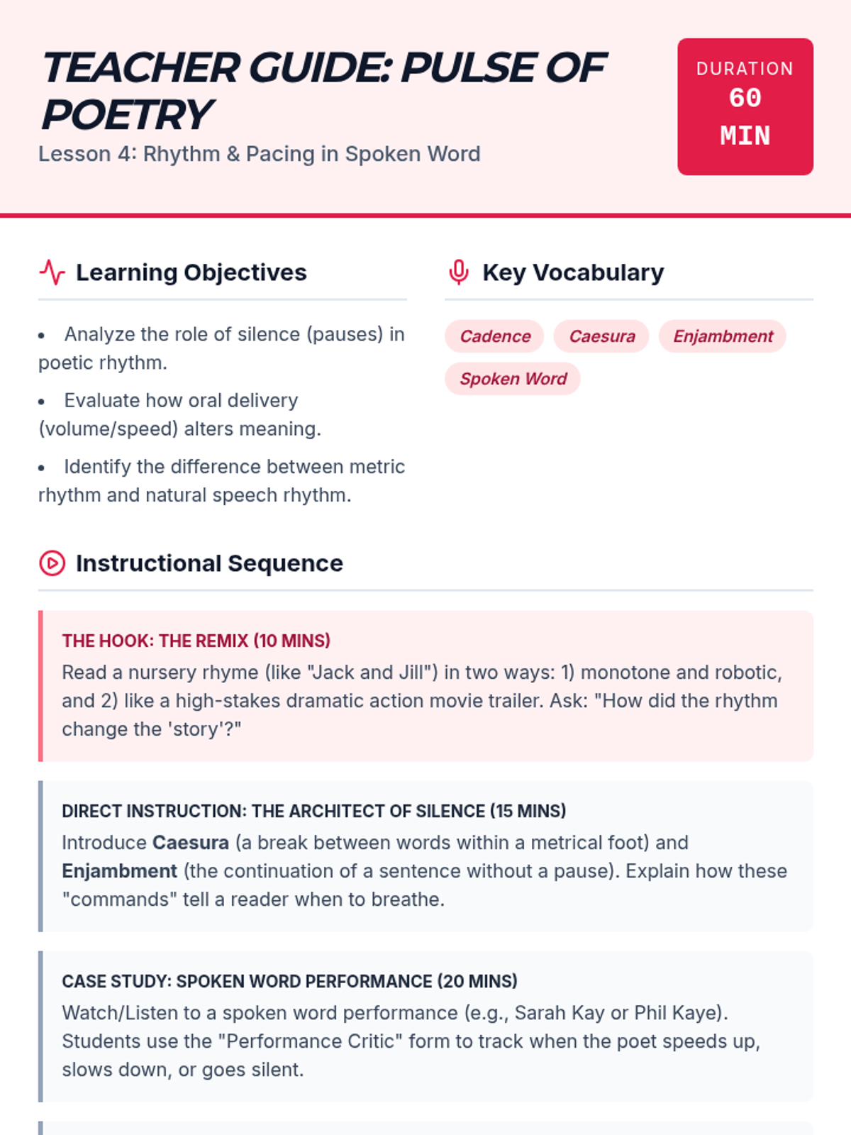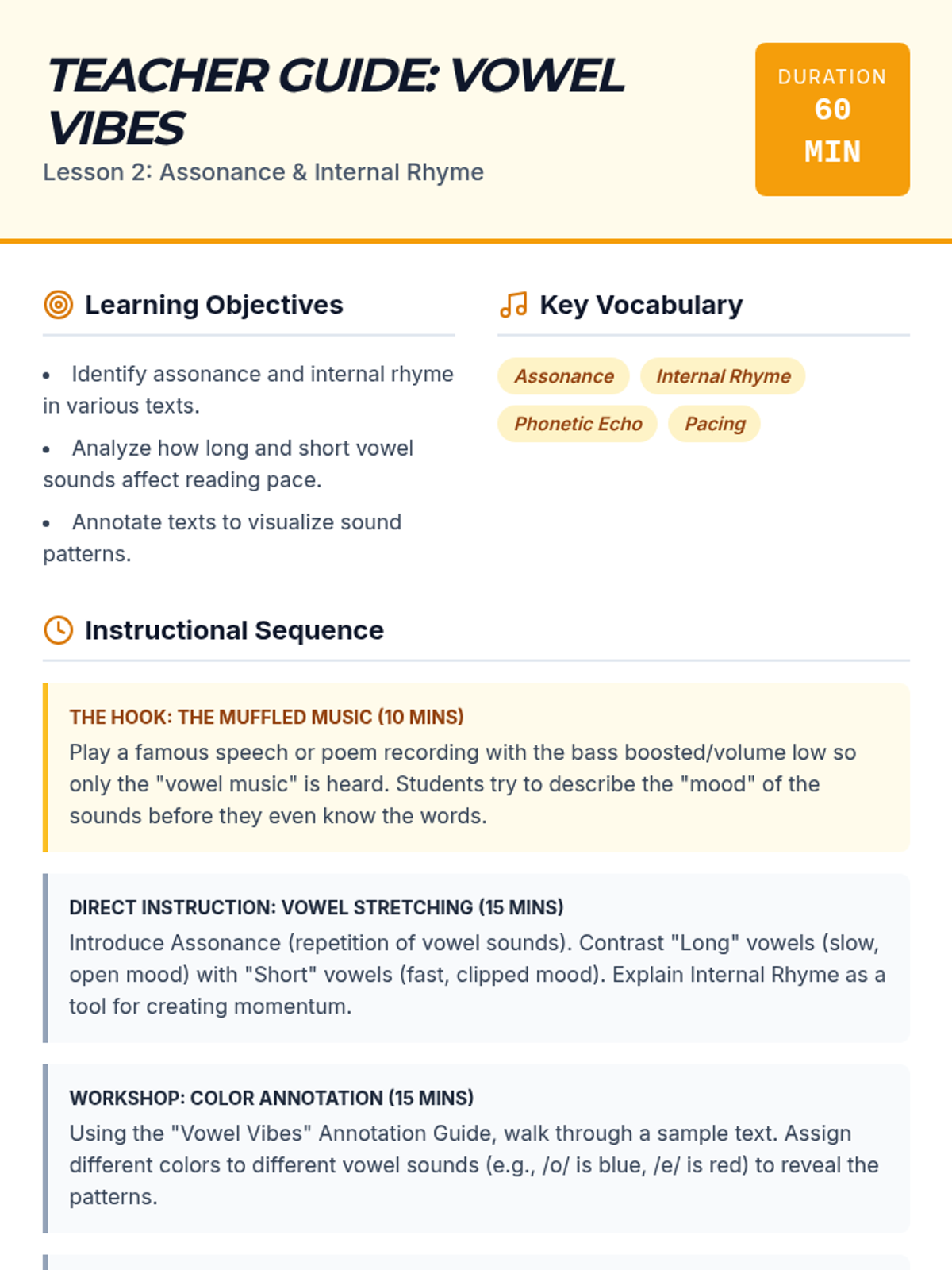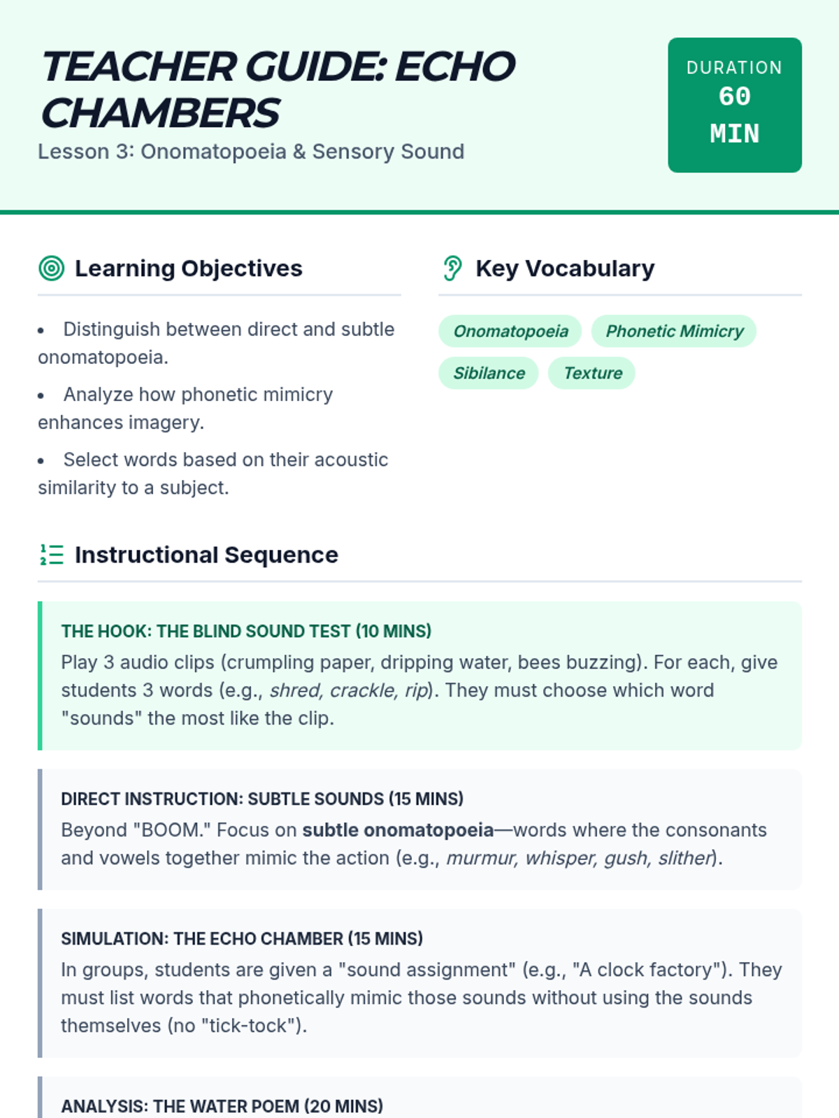 An immersive exploration of the auditory elements of poetry, focusing on how alliteration, consonance, assonance, onomatopoeia, and rhythm shape mood and emotional resonance. Students progress from identifying sound devices to evaluating their impact in both written and performed contexts.