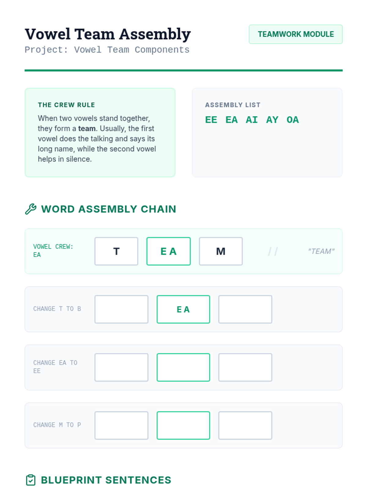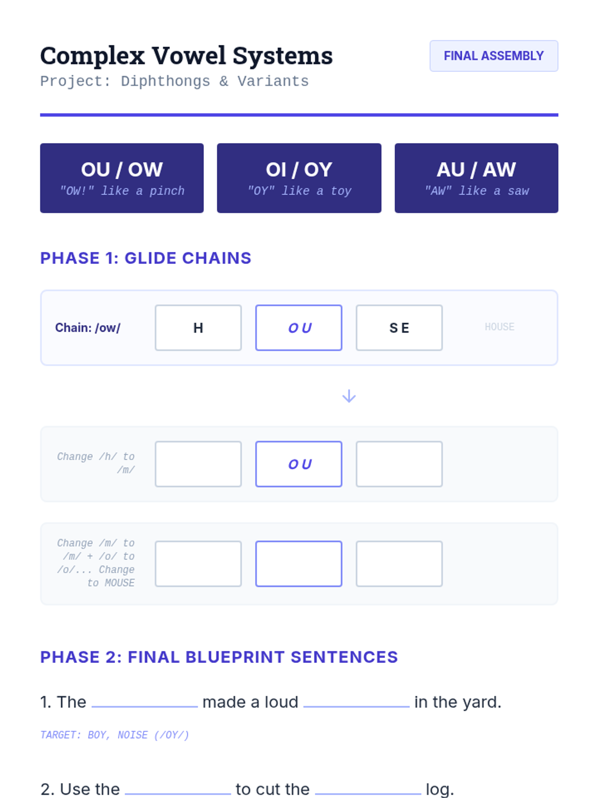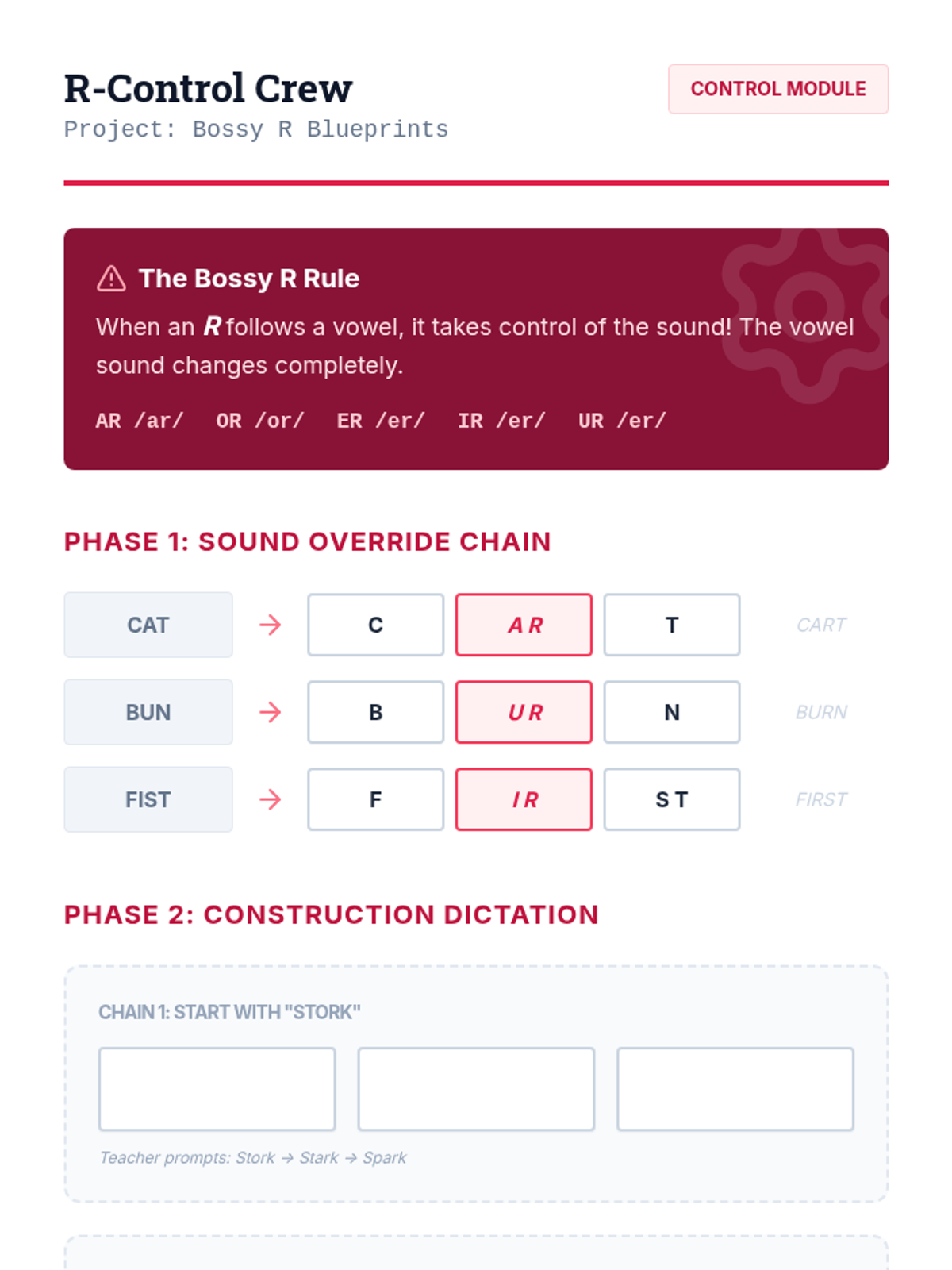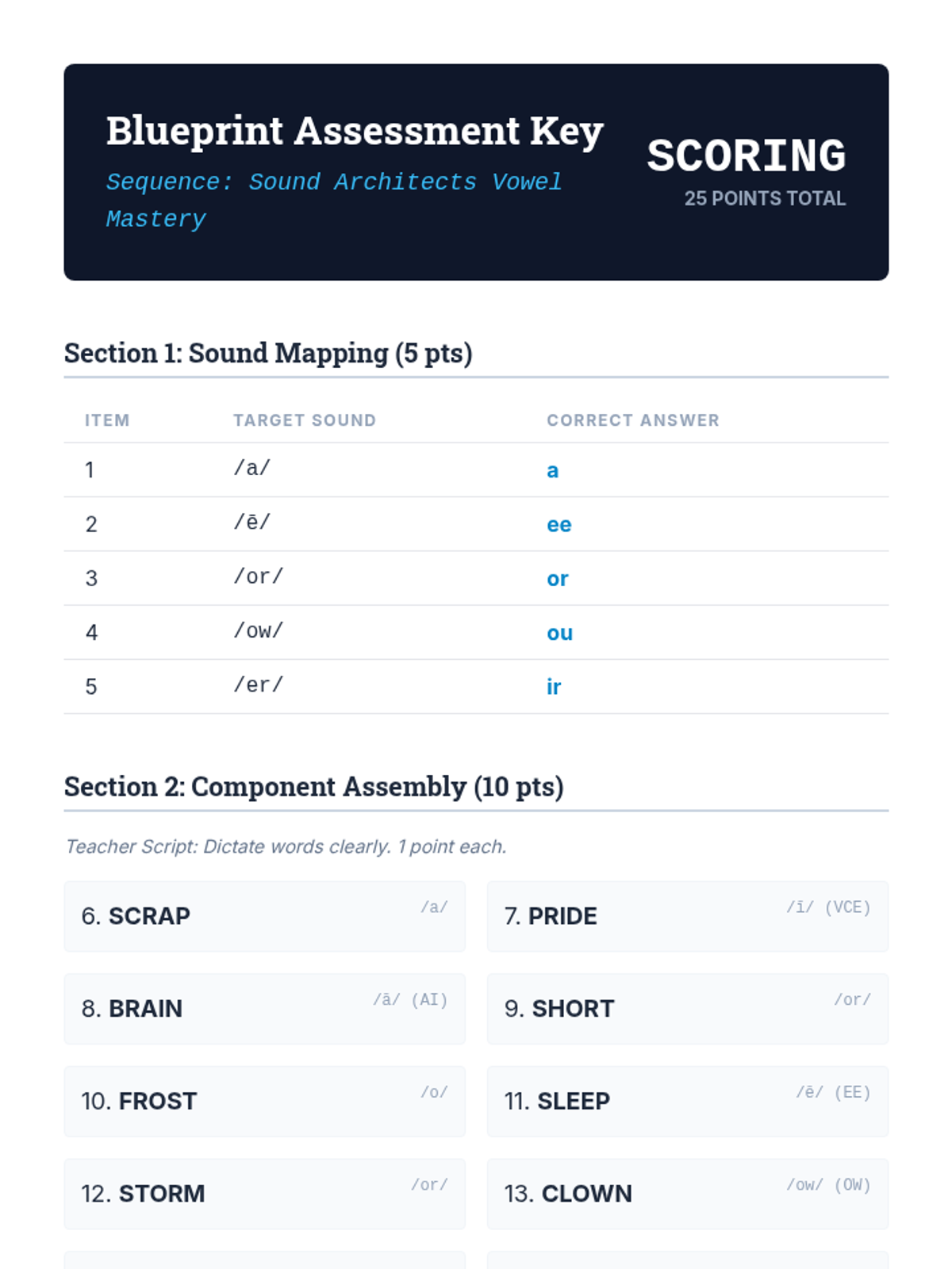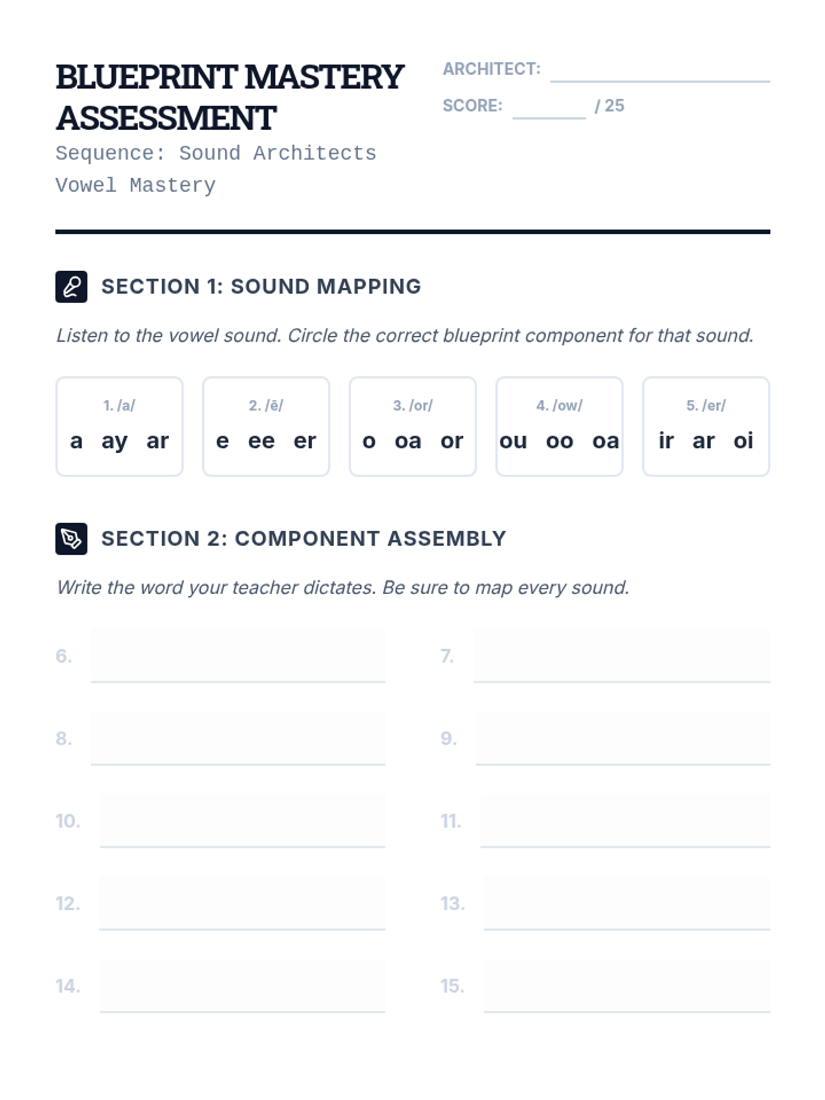A comprehensive linguistic phonics sequence for older students (Grades 3-8) with learning disabilities, focusing on the 15 primary vowel sounds and vowel-r combinations through a 'Sound Architect' blueprint theme. Each lesson uses speech-to-print methods, word chaining, and connected text to build spelling mastery.