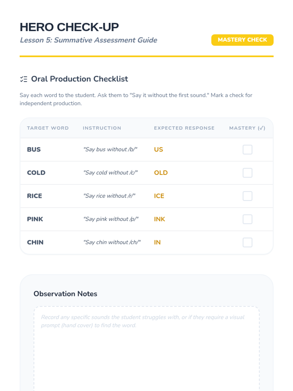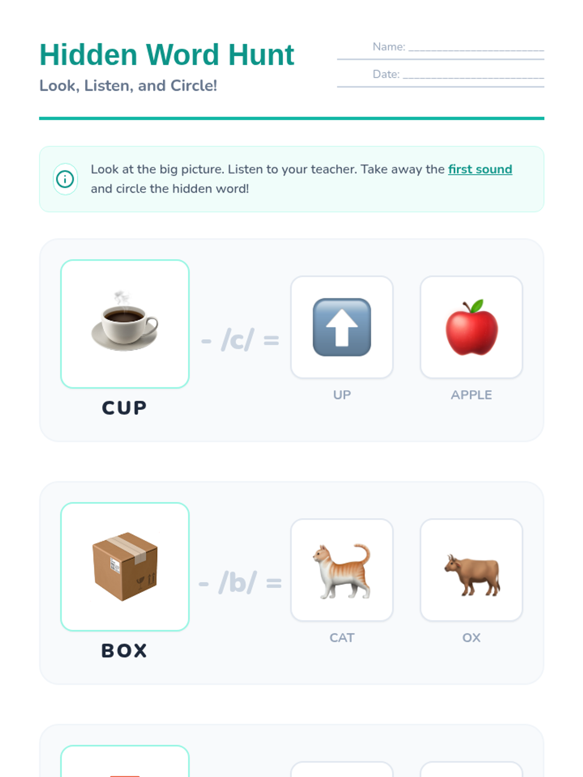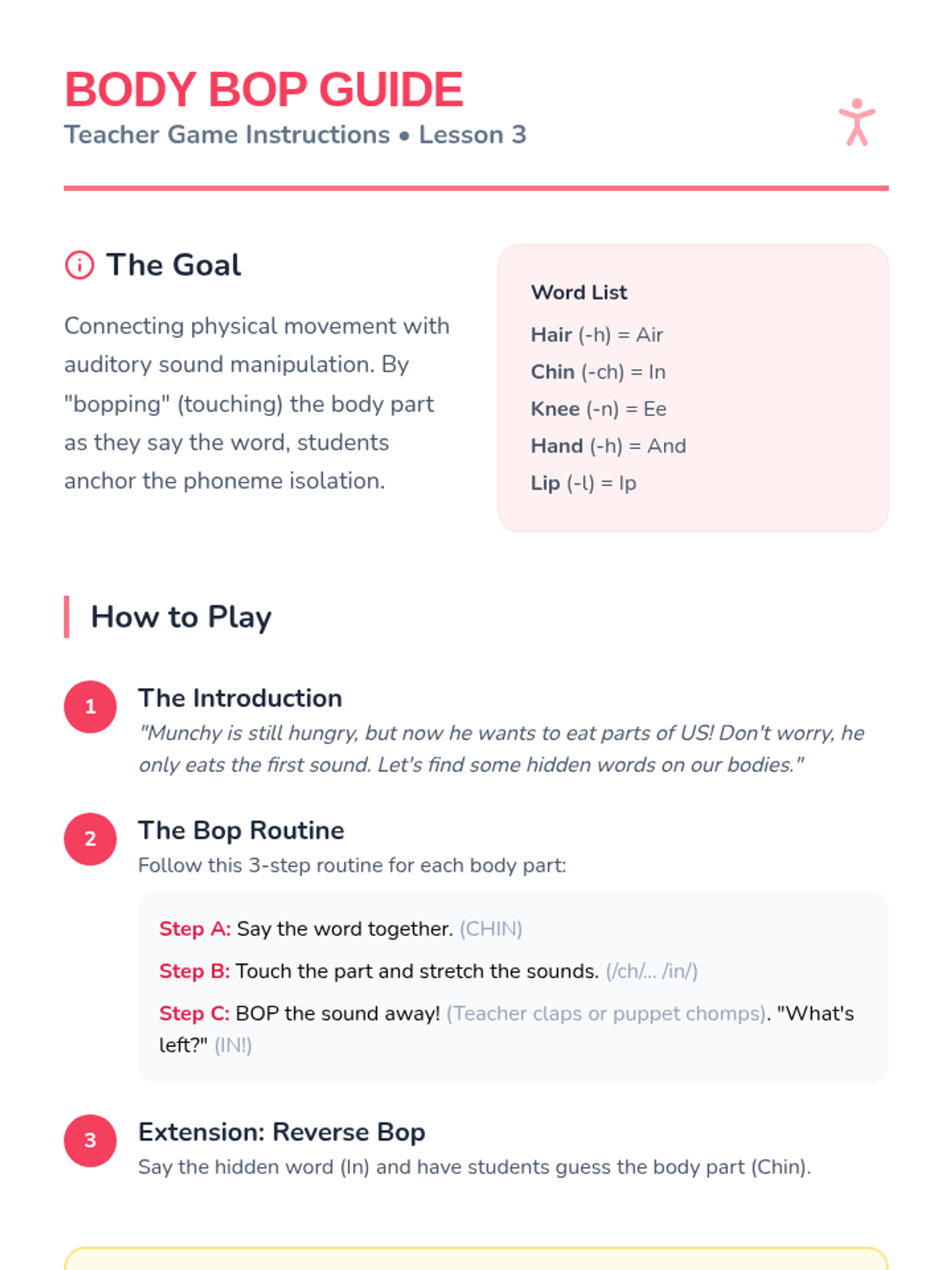A Pre-K phonemic awareness unit where students learn to delete the initial phoneme of spoken words to find 'hidden' words, guided by a puppet character named Munchy.