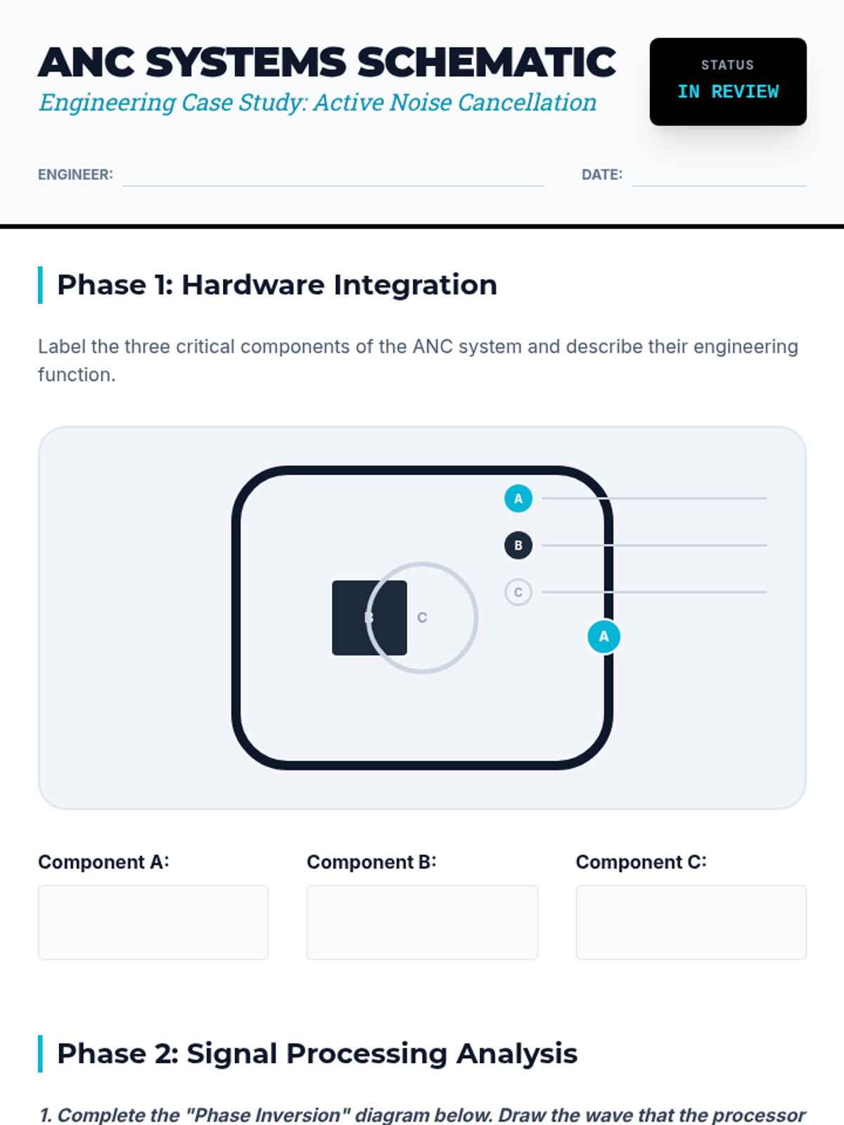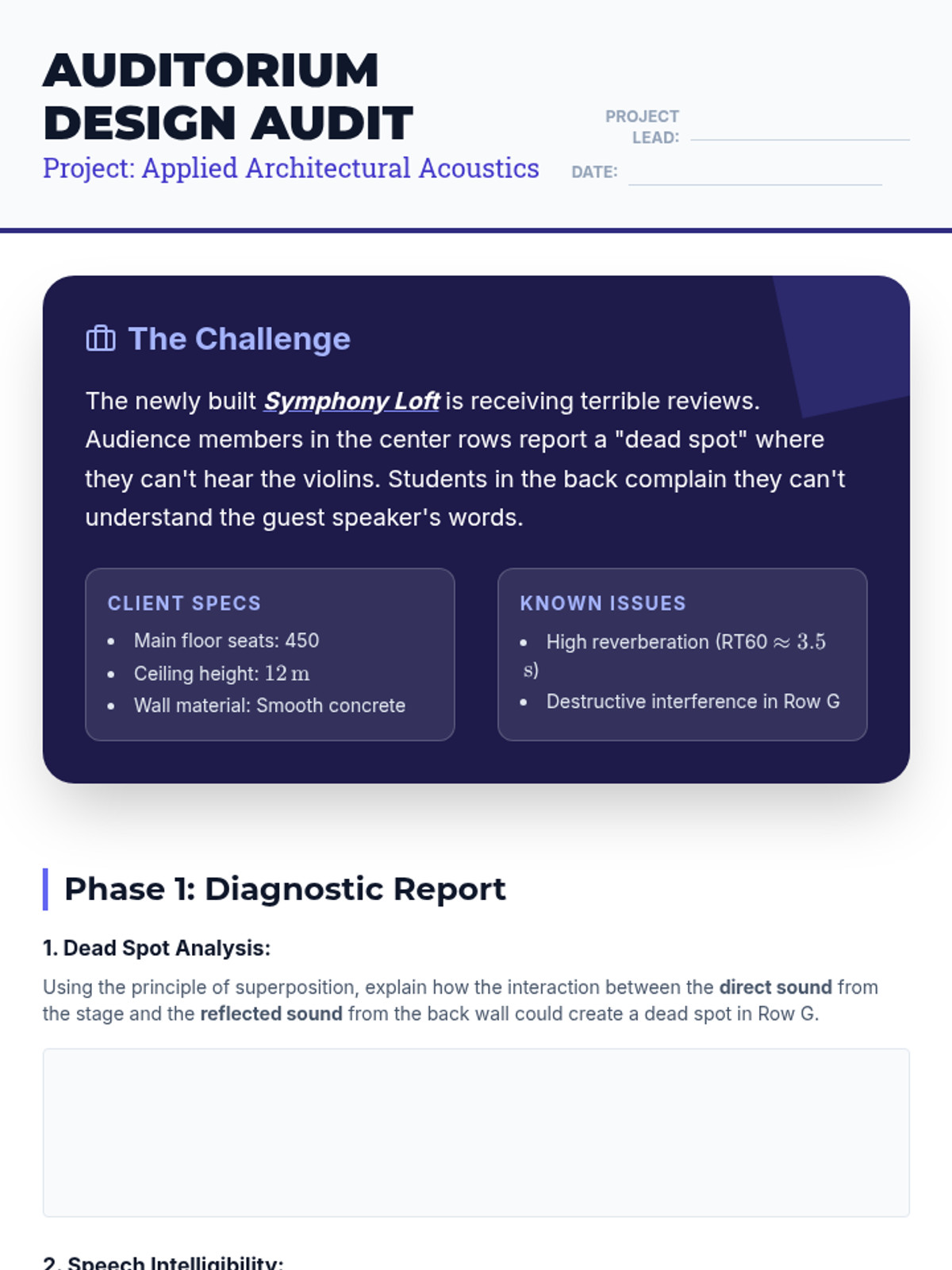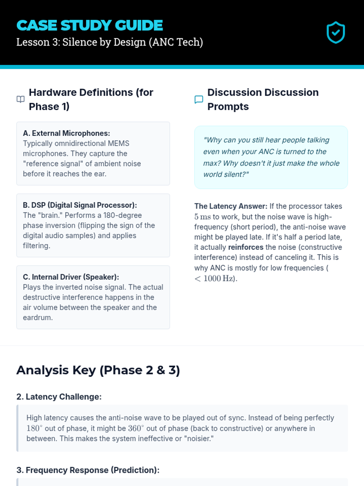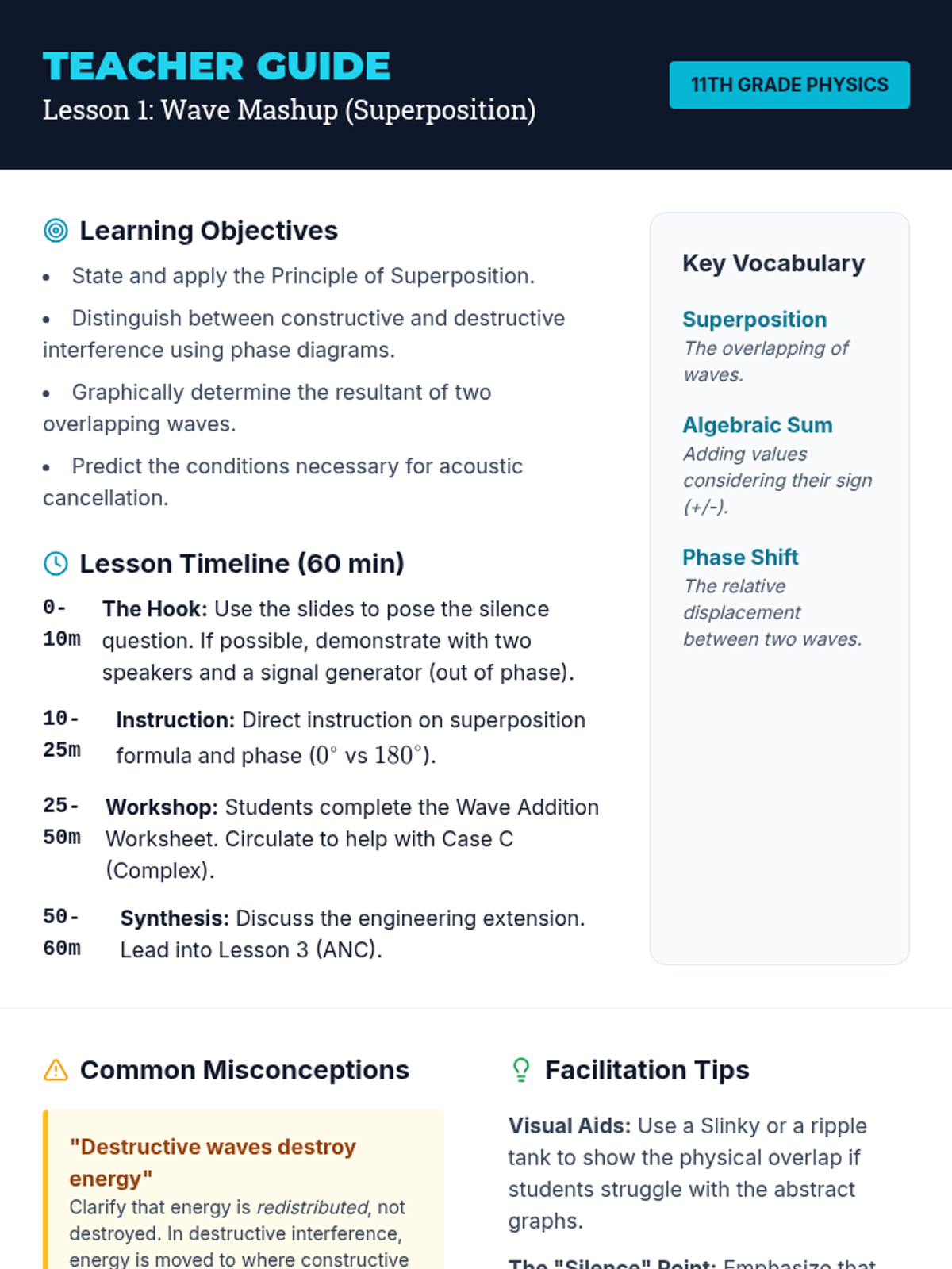 This 11th-grade physics sequence explores the engineering applications of sound interference, progressing from fundamental wave superposition to the complex acoustic design of modern structures and noise-canceling technology.