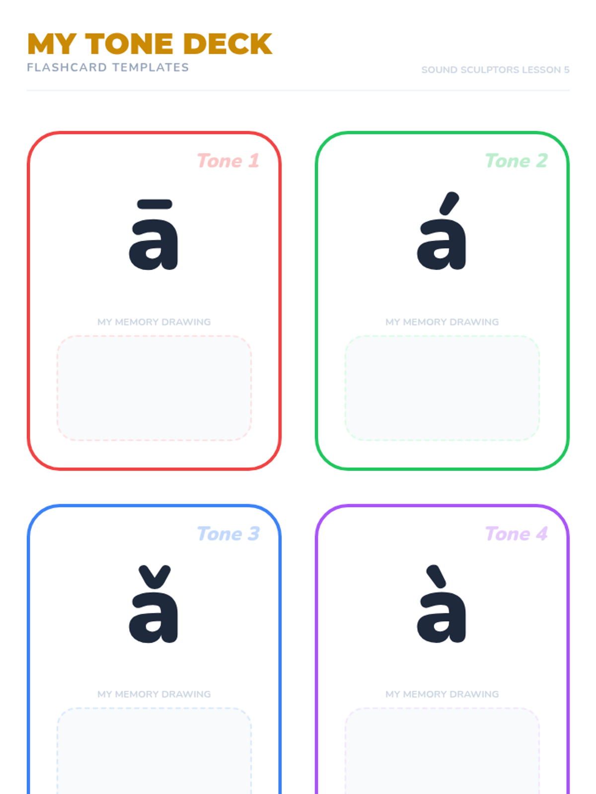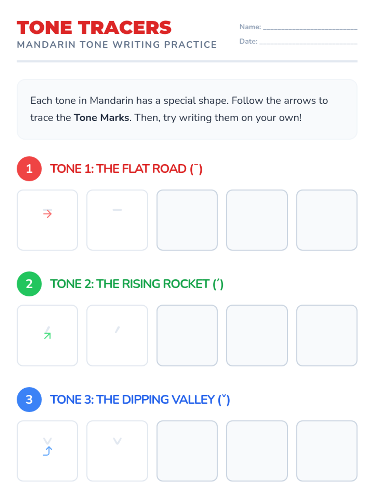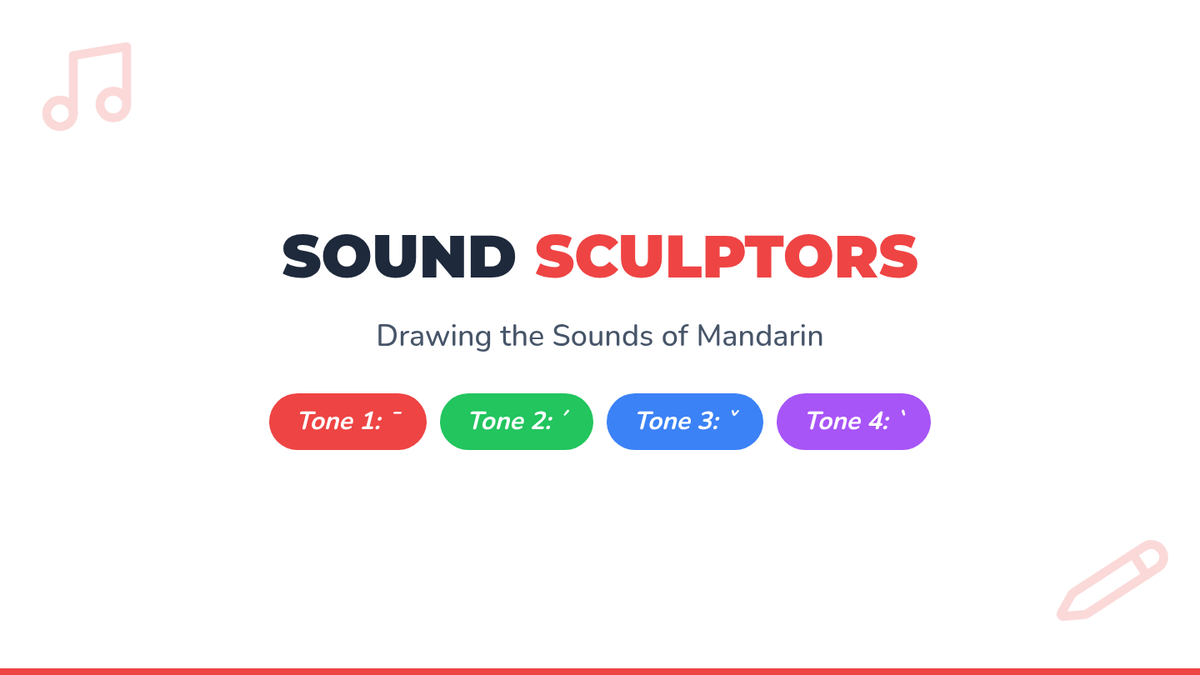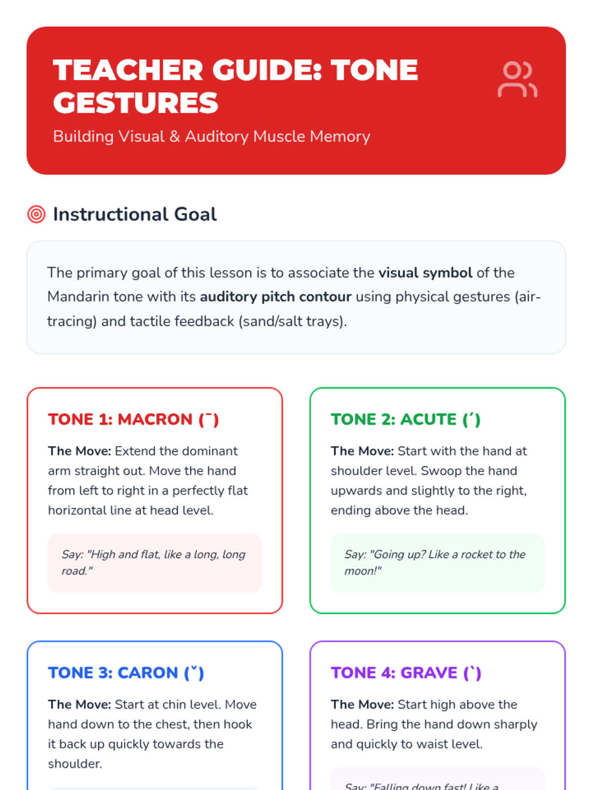 A sequence for 1st-grade students to learn the visual symbols of Mandarin Chinese tones through drawing, movement, and tactile activities. Students connect pitch contours to their corresponding pinyin marks (Macron, Acute, Caron, Grave).