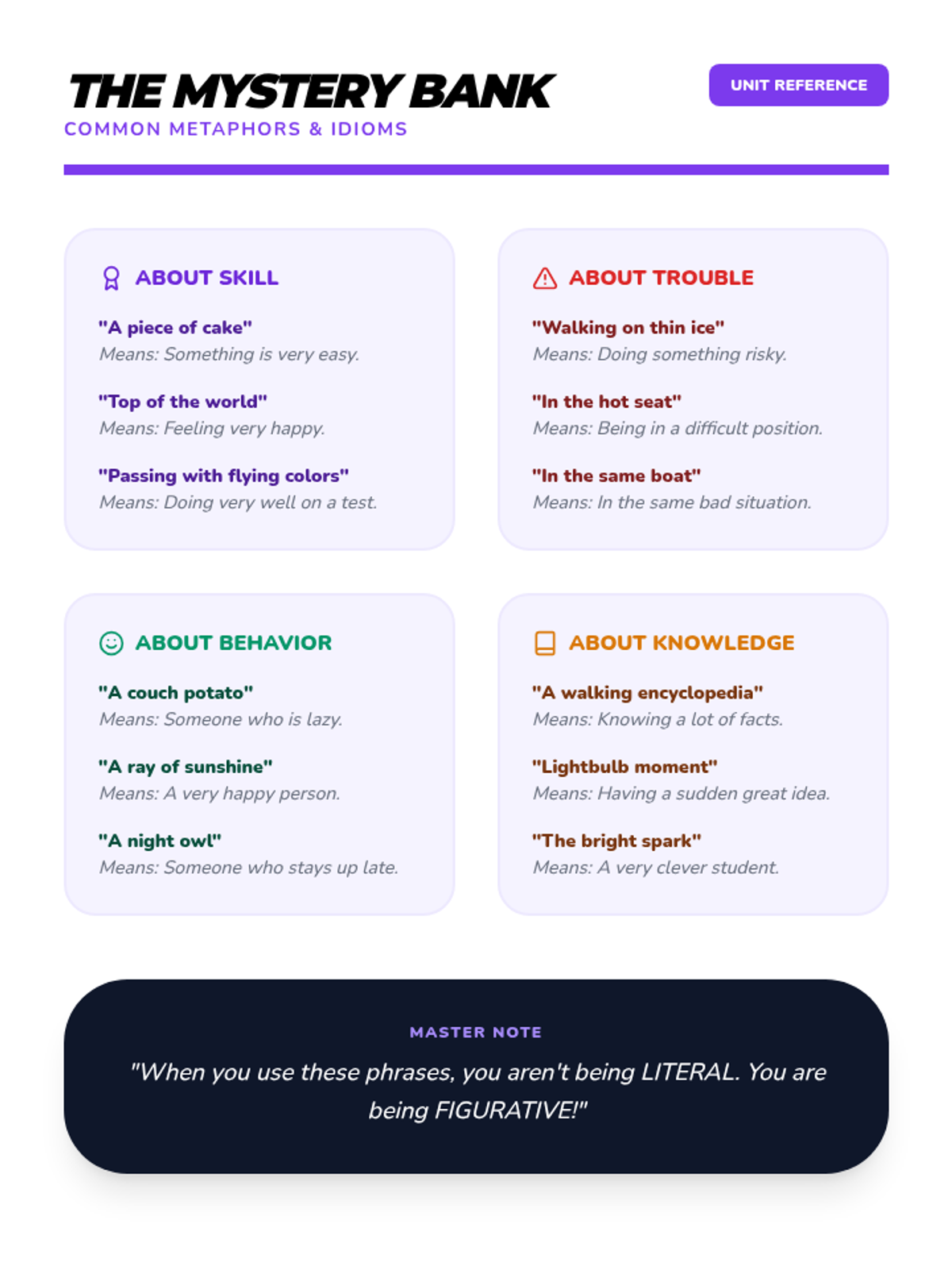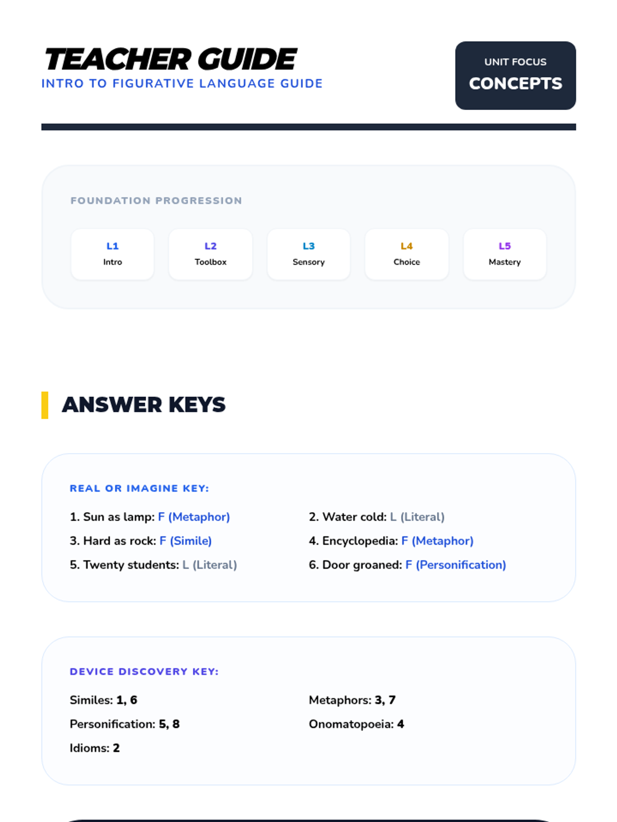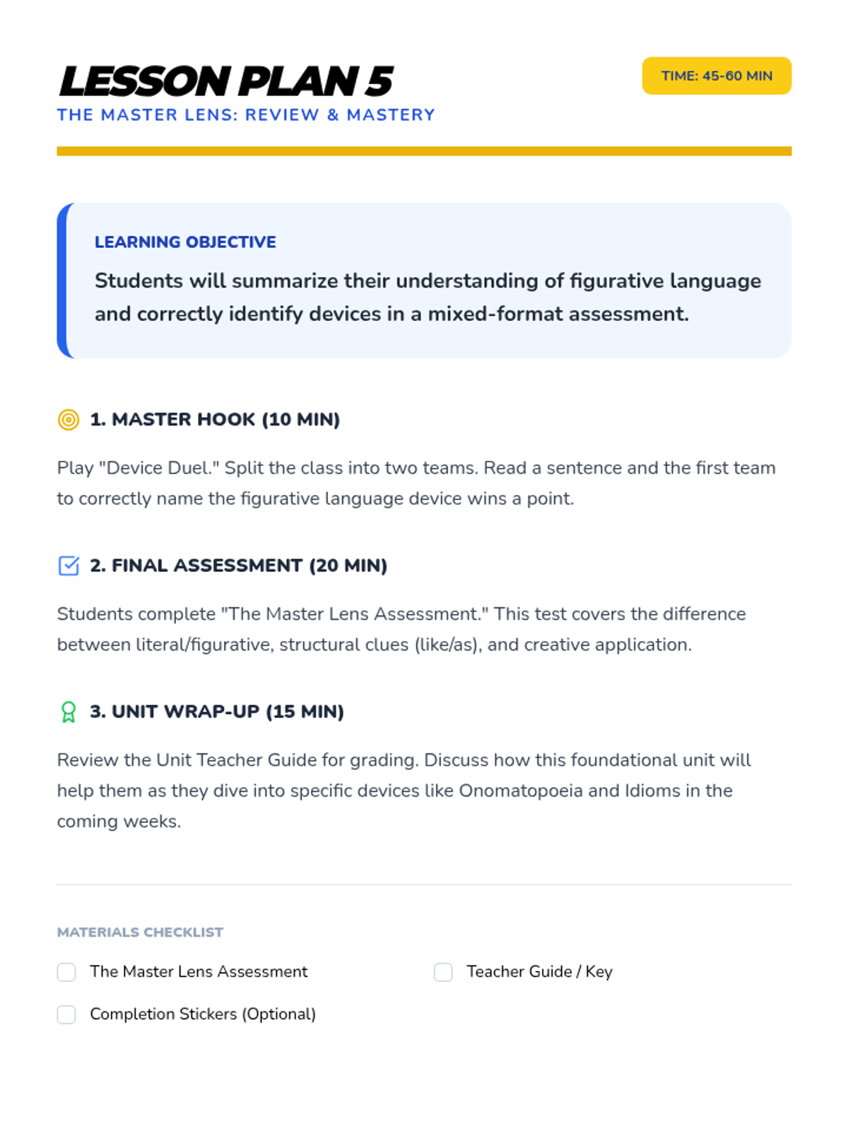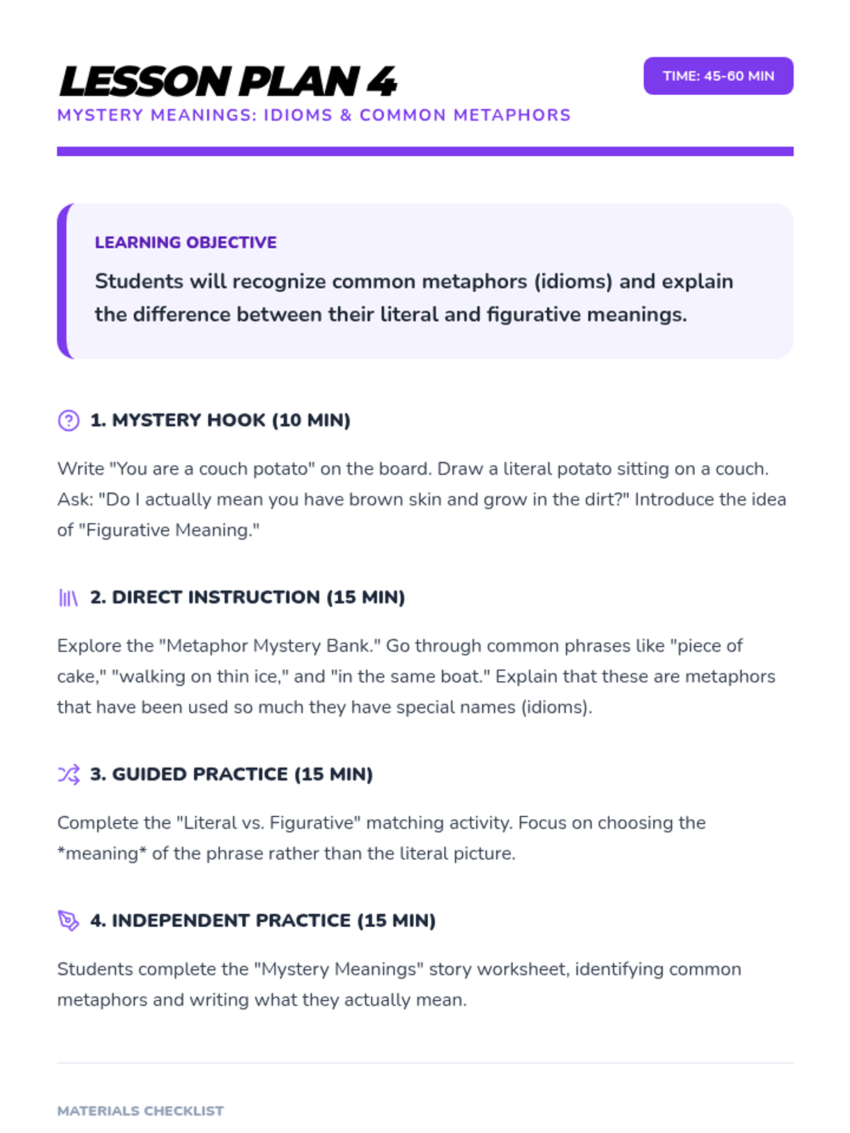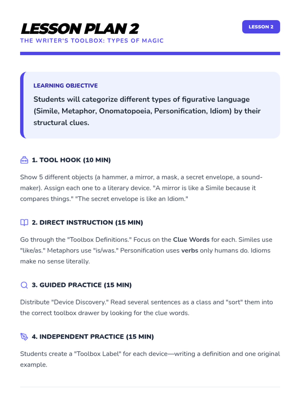 A comprehensive multi-unit sequence for 3rd and 4th grade students covering key literary devices: Introduction to Figurative Language, Onomatopoeia, Similes, Metaphors, Personification, and Idioms. Each unit provides 5 lesson plans, interactive notebook resources, and a wide variety of activities and stories designed to improve descriptive writing and reading comprehension.