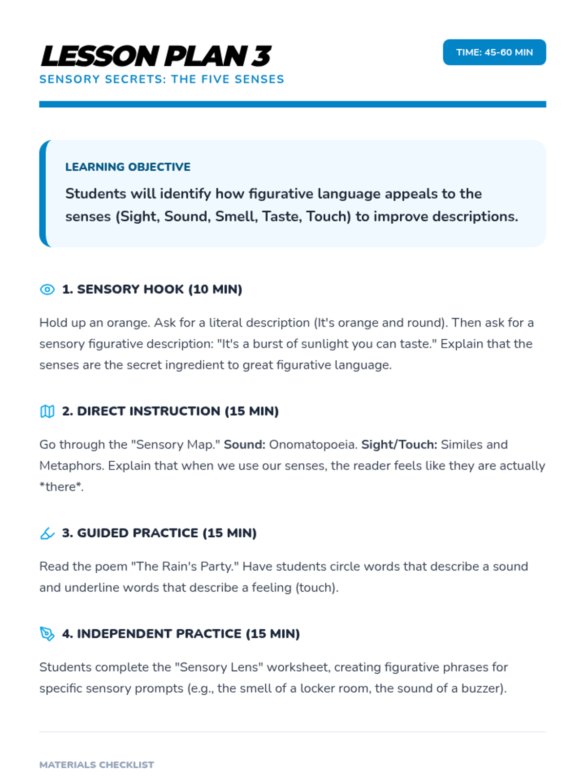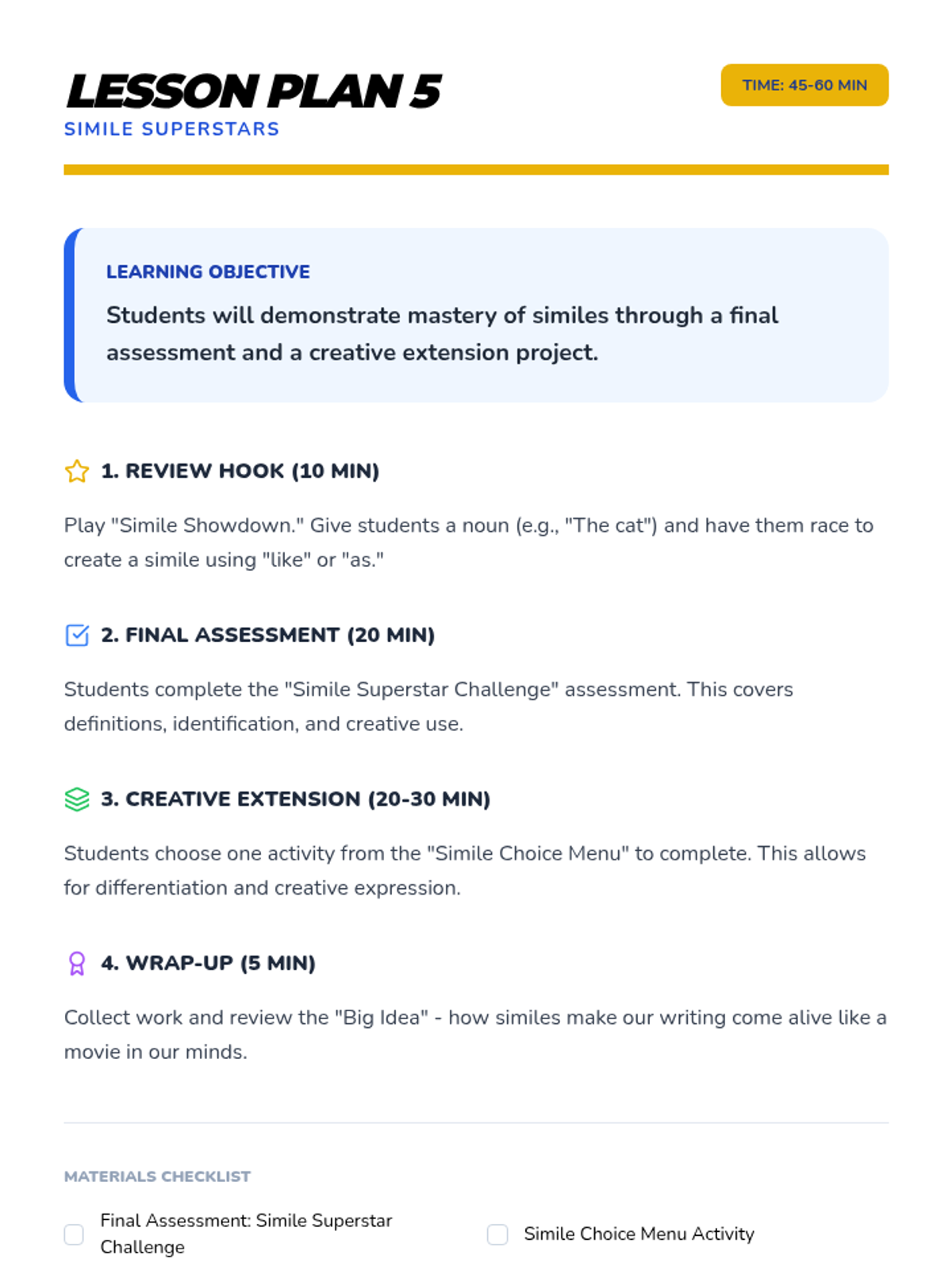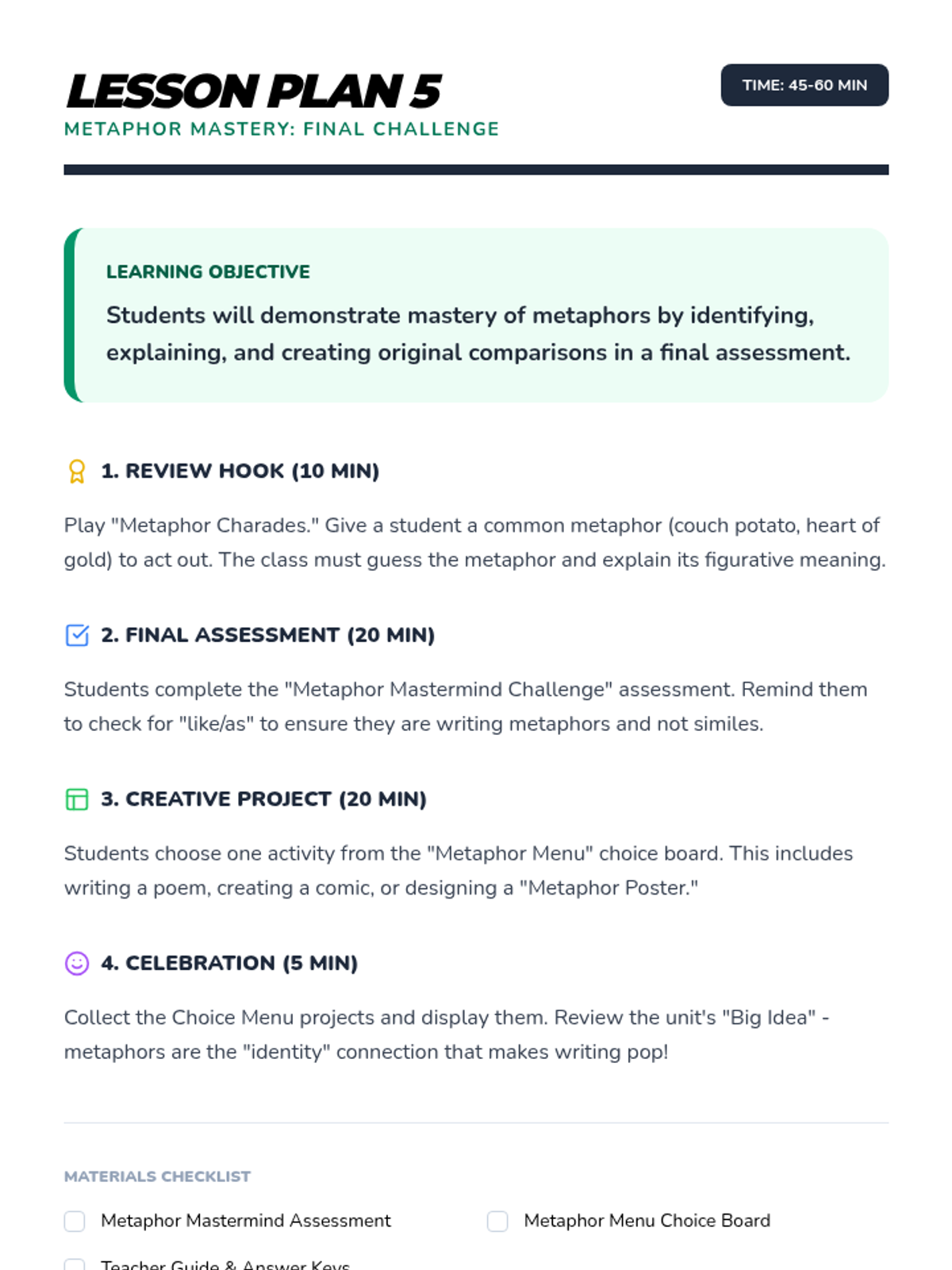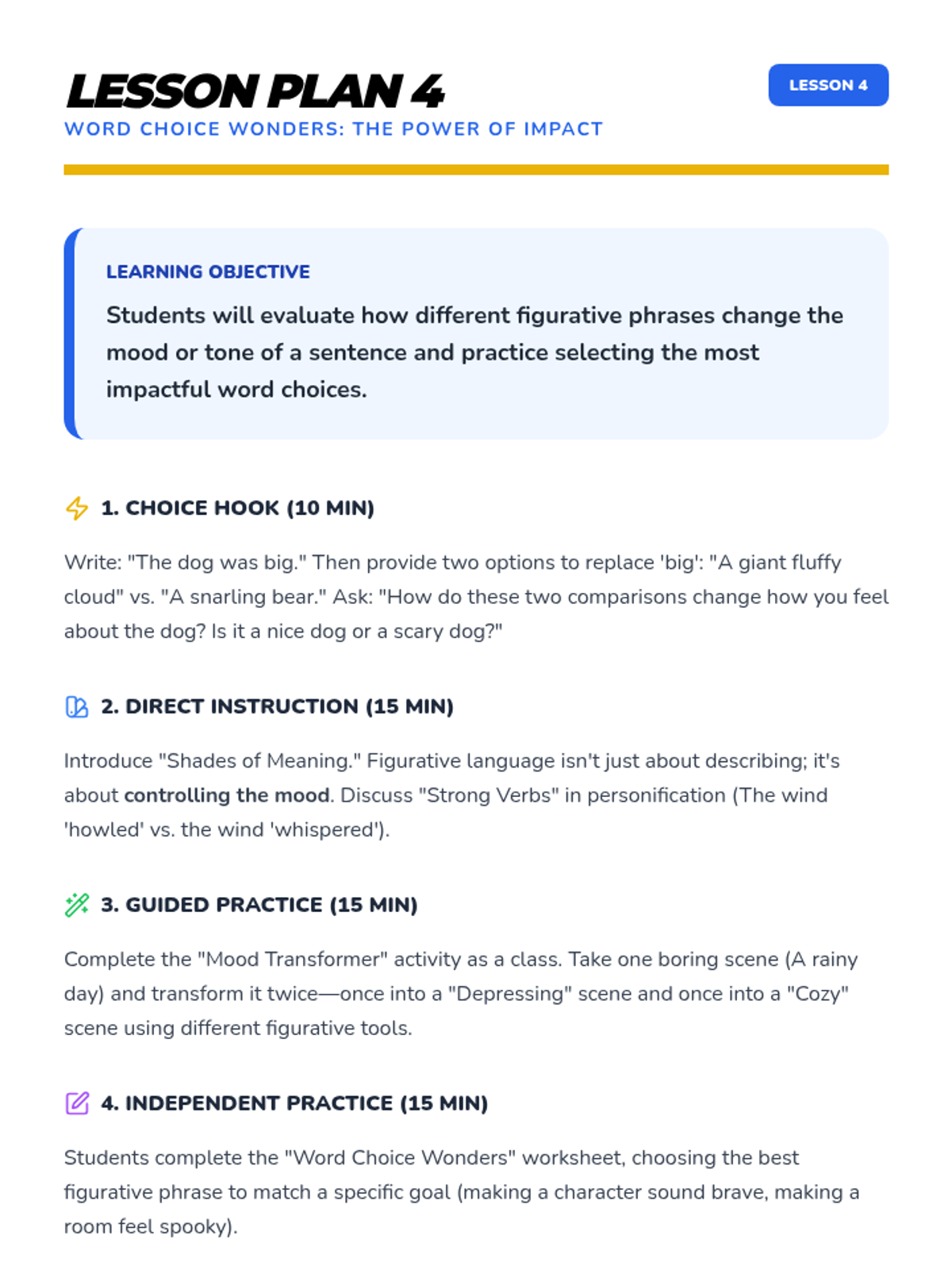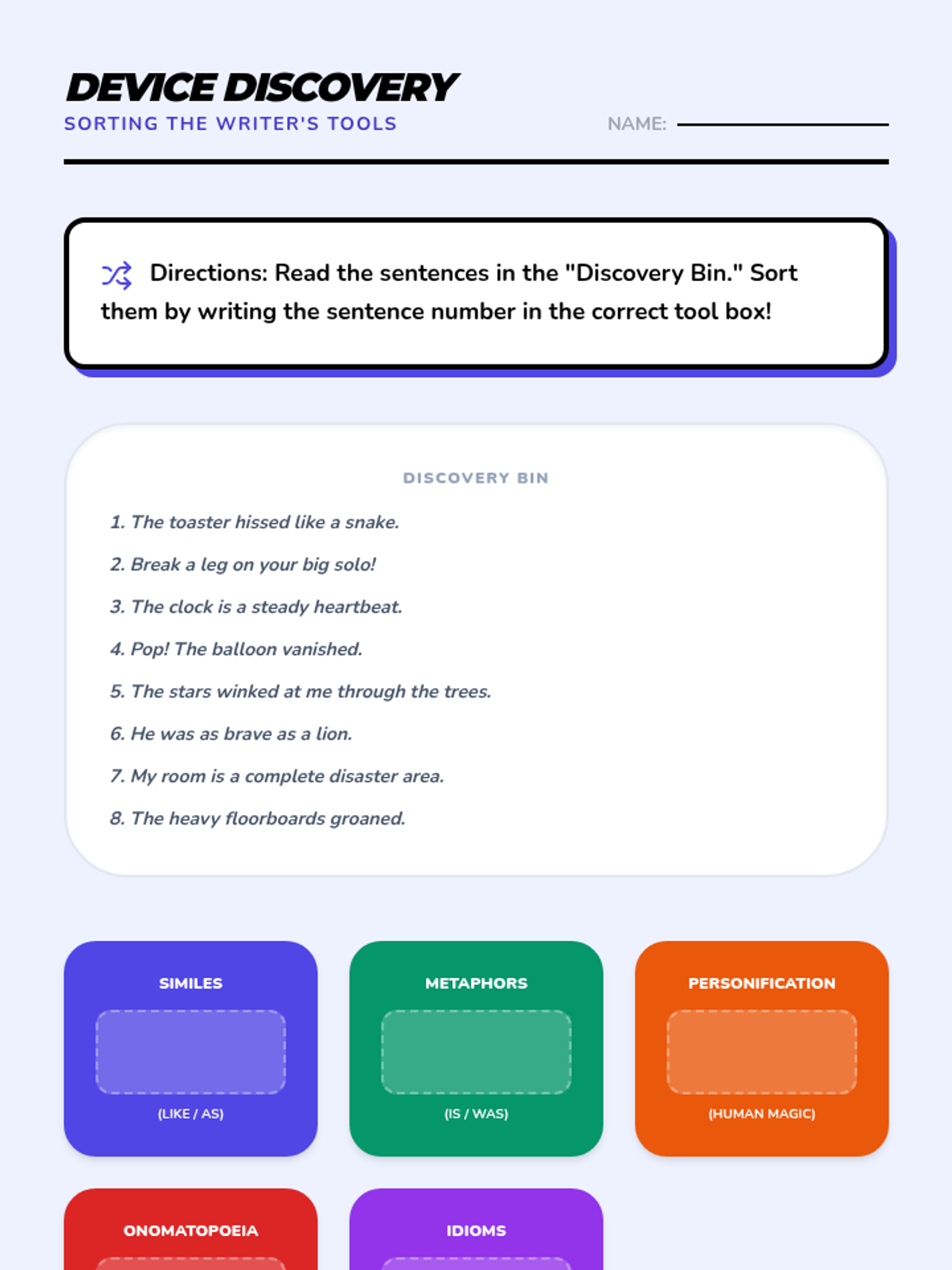 A comprehensive multi-unit sequence for 3rd and 4th grade students covering key literary devices: Introduction to Figurative Language, Onomatopoeia, Similes, Metaphors, Personification, and Idioms. Each unit provides 5 lesson plans, interactive notebook resources, and a wide variety of activities and stories designed to improve descriptive writing and reading comprehension.