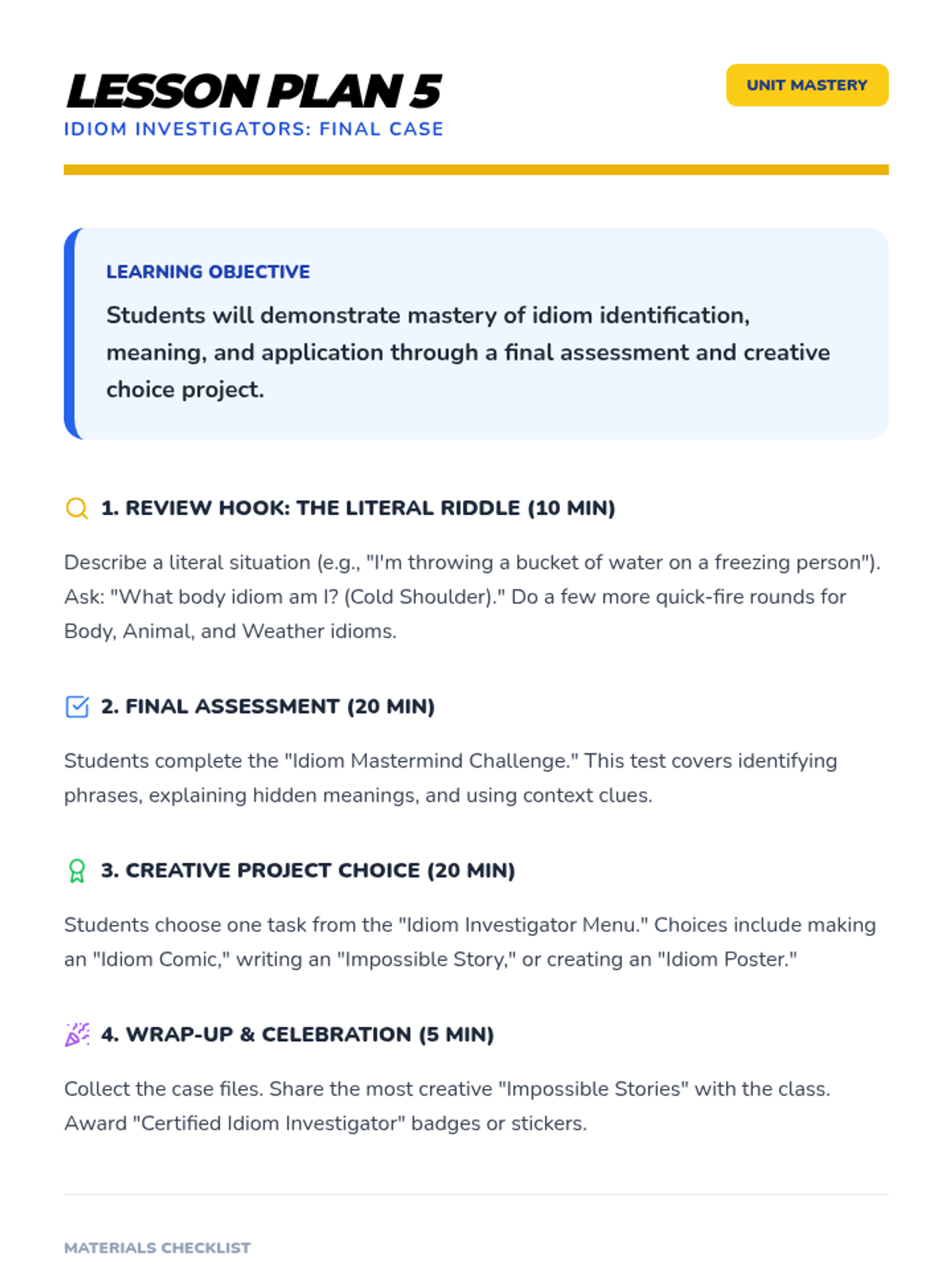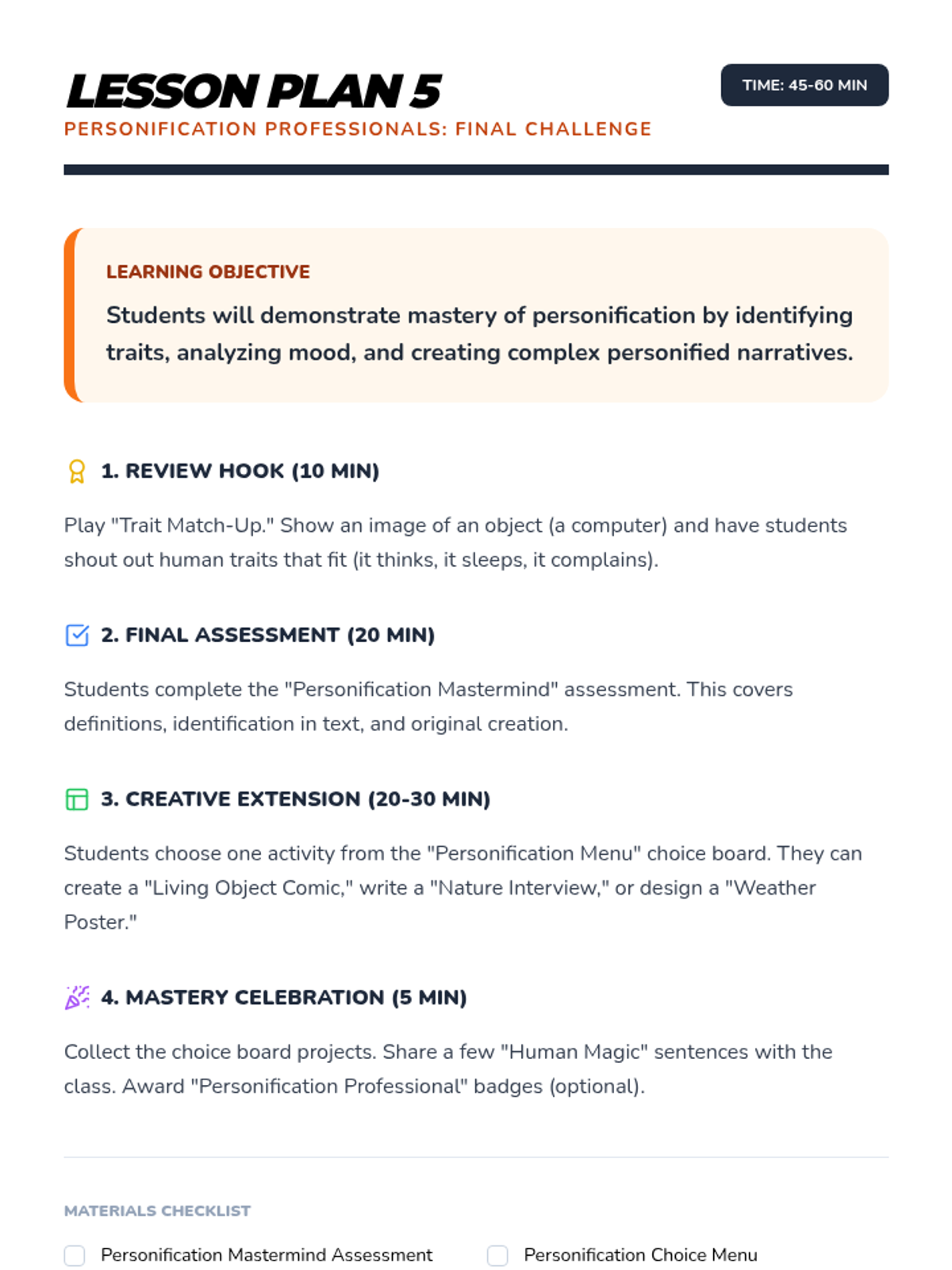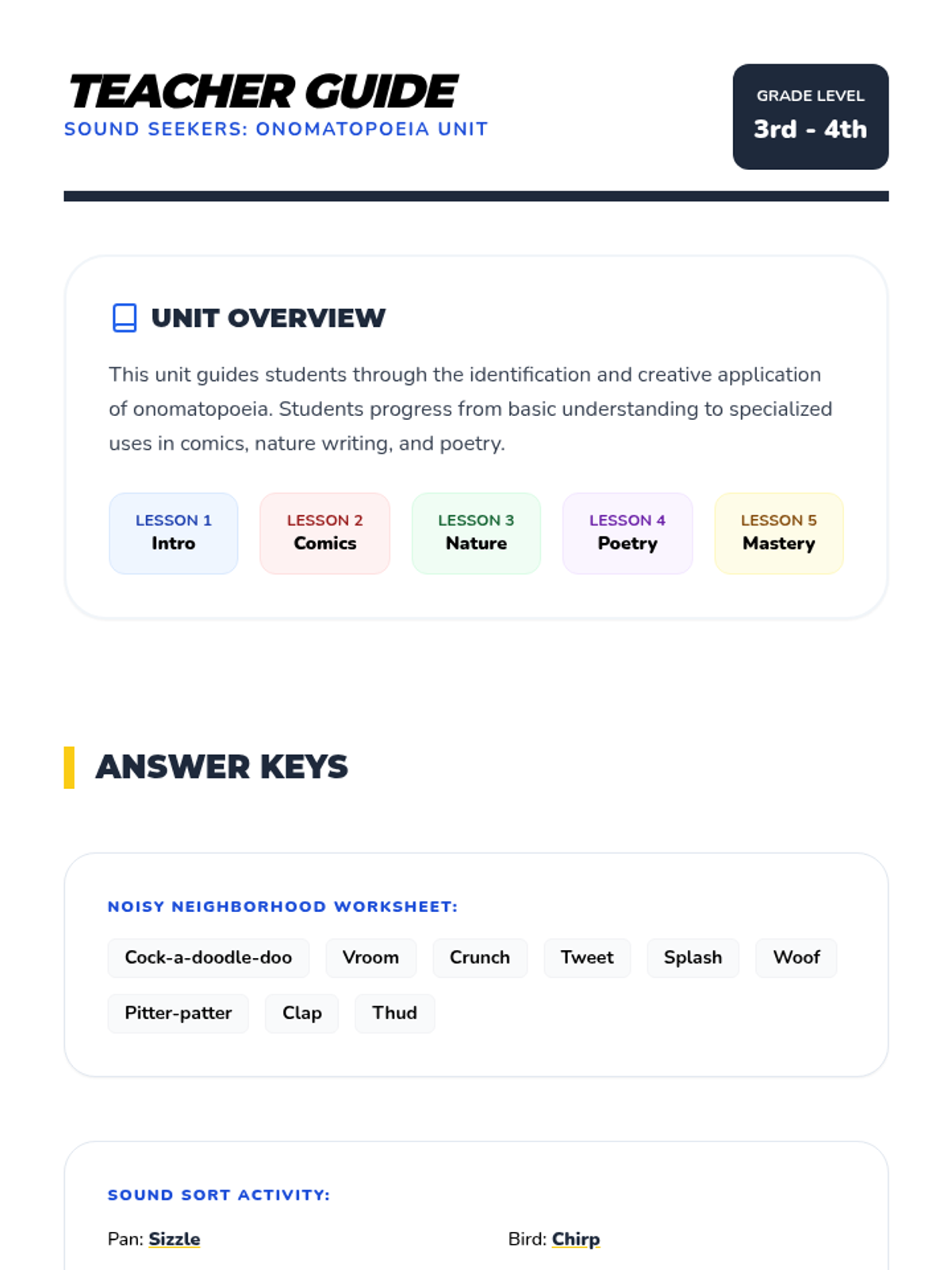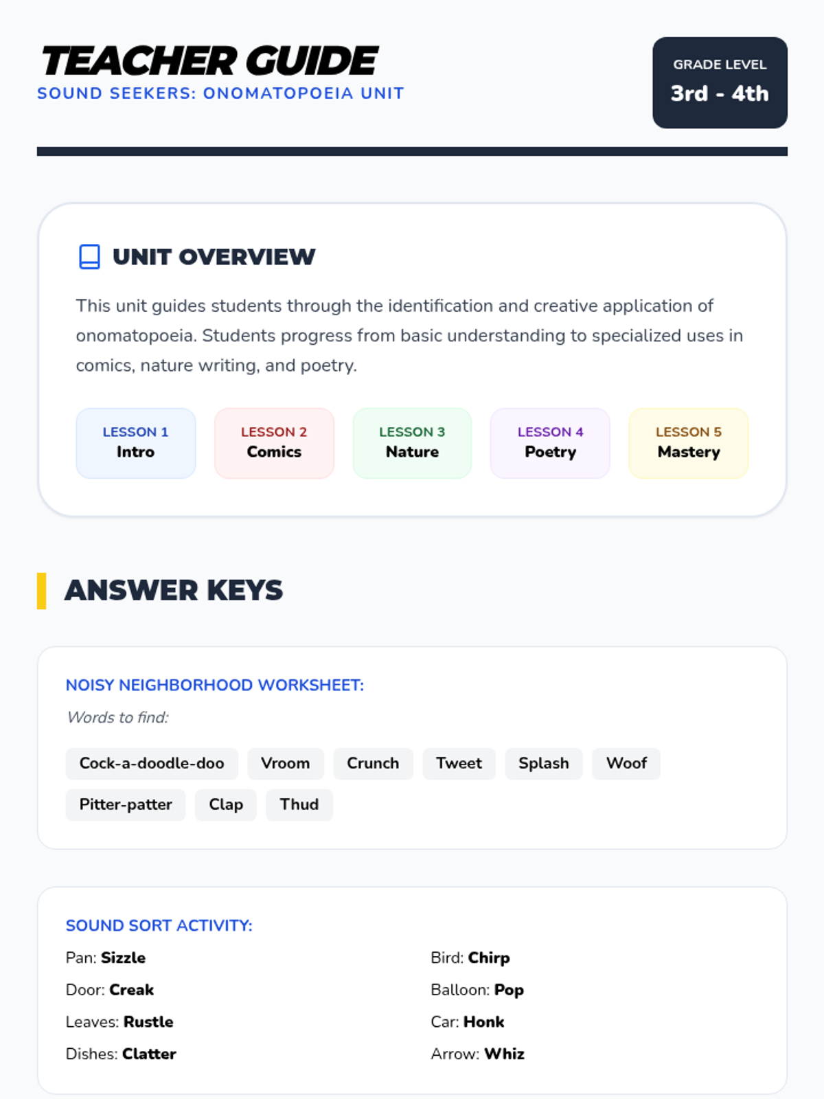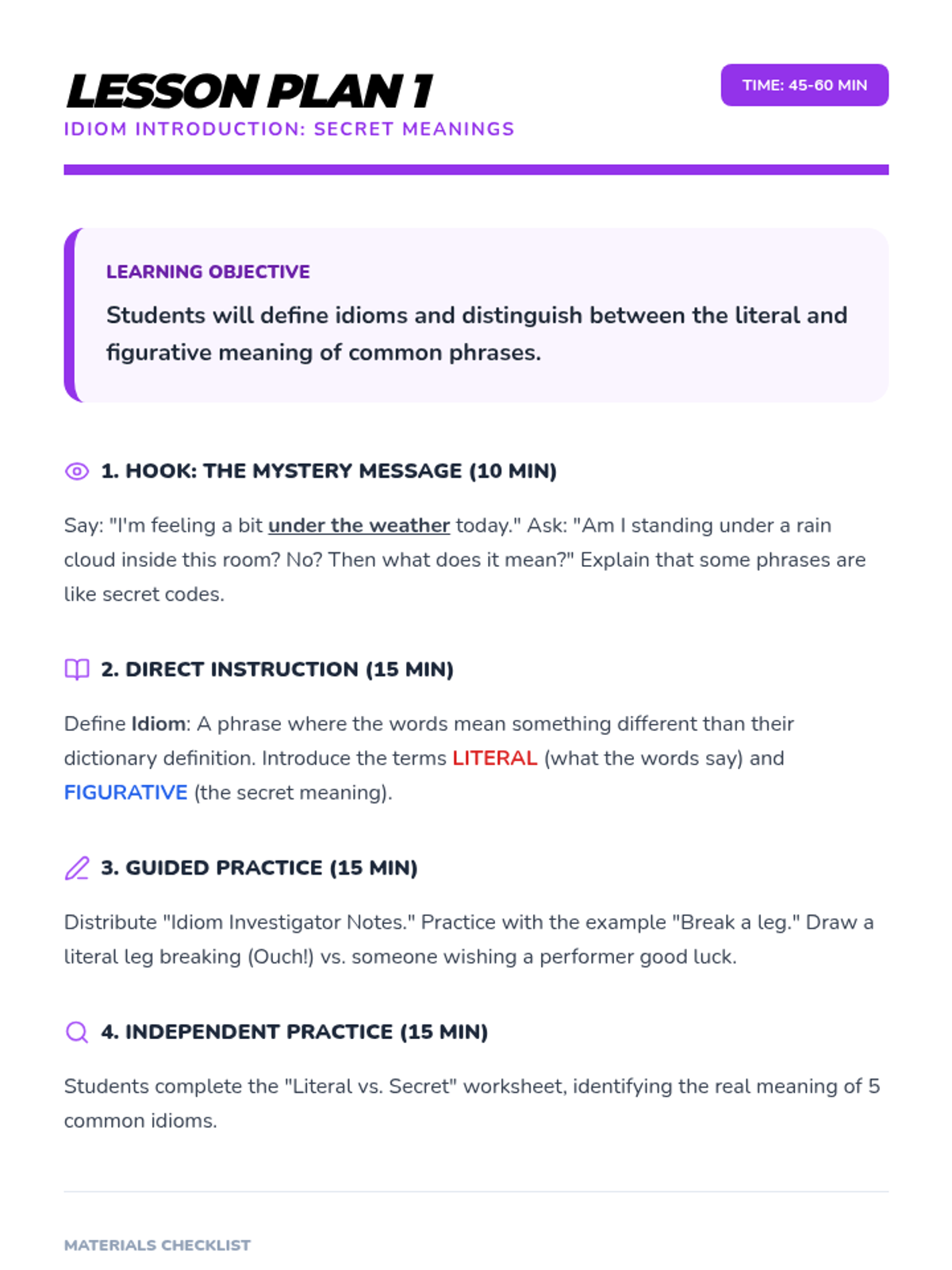 A comprehensive multi-unit sequence for 3rd and 4th grade students covering key literary devices: Introduction to Figurative Language, Onomatopoeia, Similes, Metaphors, Personification, and Idioms. Each unit provides 5 lesson plans, interactive notebook resources, and a wide variety of activities and stories designed to improve descriptive writing and reading comprehension.