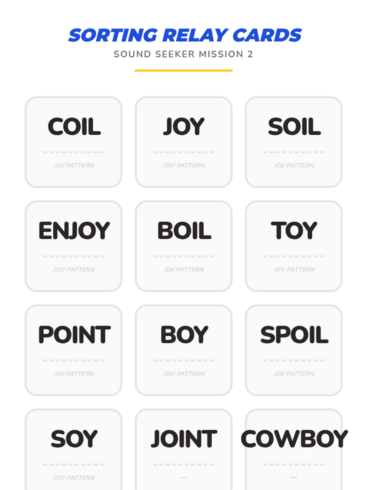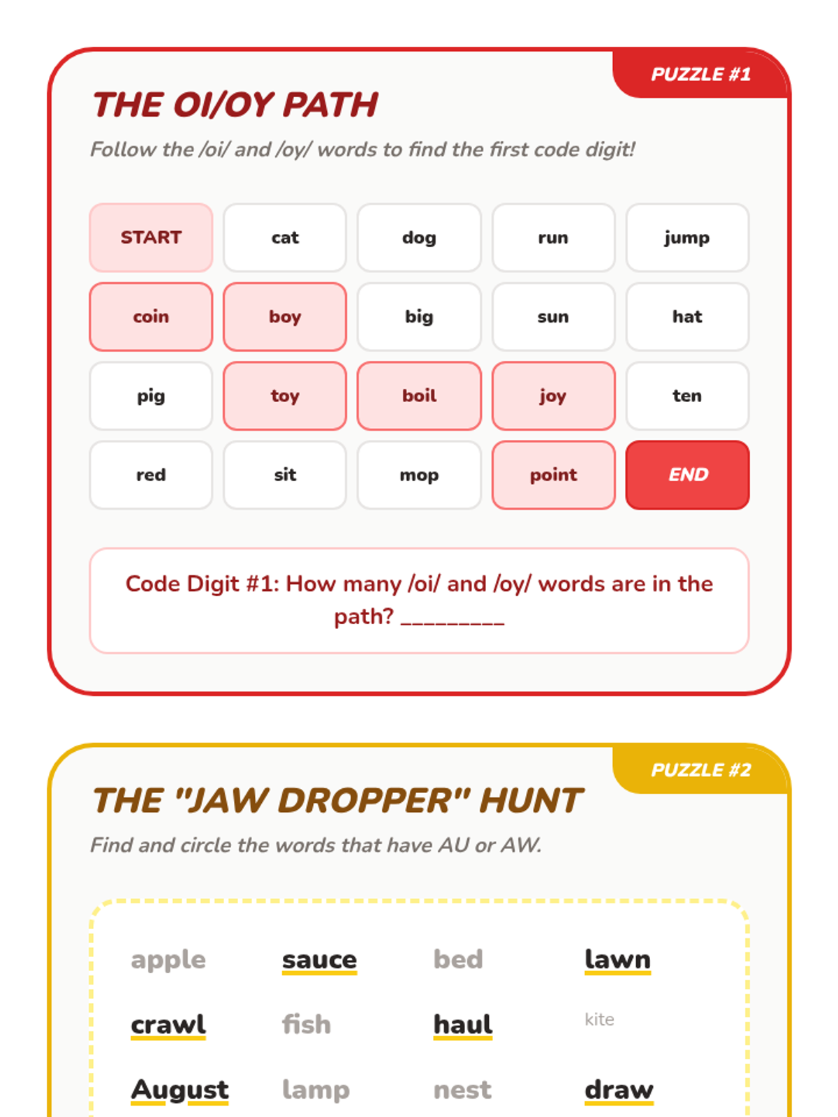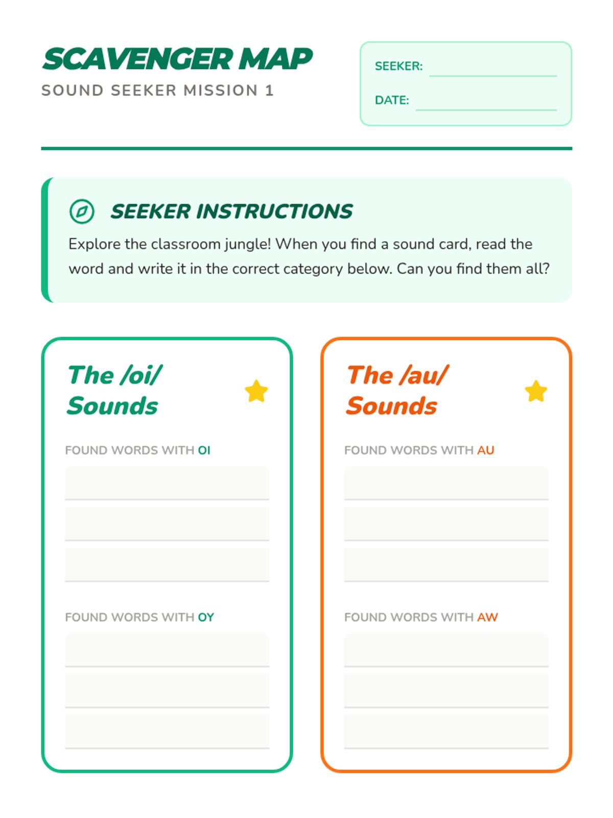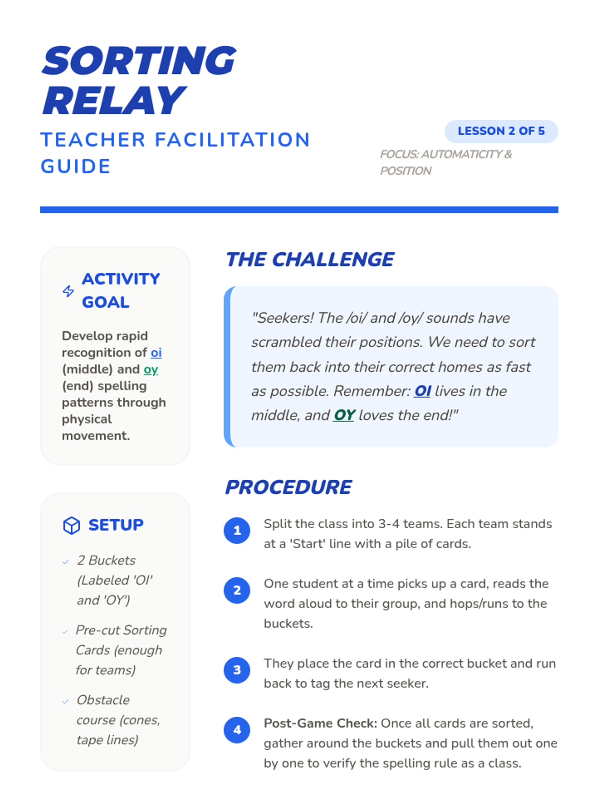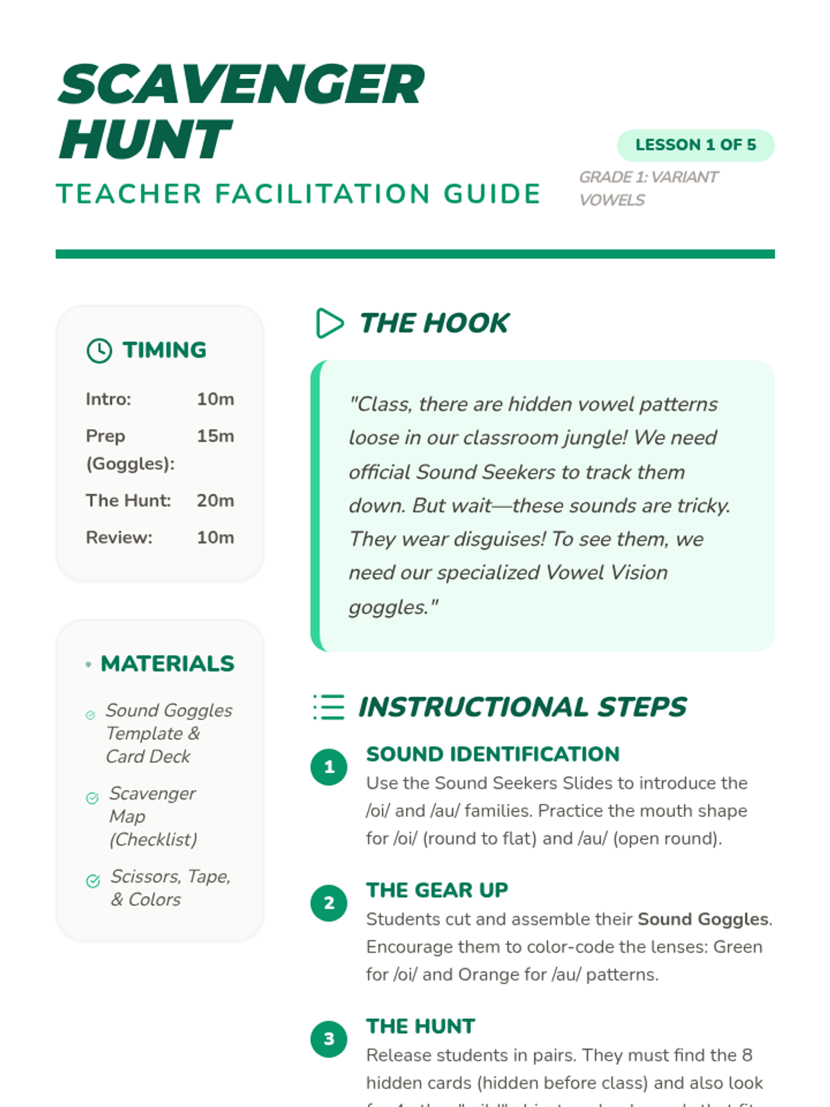A high-energy, game-based unit for 1st graders to master variant vowel patterns /oi/, /oy/, /au/, and /aw/. Students transition from decoding to automaticity through scavenger hunts, relays, and escape room challenges.
