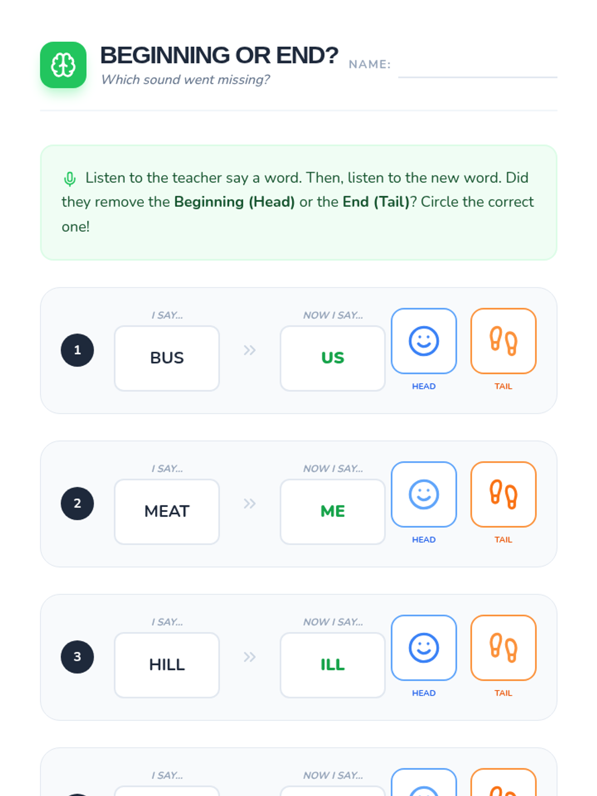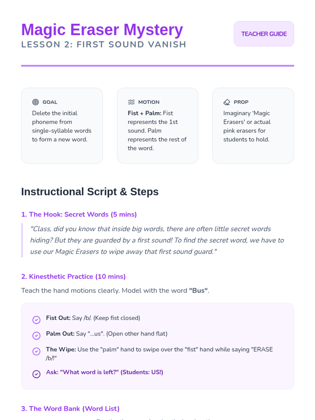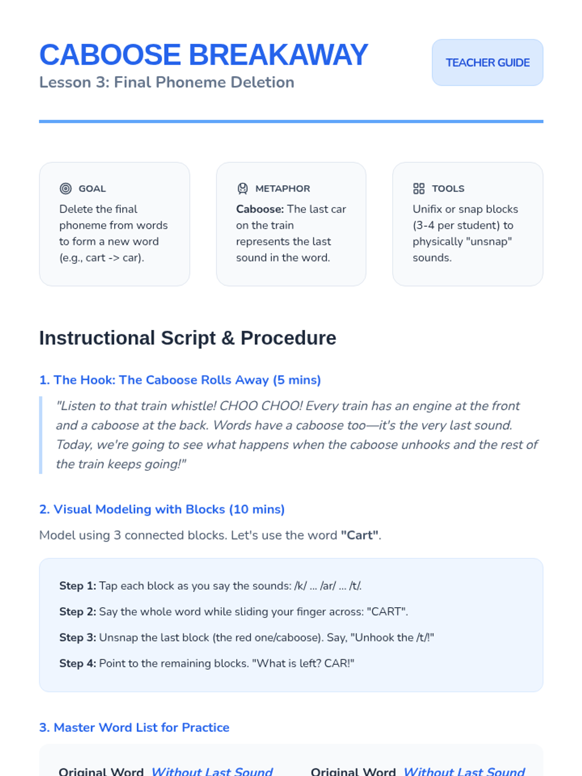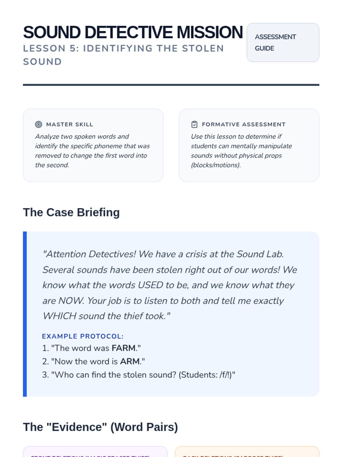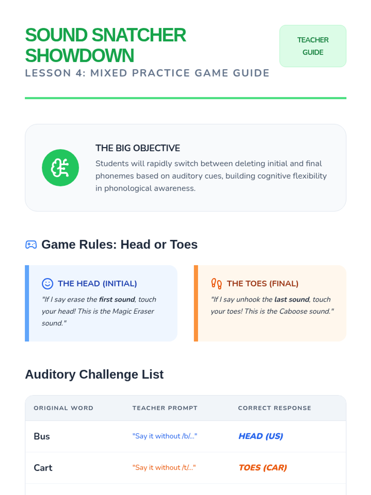 A Kindergarten phonics sequence focusing on phoneme deletion, moving from compound words to initial and final phonemes. Students use kinesthetic and visual cues to understand how words change when sounds are removed.