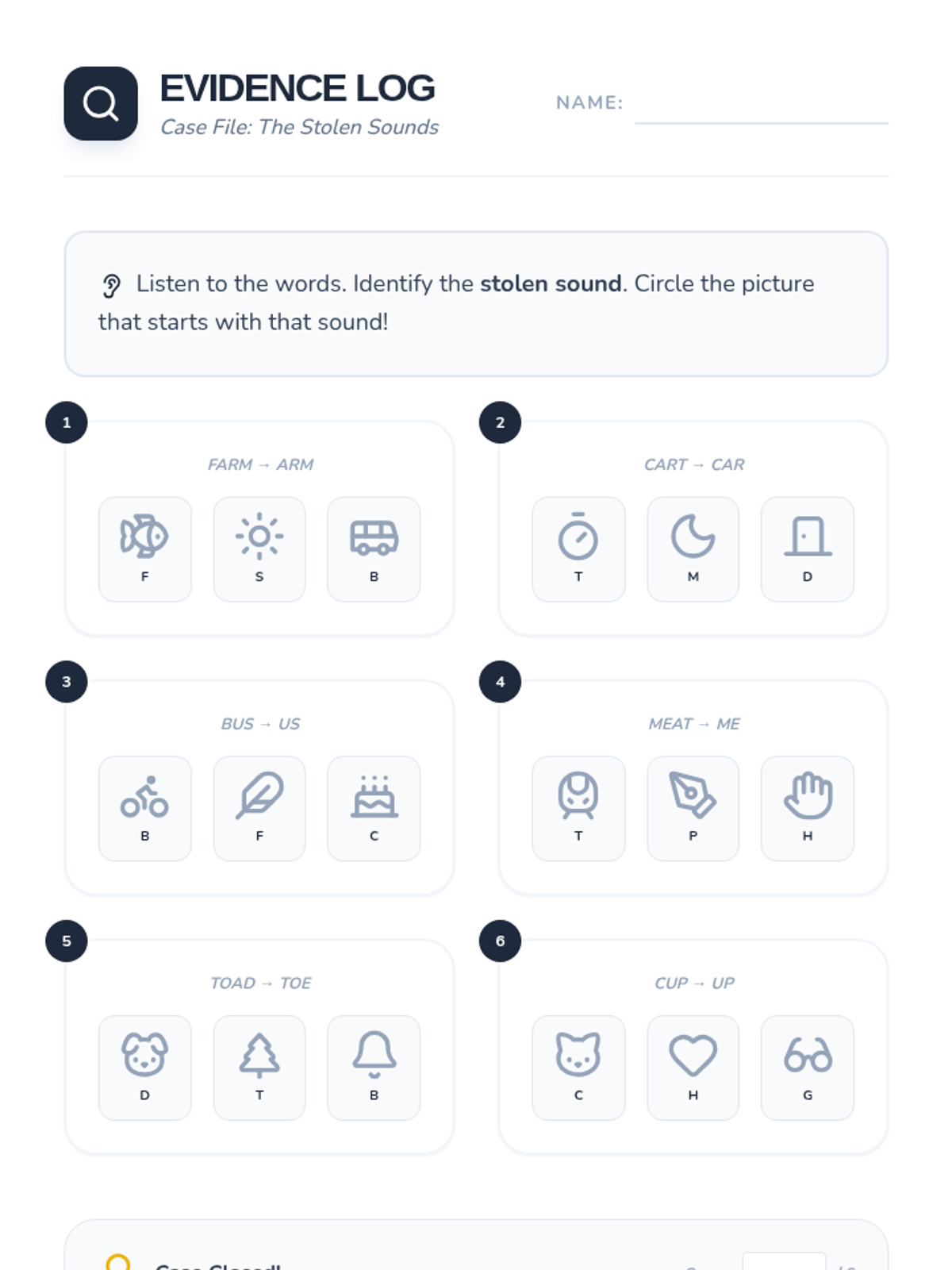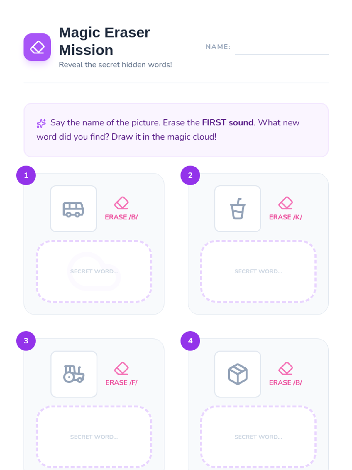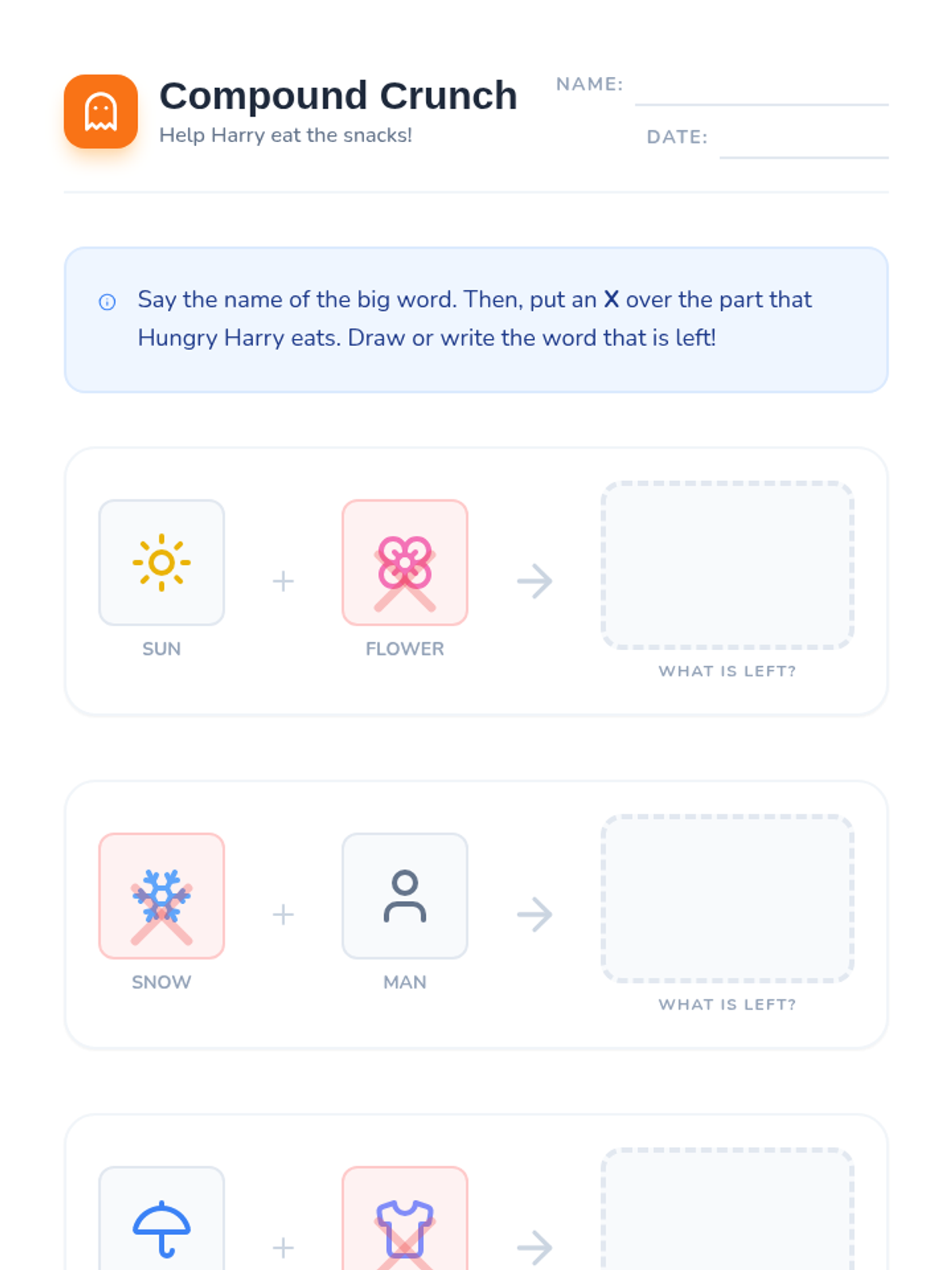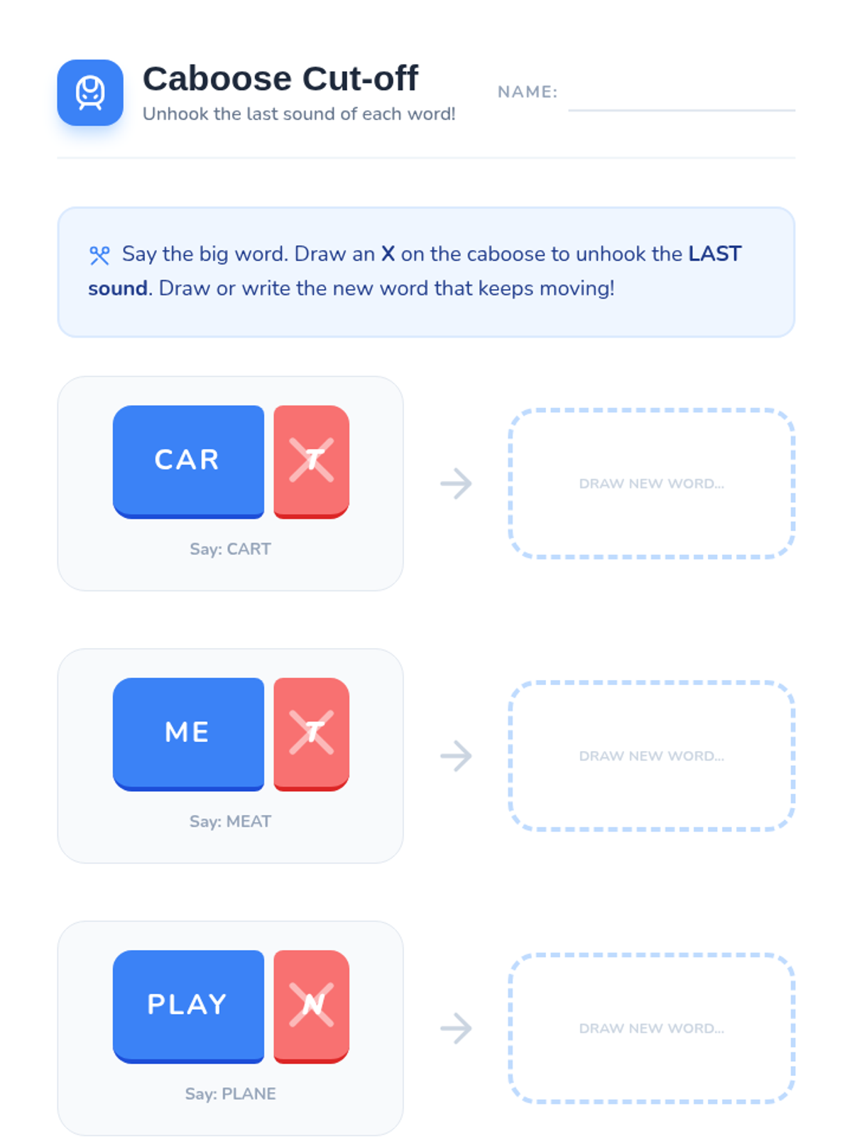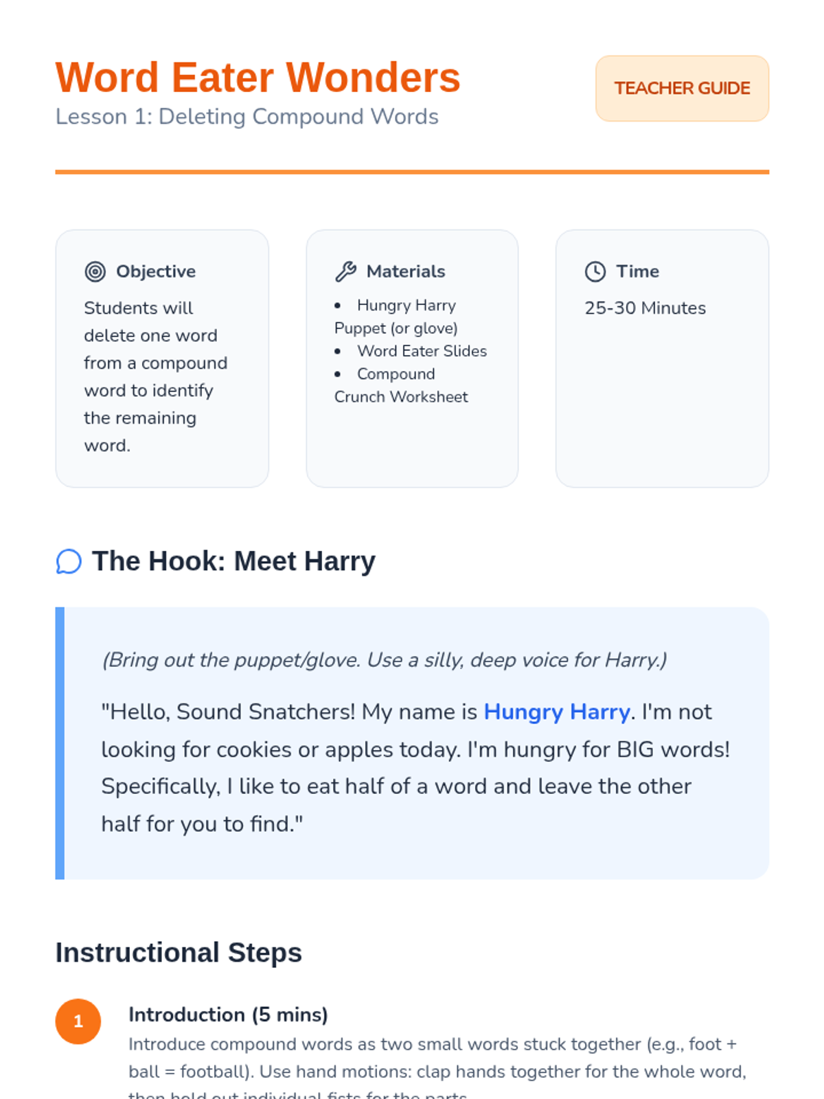 A Kindergarten phonics sequence focusing on phoneme deletion, moving from compound words to initial and final phonemes. Students use kinesthetic and visual cues to understand how words change when sounds are removed.