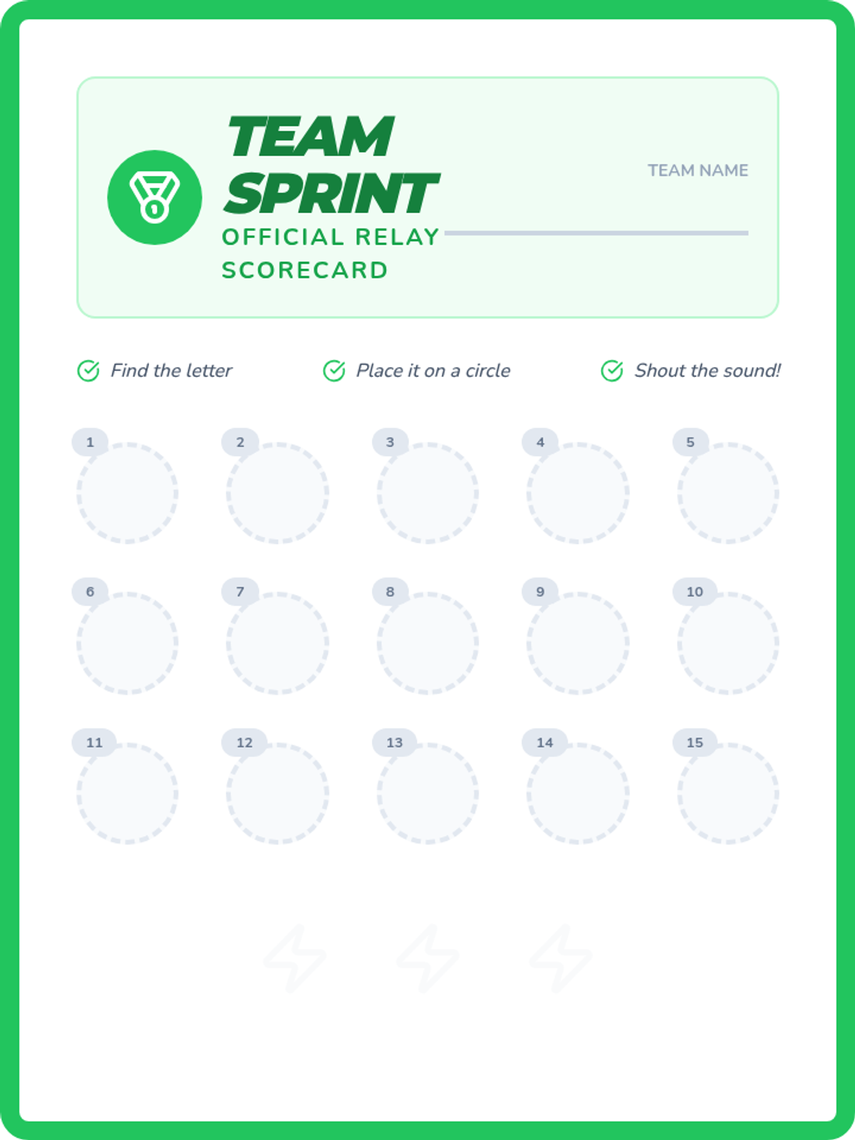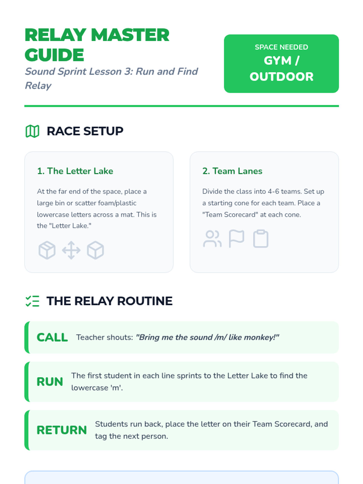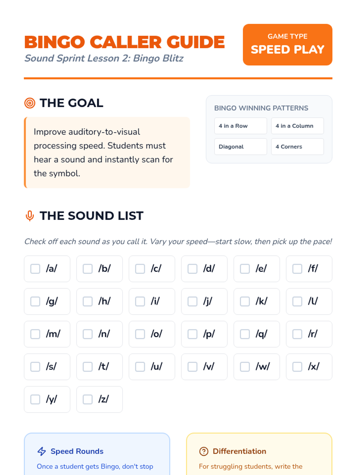 A gamified sequence for 1st grade students to build automaticity and speed in lowercase letter-sound recognition through drills, bingo, physical relays, and visual puzzles.