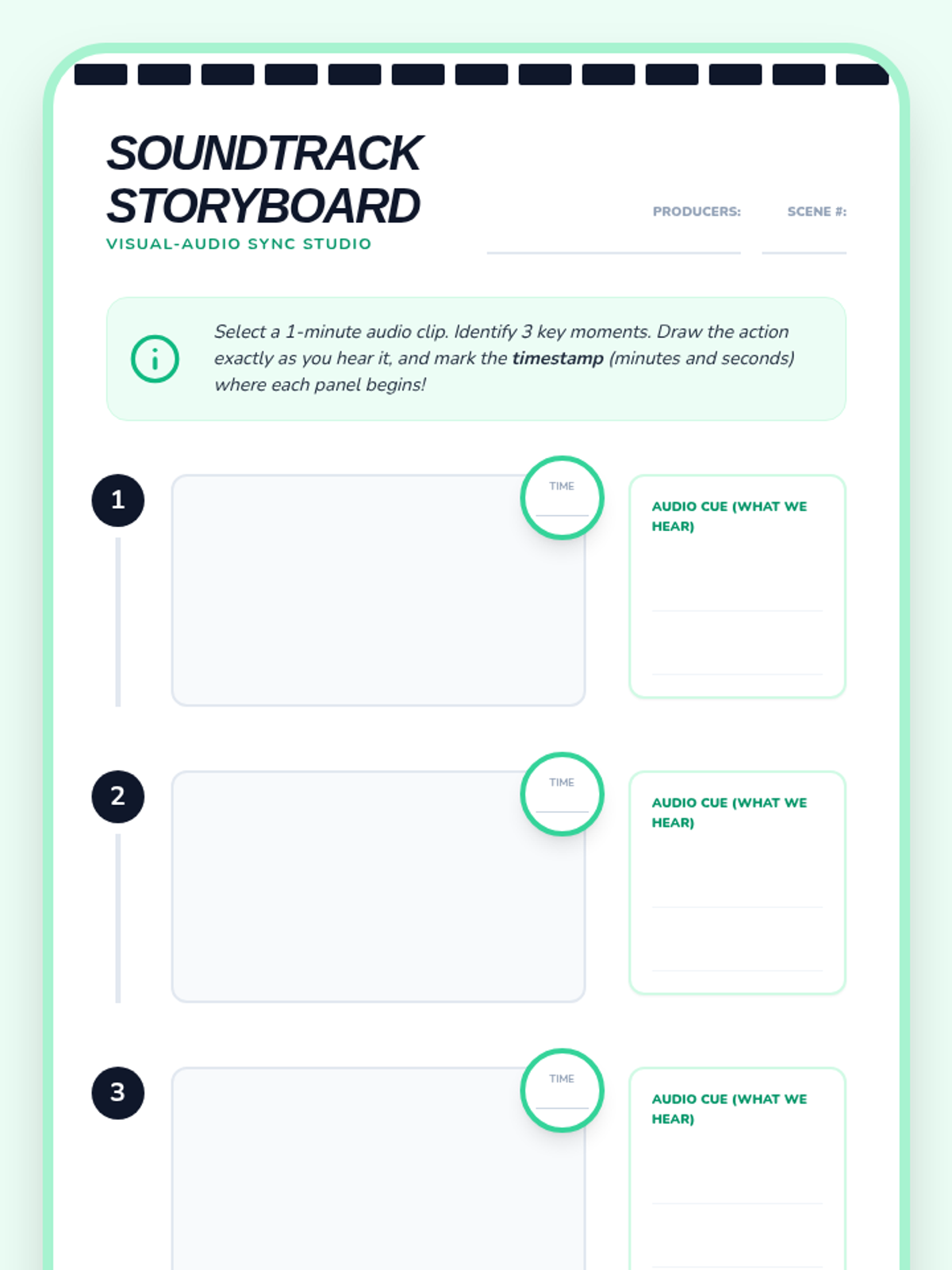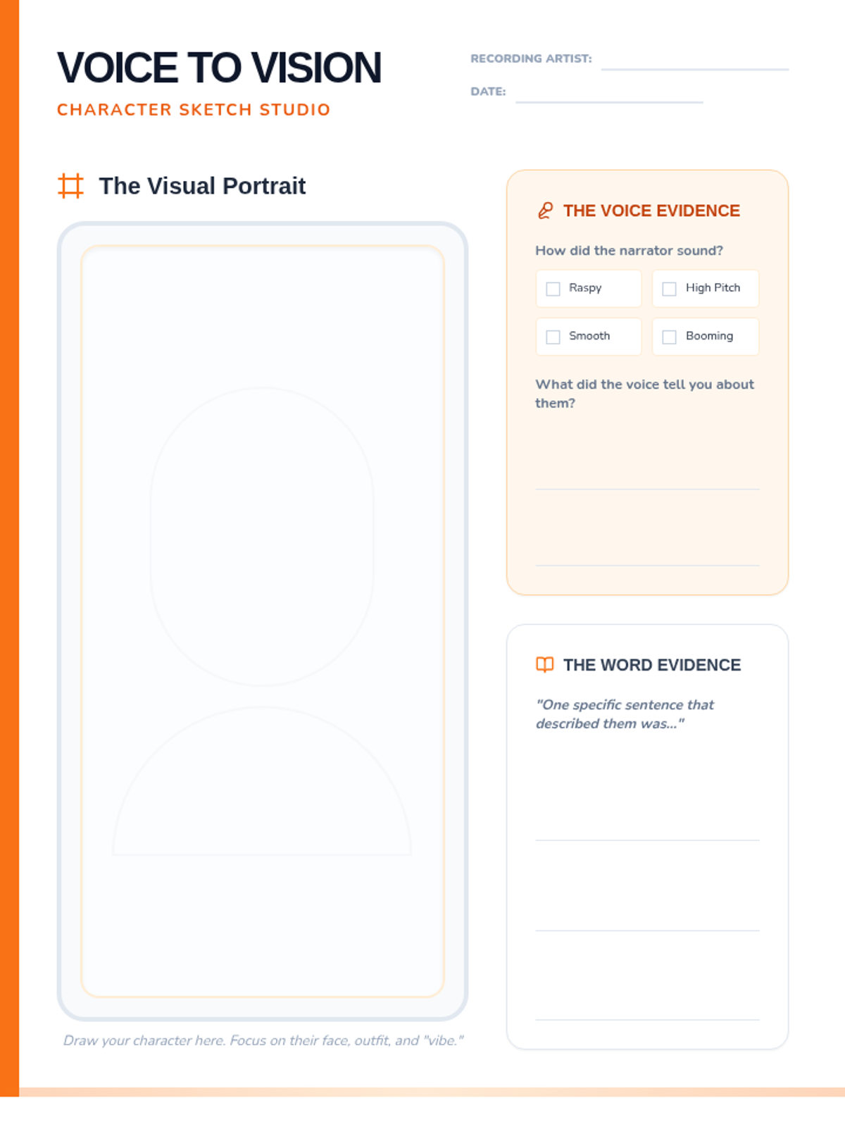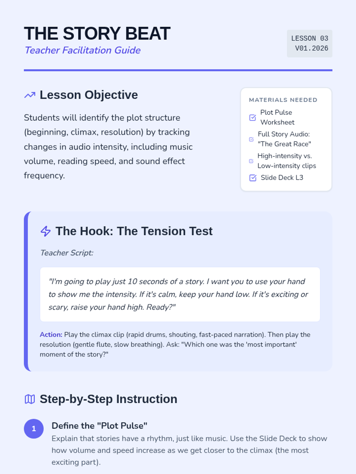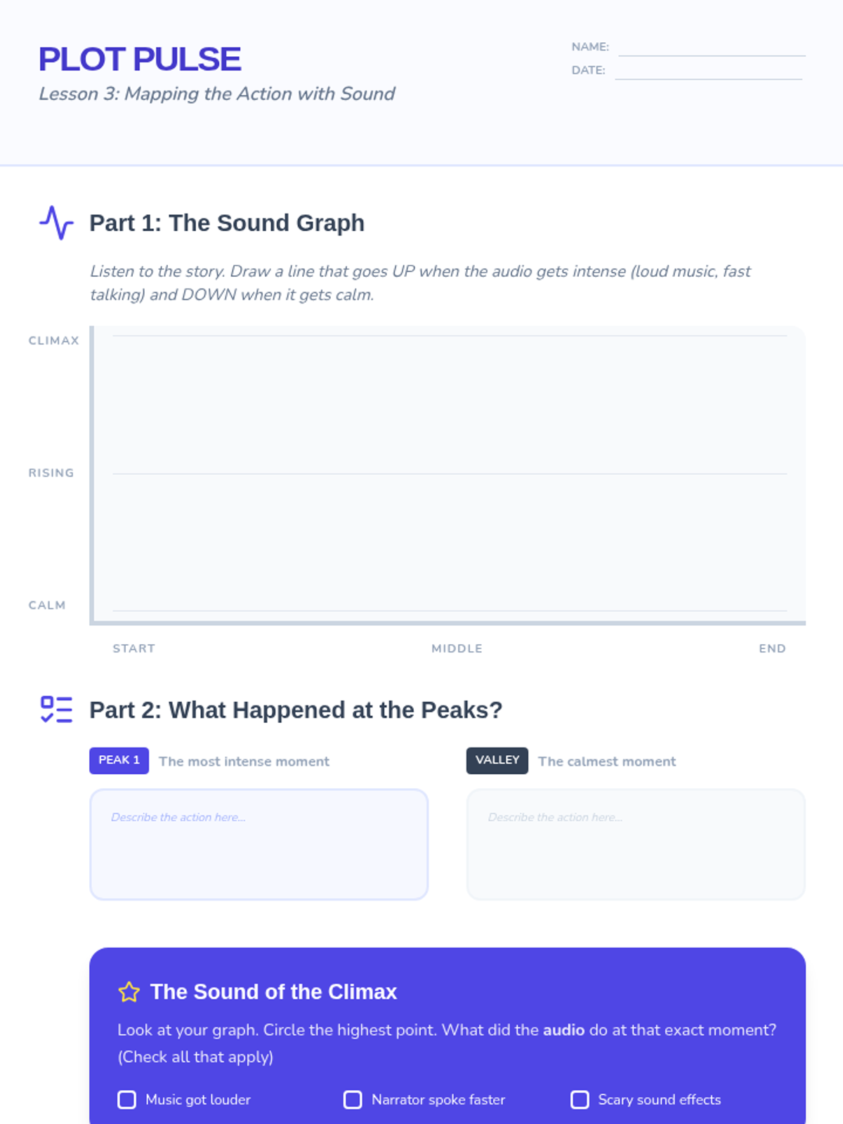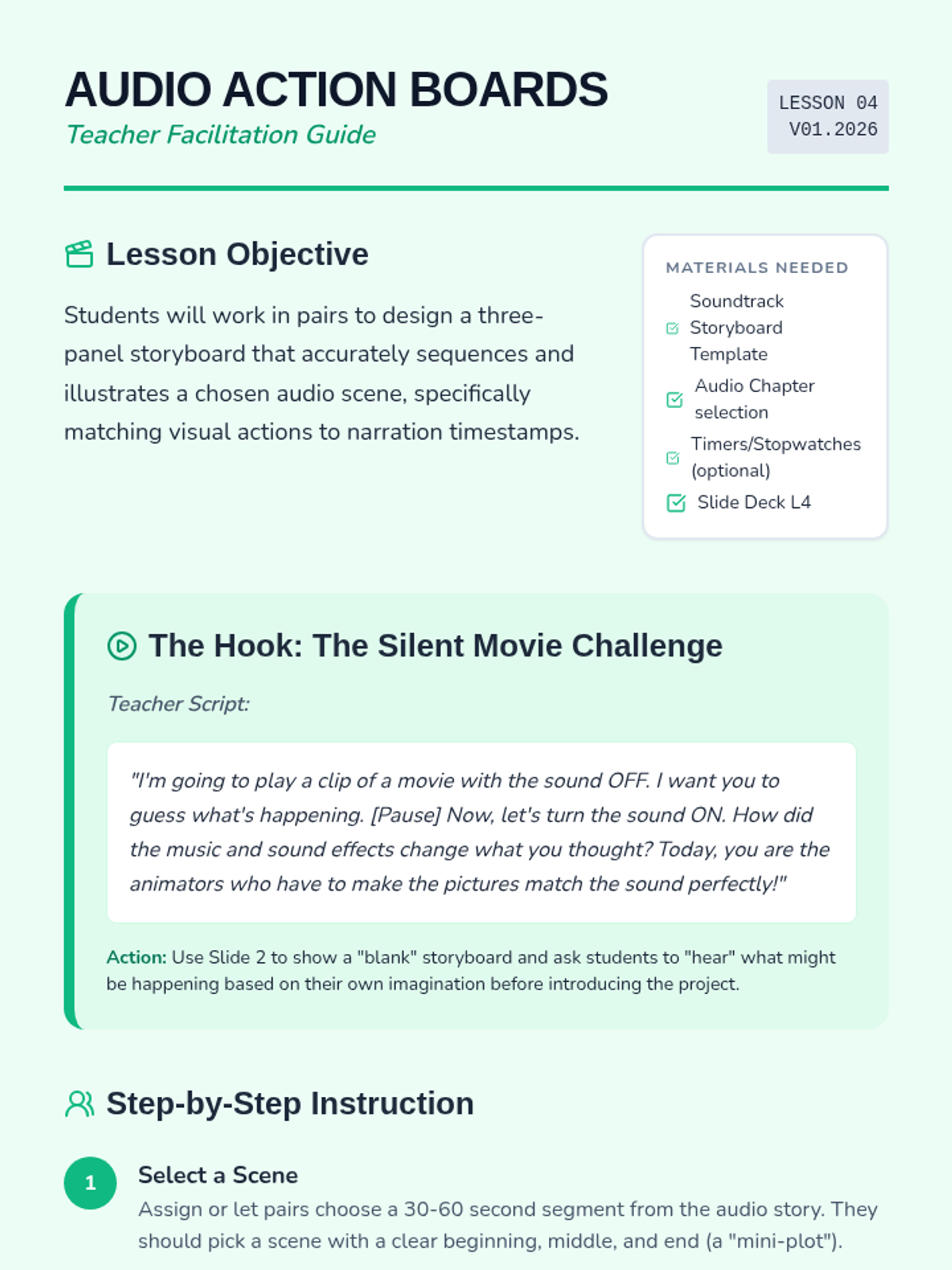 A project-based sequence where 3rd-grade students use auditory cues from read-along texts to strengthen their visualization and story mapping skills. Students progress from sketching settings and characters to creating a full storyboard synchronized with audio narration.